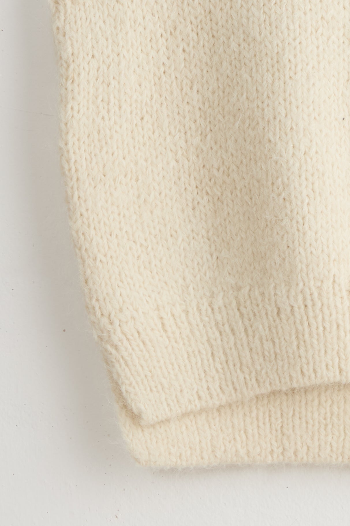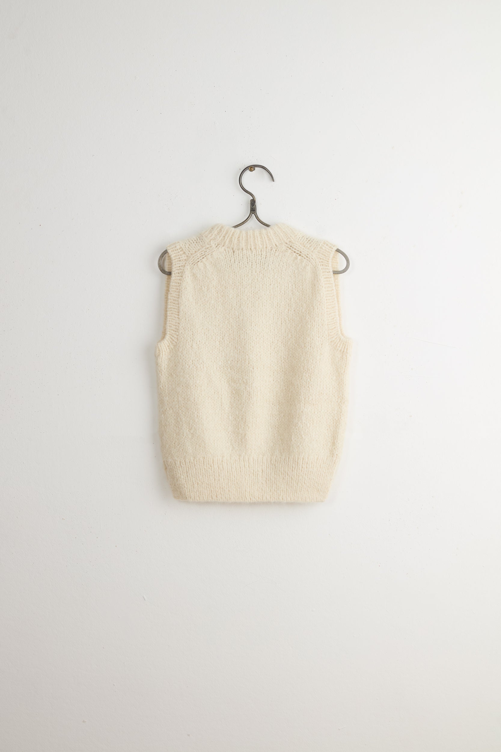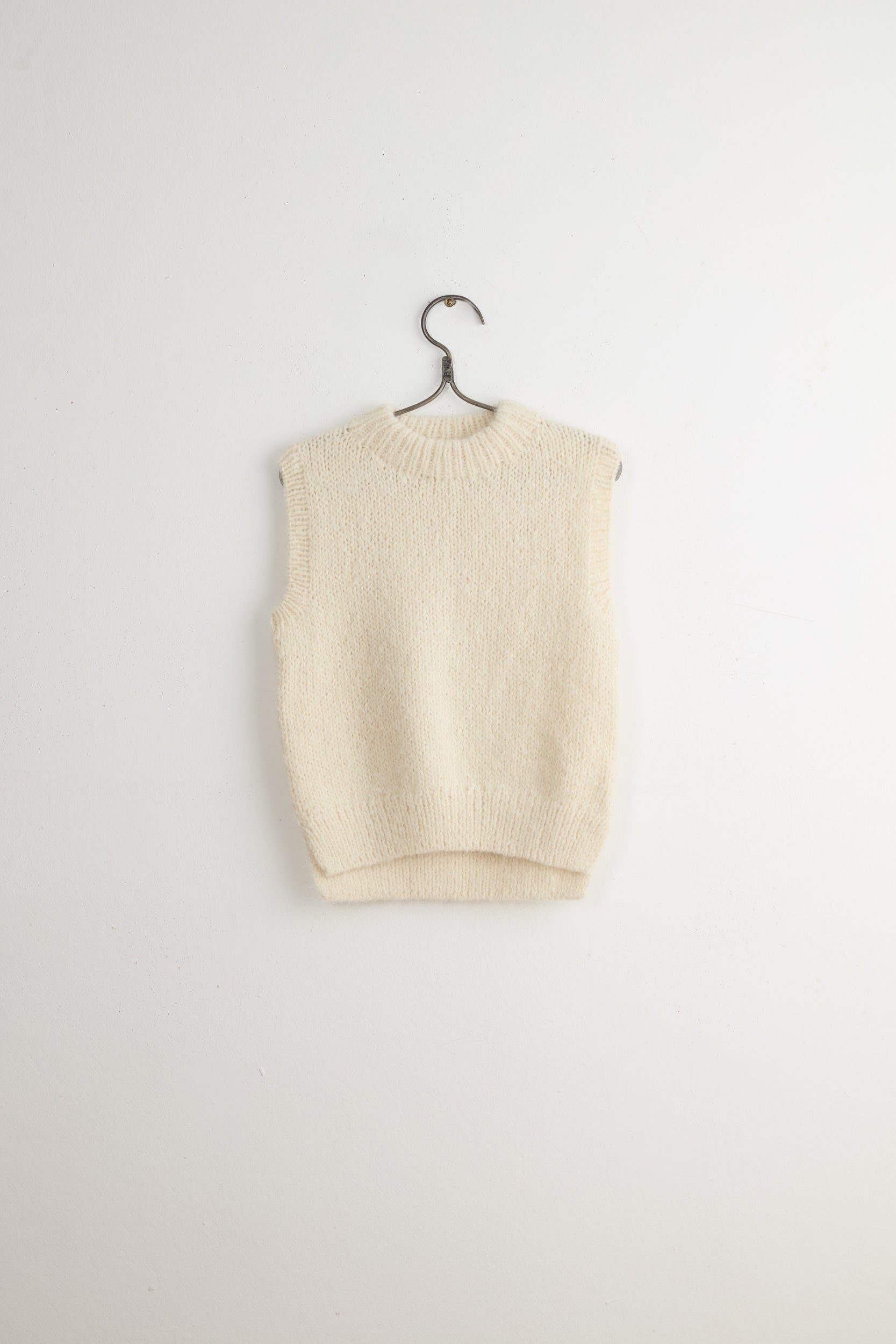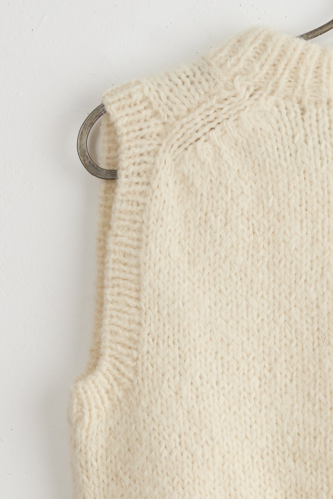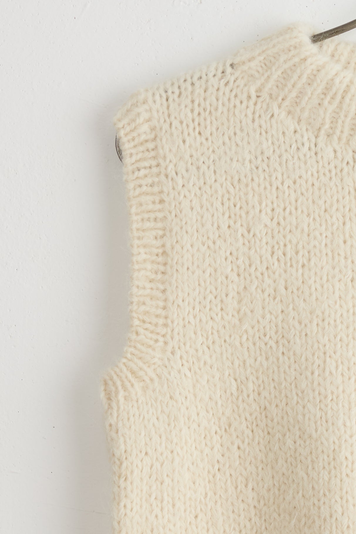 Suri Peru vest by Ichi antiquites. Hand knitted sleeveless vest made from a hand spun wool and Suri alpaca blend. Fluffy and soft with a regular fit. Ribbed mock neck and arm openings. Small side slits. Perfect piece for layering.