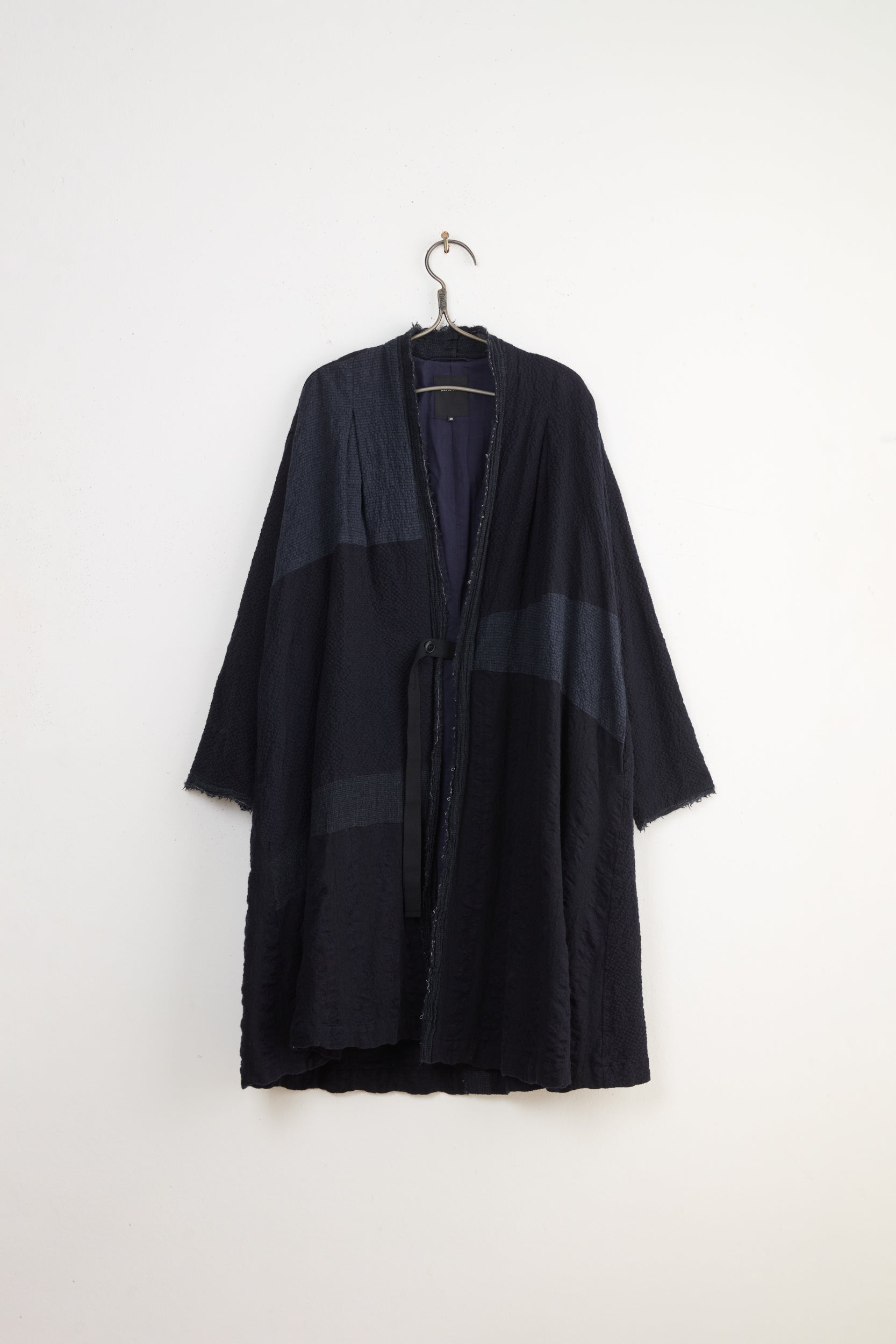 Coat by Japanese brand Pas De Calais. A unisex patchwork coat constructed out of several types of textured wool and cotton materials. Flared, robe like silhouette with side seam pockets, adjustable one button closure, symmetrical gatheres at front yoke and raw finish. Light and soft cotton lining. Made in Japan.