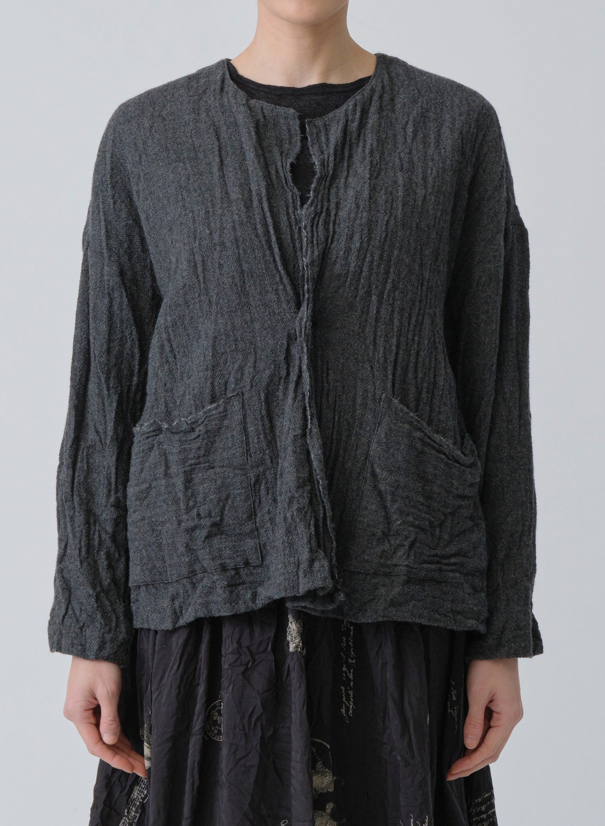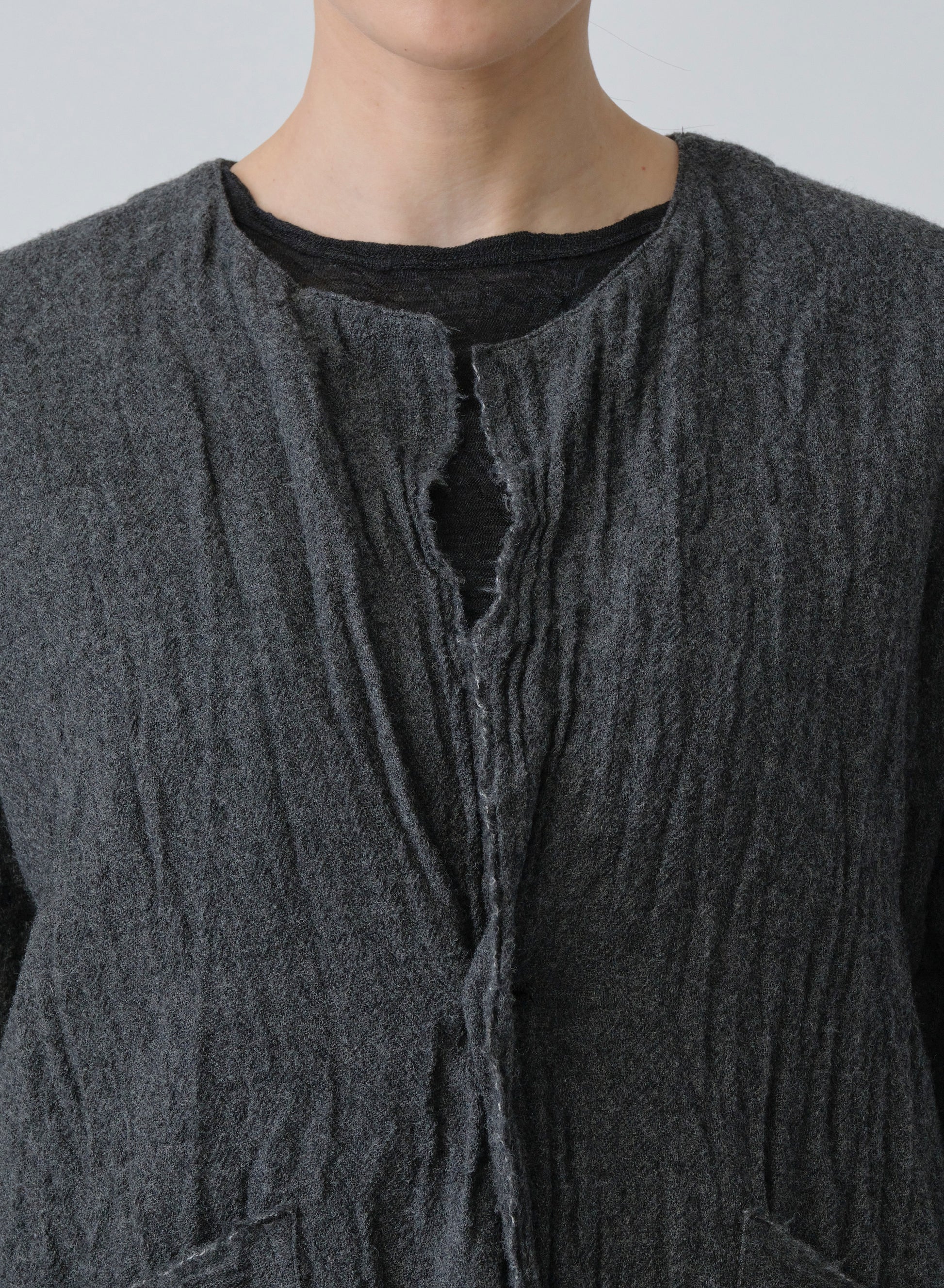 RW cardi jacket by Japanese brand Pas De Calais. A textured cardigan jacket made from crinkled merino wool woven with loose gauze to give it a bit of puffiness. Regular fit with a classic crewneck, one button closure, two front pockets and a rew finish.