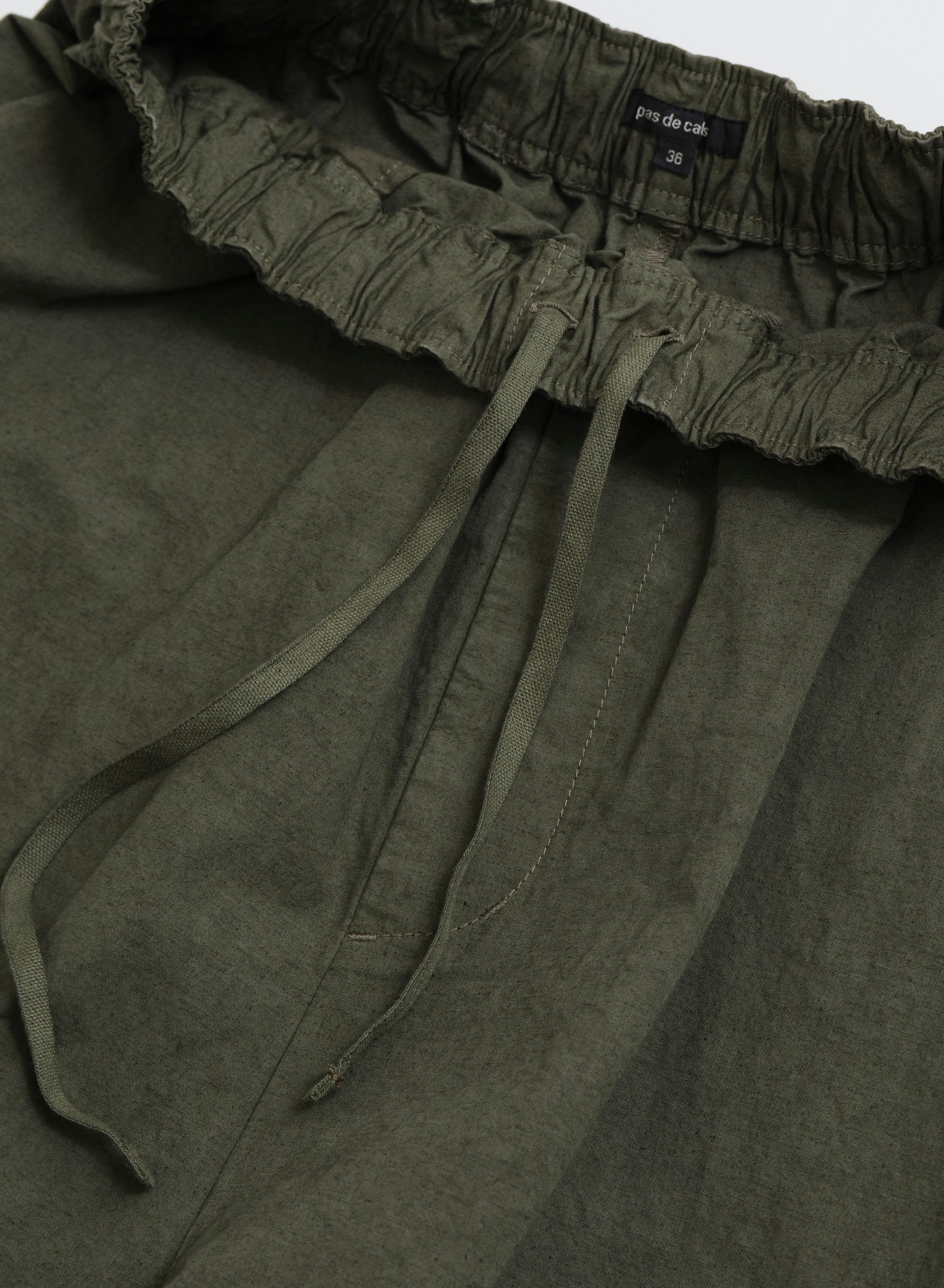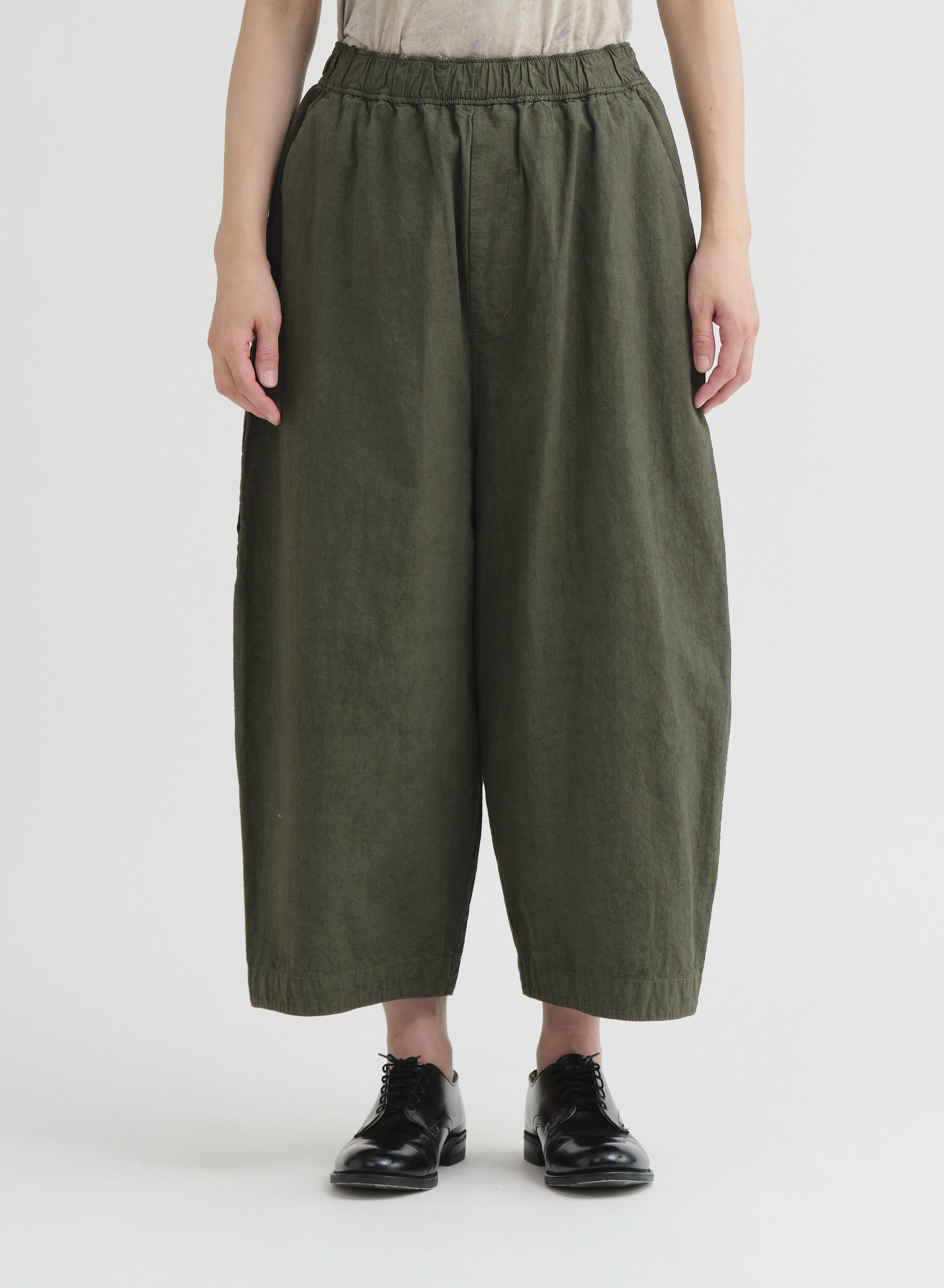 C\H wide pants by Japanese brand Pas De Calais. Cropped wide legged trousers made from a lightweight cotton hemp blend that has a wrinkled texture. Rounded, oversized fit with elastic waist, mock fly, side seam pockets and one back patch pocket.