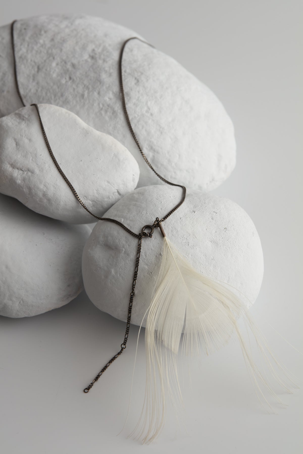 Peacock long necklace by Ann Demeulemeester. White peacock feather on a long oxidized silver curb chain.