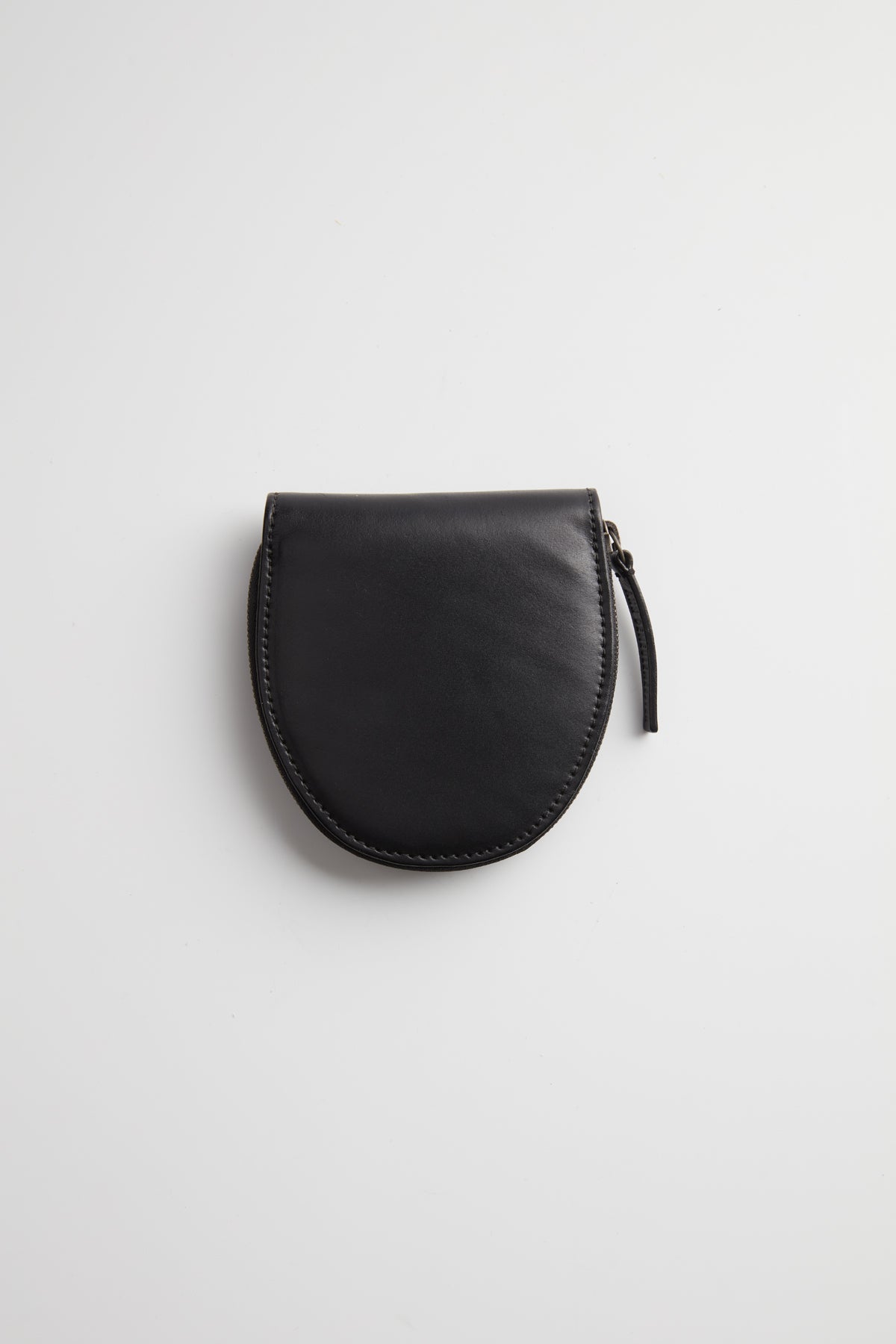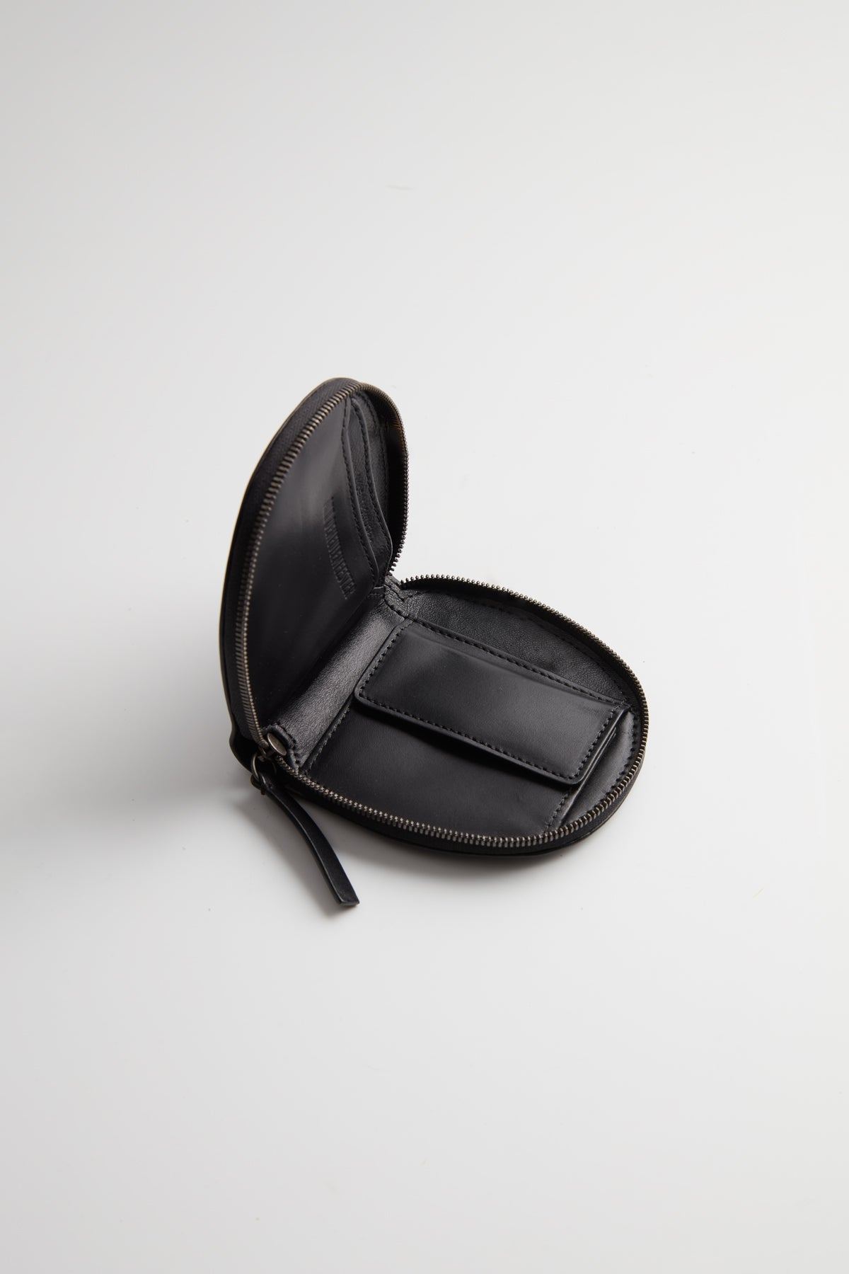 Round leather wallet by Ann Demeulemeester. Buffed leather wallet in black. zip closure and coin compartment on the interior.