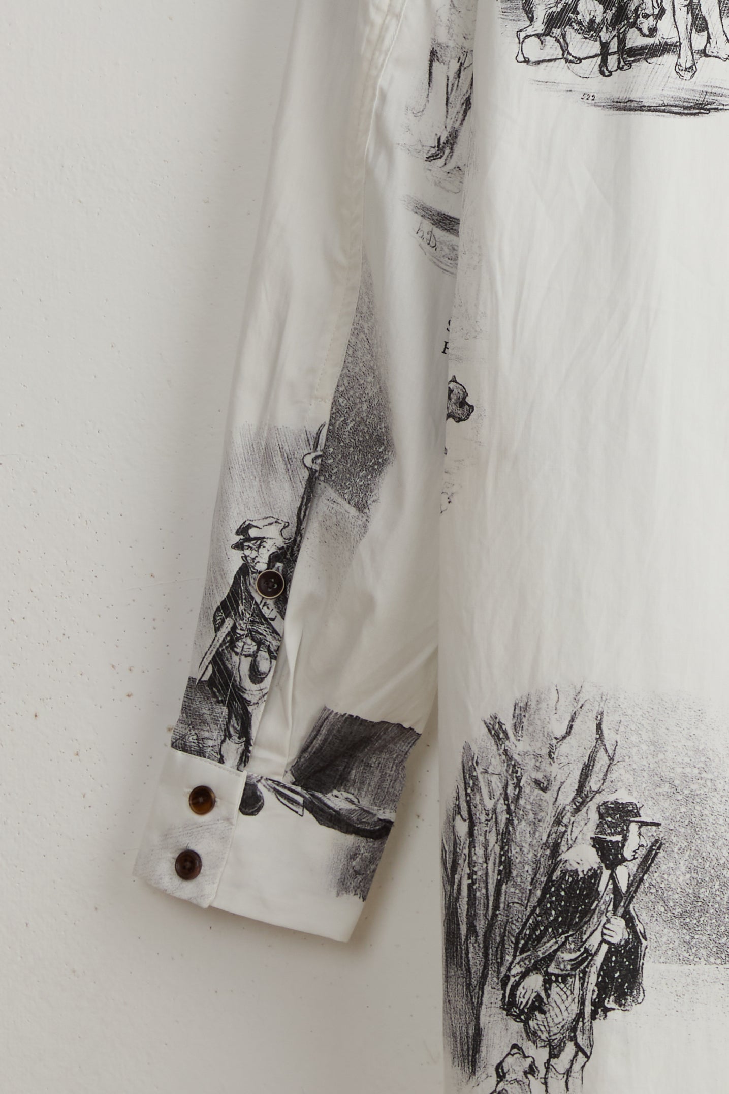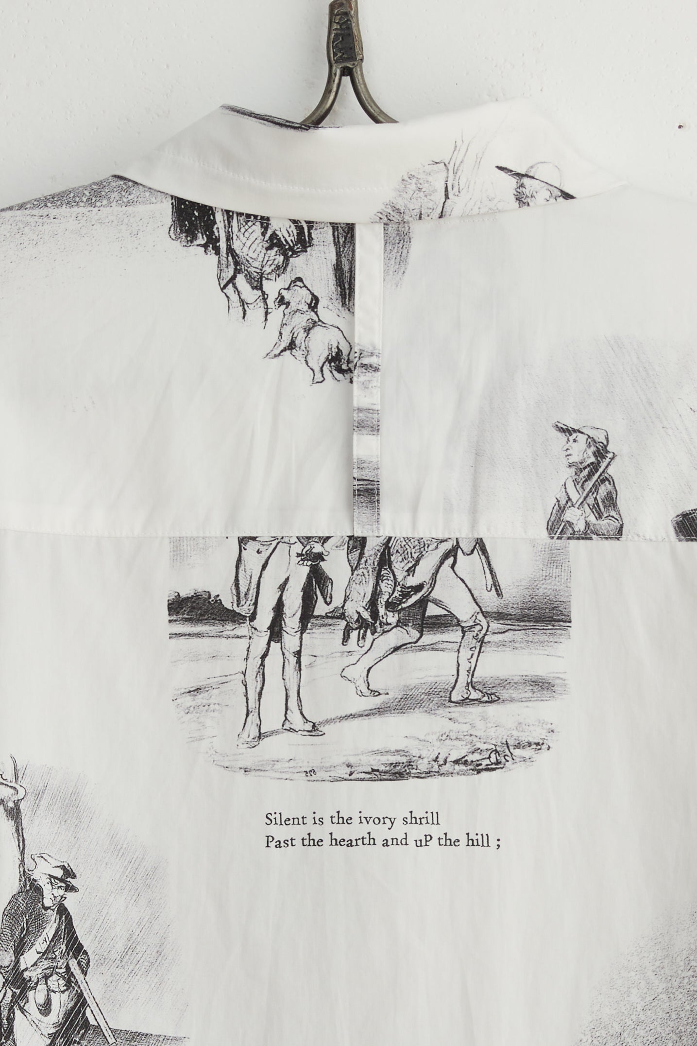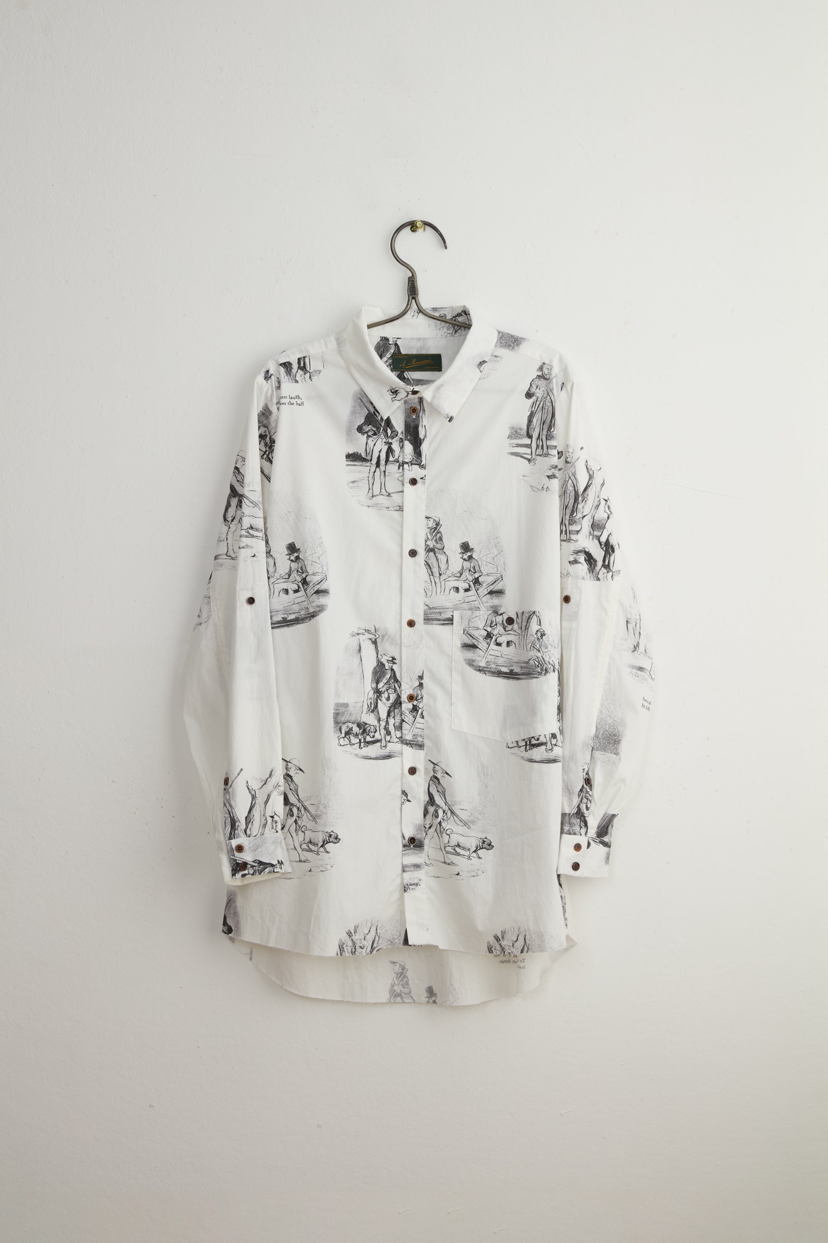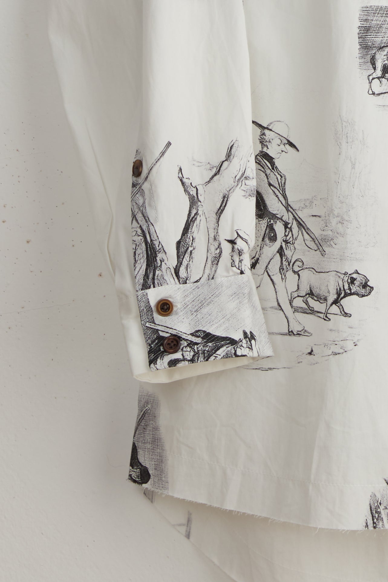 Shirt with hunter by Aleksandr Manamïs. A long collared shirt made from soft cotton with an historic hunting print. Details include a point collar, left side low patch pocket with single button fastening, full length button cuff sleeves and raw hems. The front hems are straight and the rear hem curved and longer.