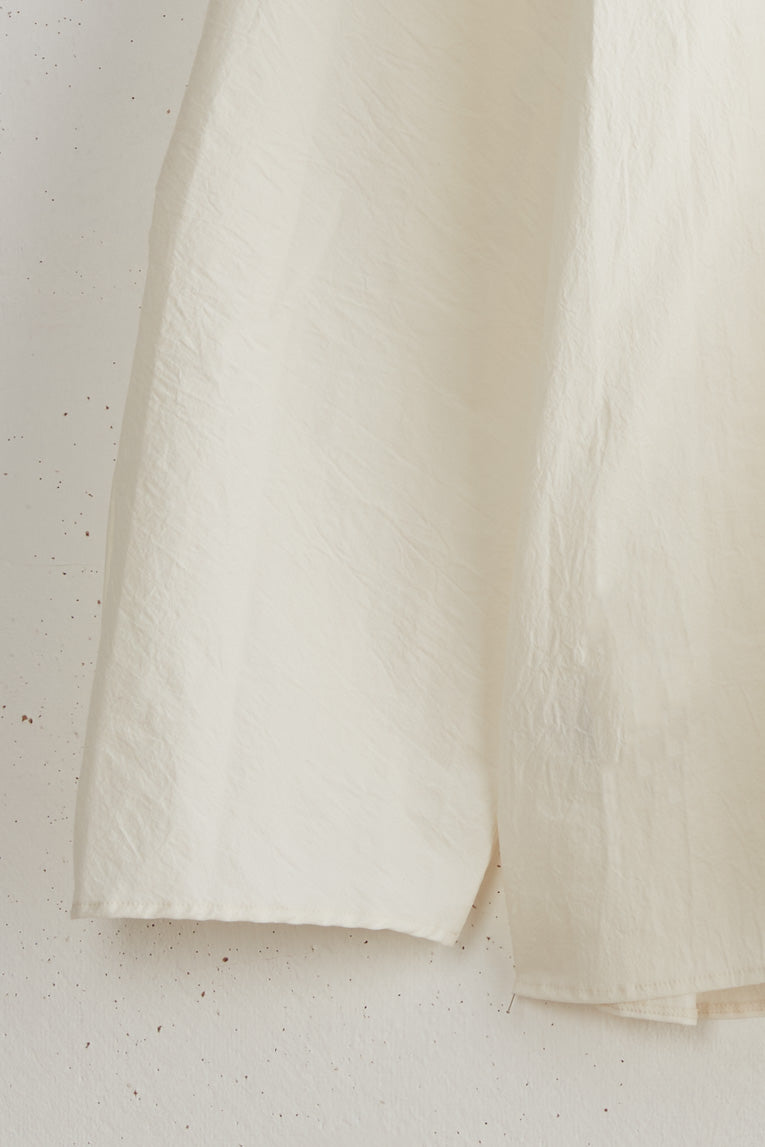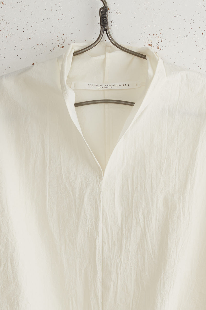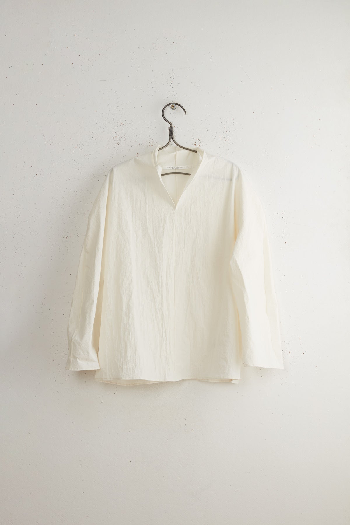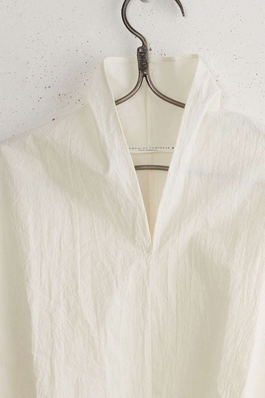 Wrinkled Kimono Shirt by Album Di Famiglia. A light pullover shirt made of stretch washed cotton. The unique, slightly firm fabric has a matte texture and a wrinkled finish. The collar is designed to resemble a Japanese kimono. oversized and has a loose silhouette, yet remains delicate add feminine. Can be worn with the matching wrinkled pants.
