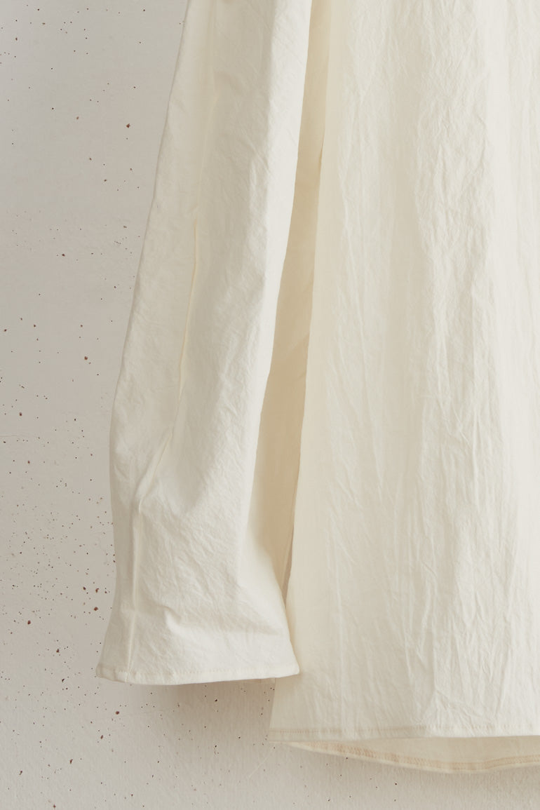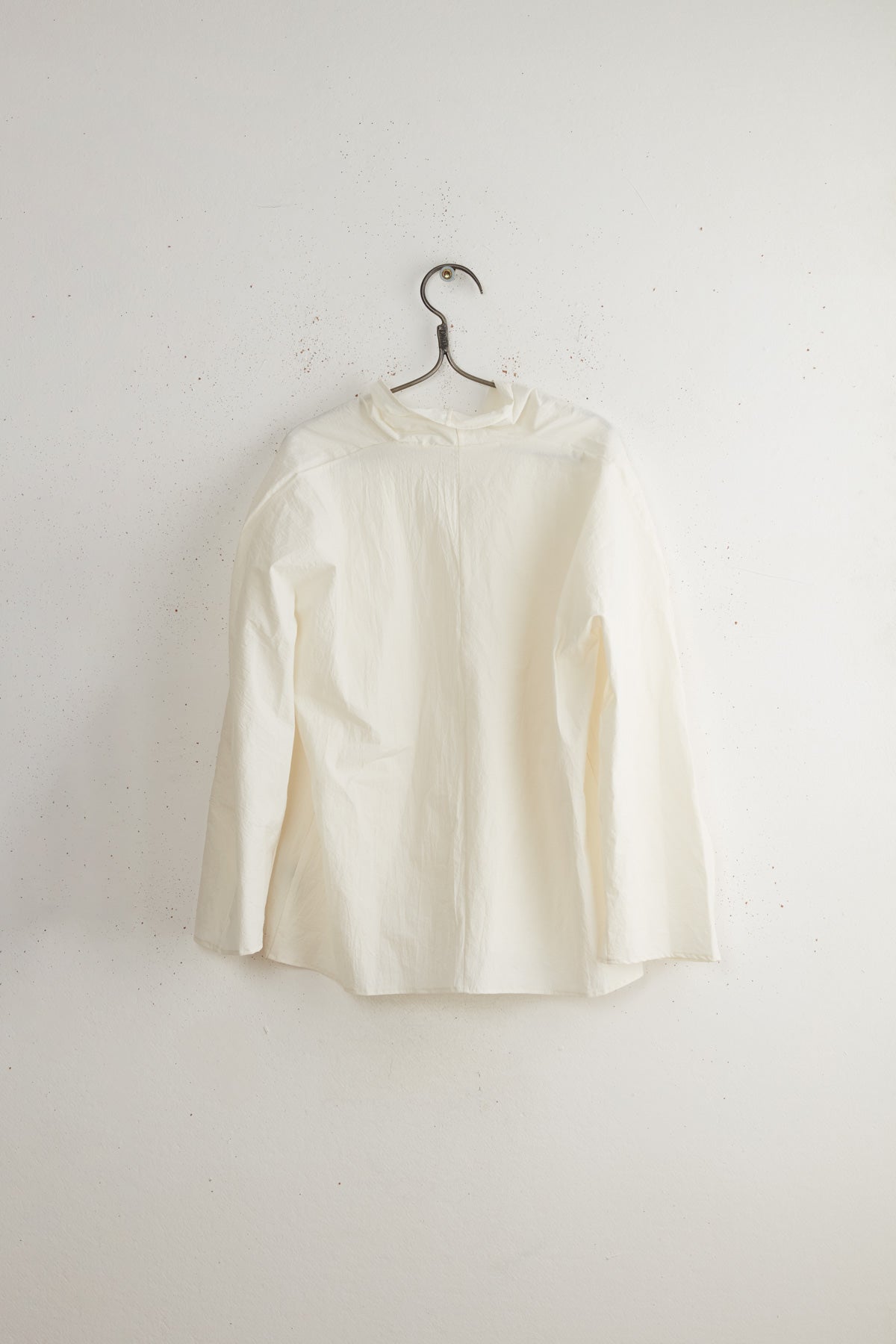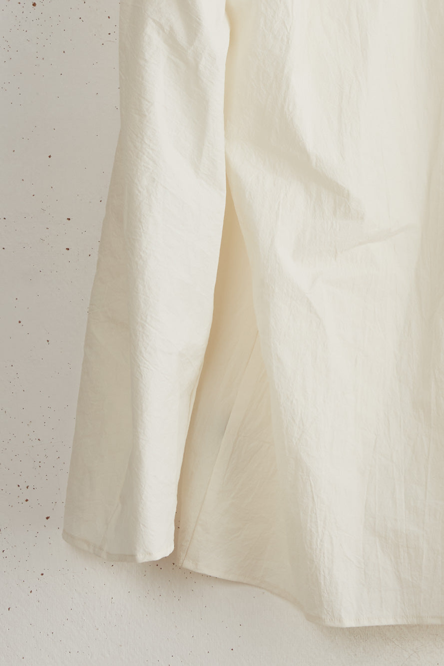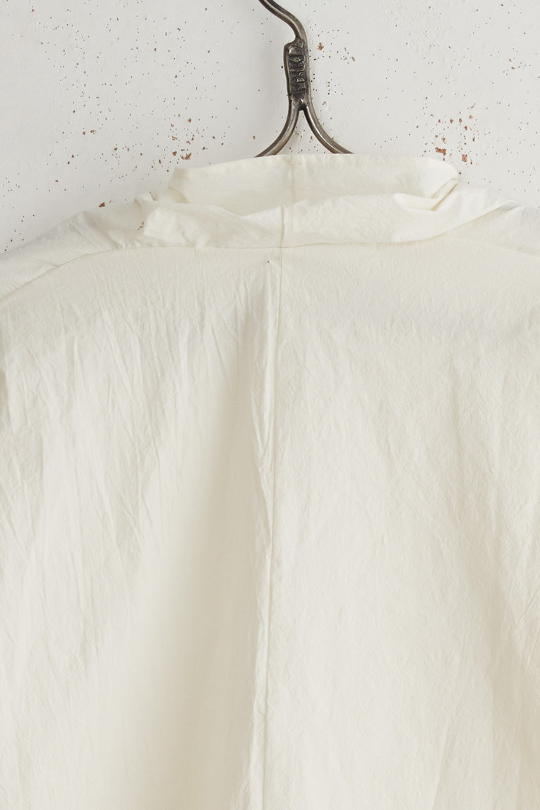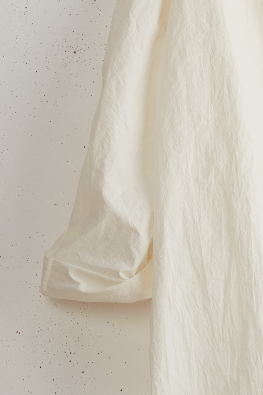 Wrinkled Kimono Shirt by Album Di Famiglia. A light pullover shirt made of stretch washed cotton. The unique, slightly firm fabric has a matte texture and a wrinkled finish. The collar is designed to resemble a Japanese kimono. oversized and has a loose silhouette, yet remains delicate add feminine. Can be worn with the matching wrinkled pants.