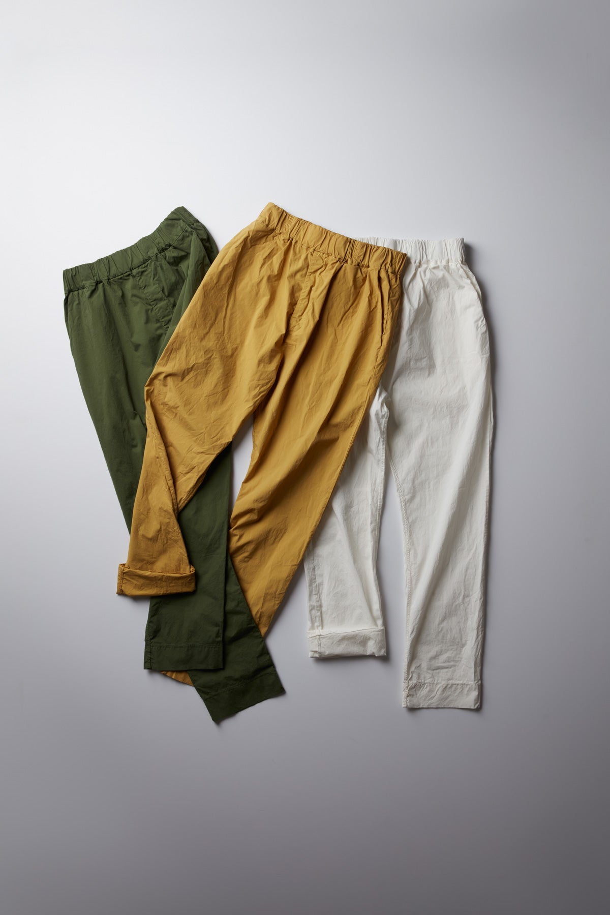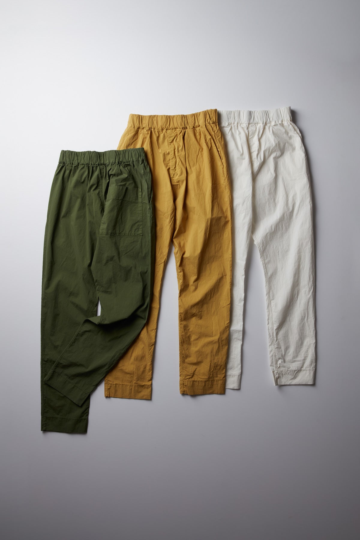 Slim TS Trousers by Album Di Famiglia. Slim-cut trousers made of a crisp light cotton. Wide elastic waistband, false fly, slash side pockets and one back patch pocket.