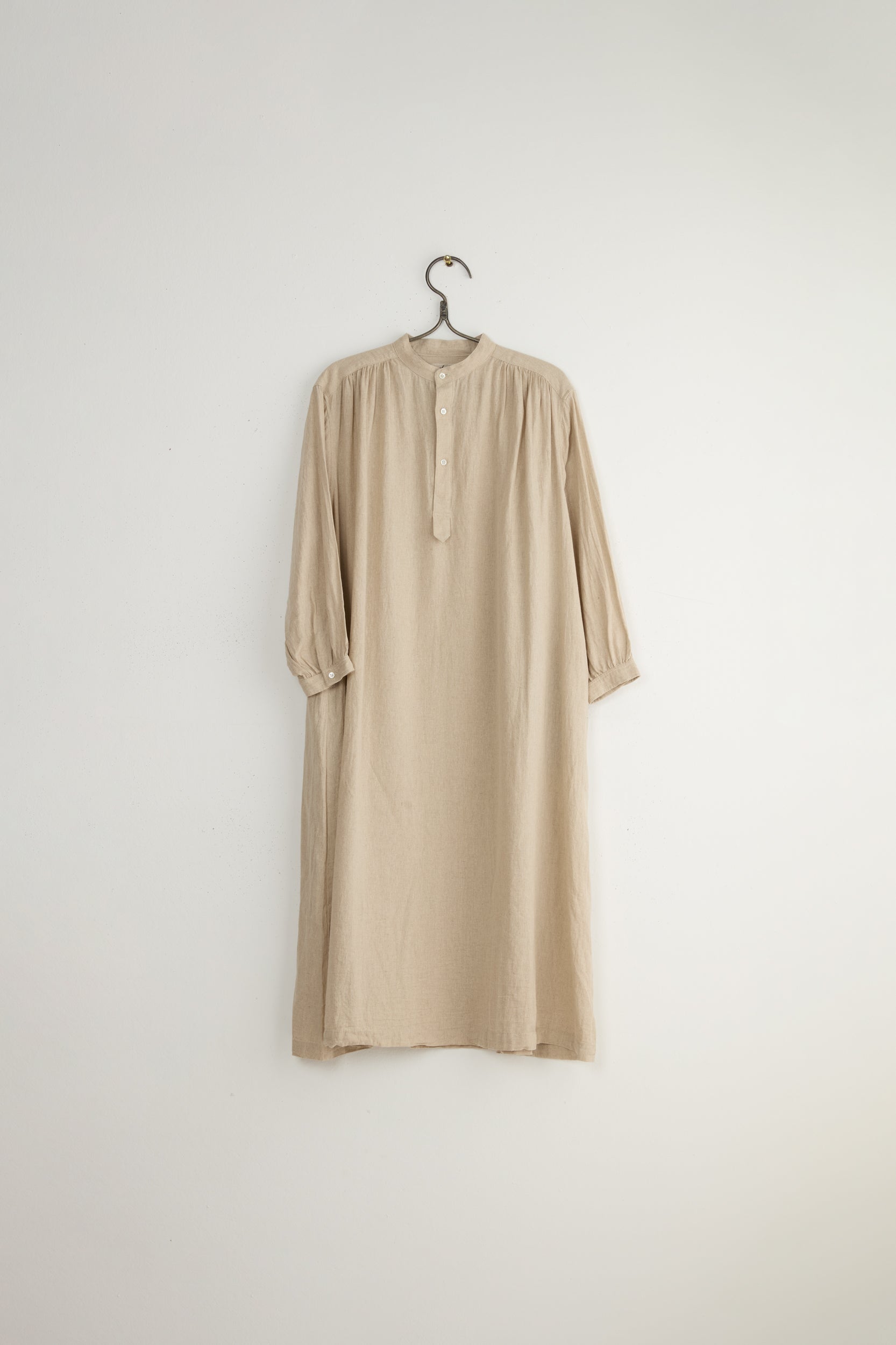 L C Dress by Ichi Antiquités. A mid-length shirt dress in a light-weight linen cotton blend. A long, relaxed silhouette with a henley collar, cuffed gathered sleeves, side seam pockets and gentle gathers on the front and back yoke.