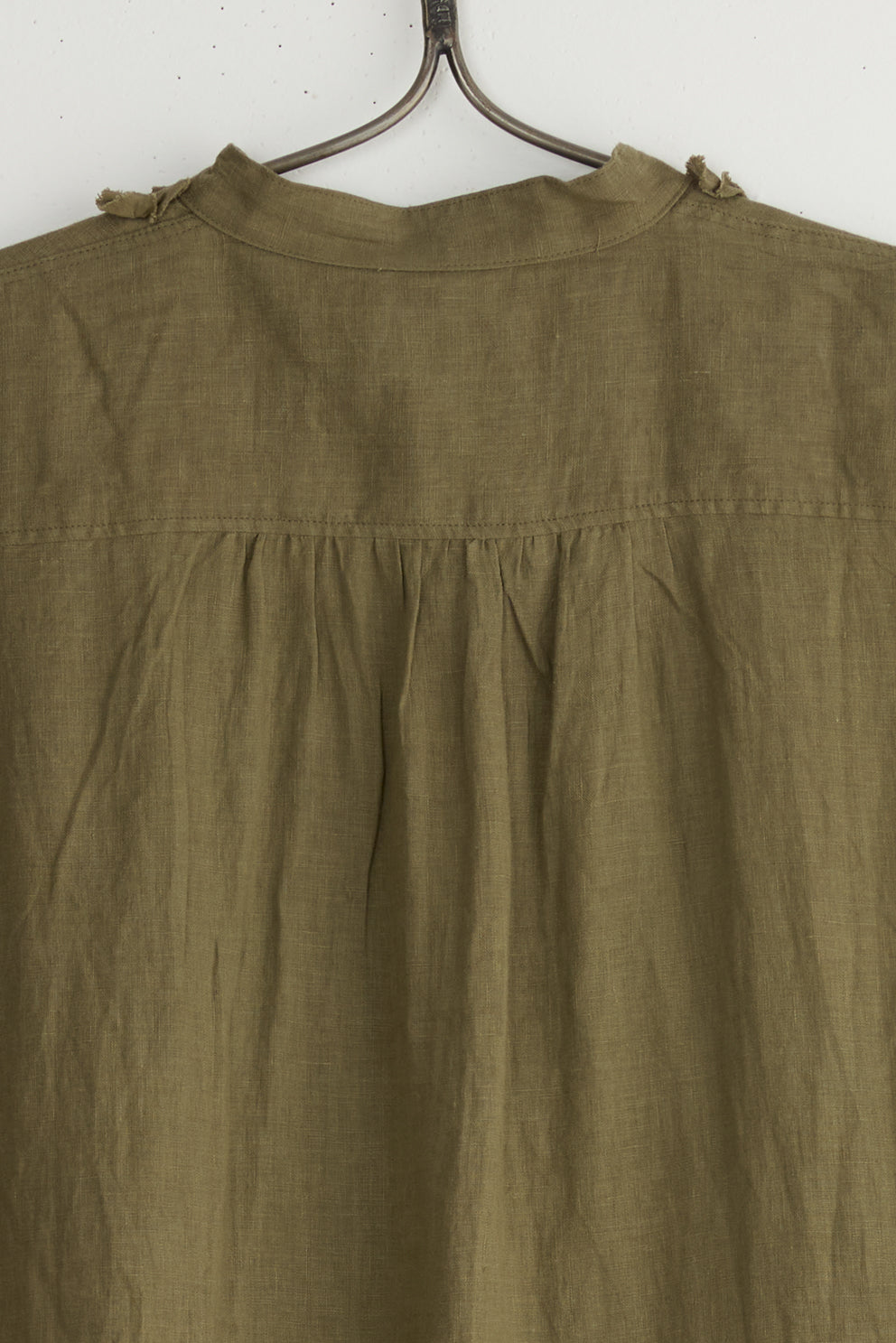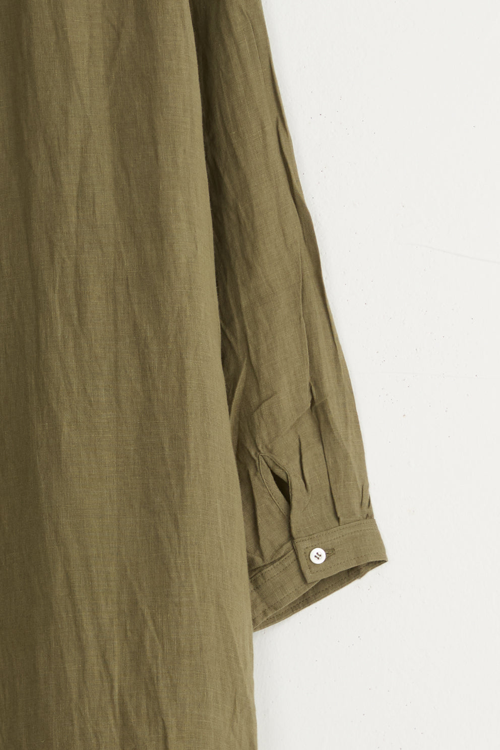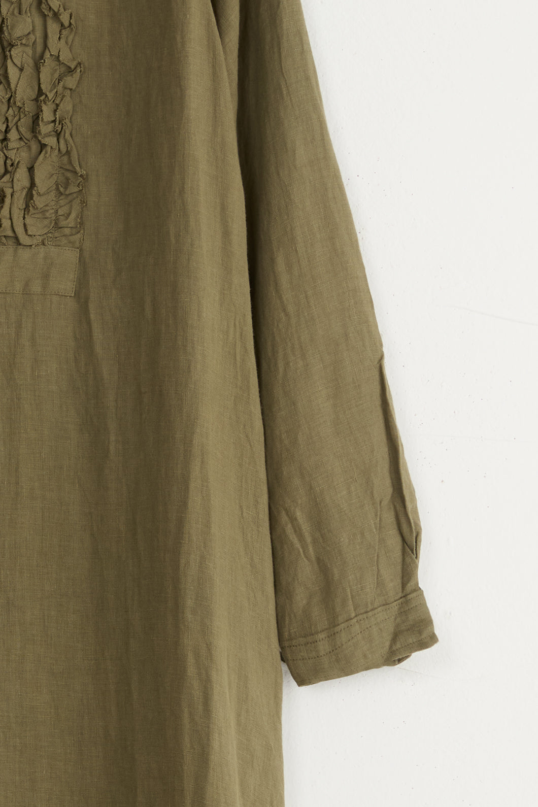 French ruffle Dress by Ichi Antiquités. A mid-length shirt dress in a crisp French linen. A long, relaxed silhouette with a band collar, long cuffed sleeves, side seam pockets and a ruffled front yoke.