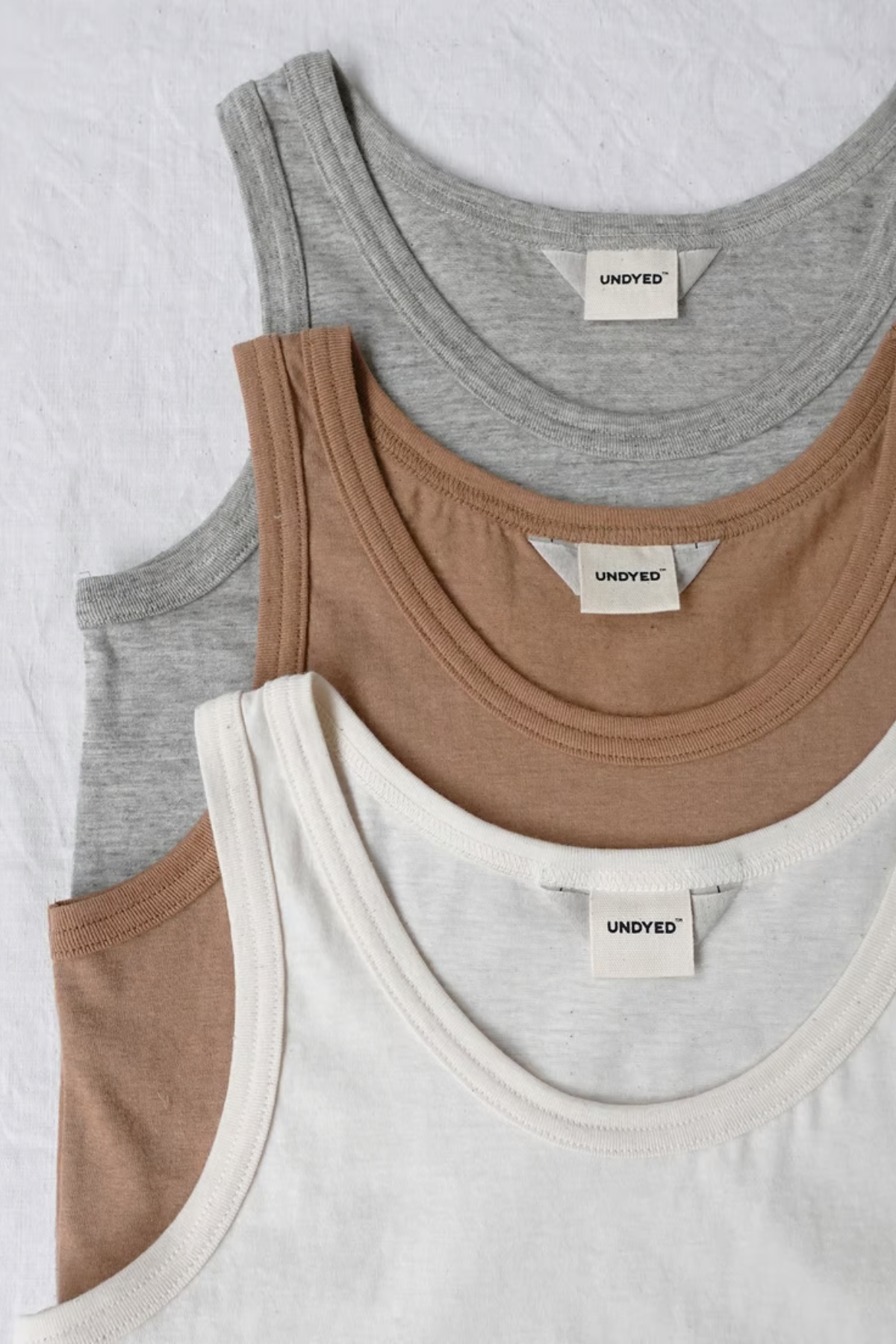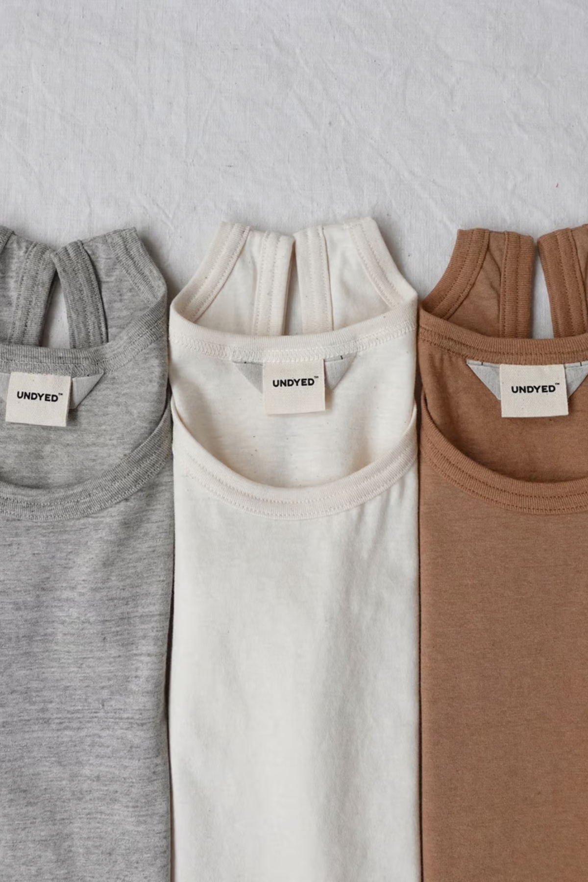 UNDYED tank top by Ichi Antiquités. This is a limited collection of UNDYED x Antiquités. A soft, basic tank top made with the colors of natural raw materials. regular fit with a round, slightly wide neckline designed especially for layering. Made from colored organic cotton created by California-born Sally Fox.