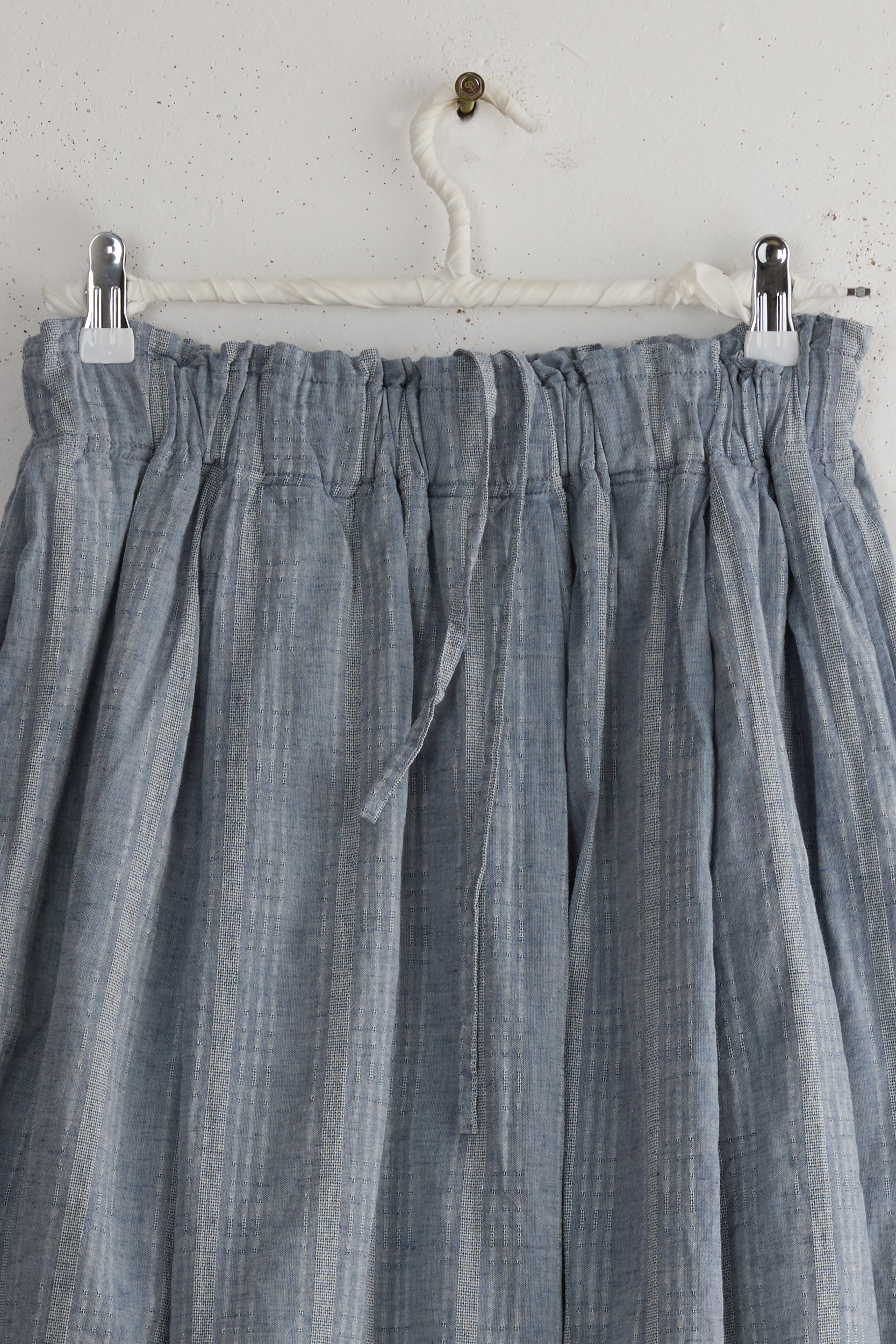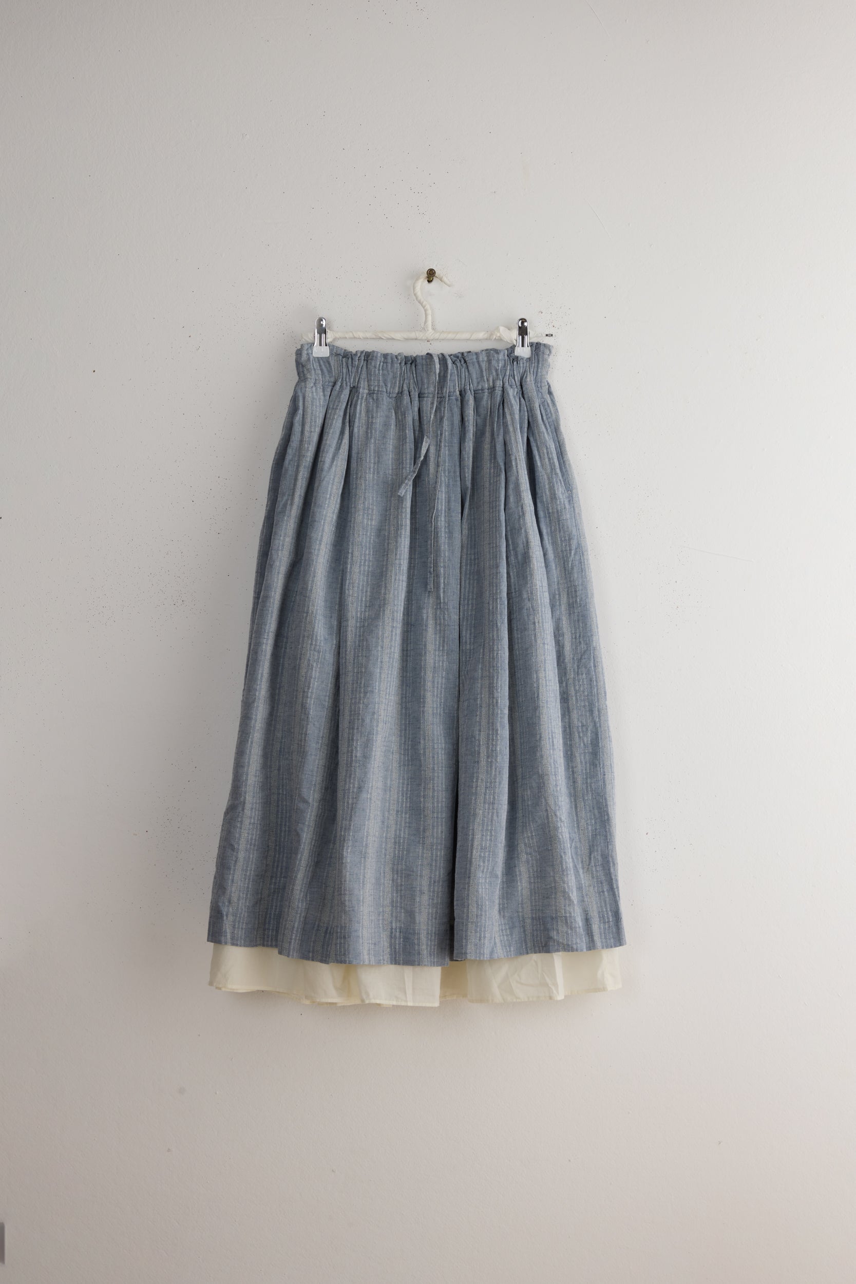 Dobby stripe Skirt by Ichi Antiquites. A long skirt in a striped linen and cotton fabric. Flared silhouette with a gathered elastic waist, side seam pockets and light-weight cotton lining longer then the bottom hem . Made In Japan.