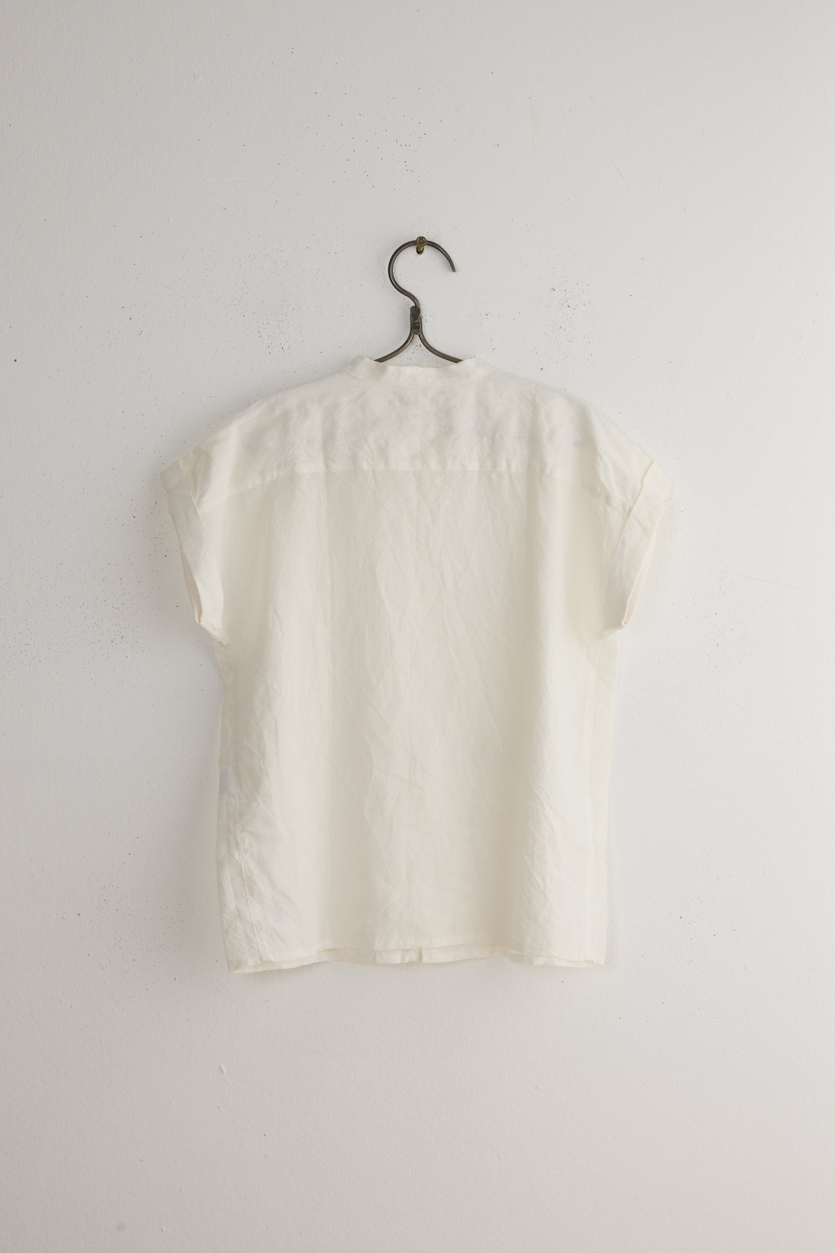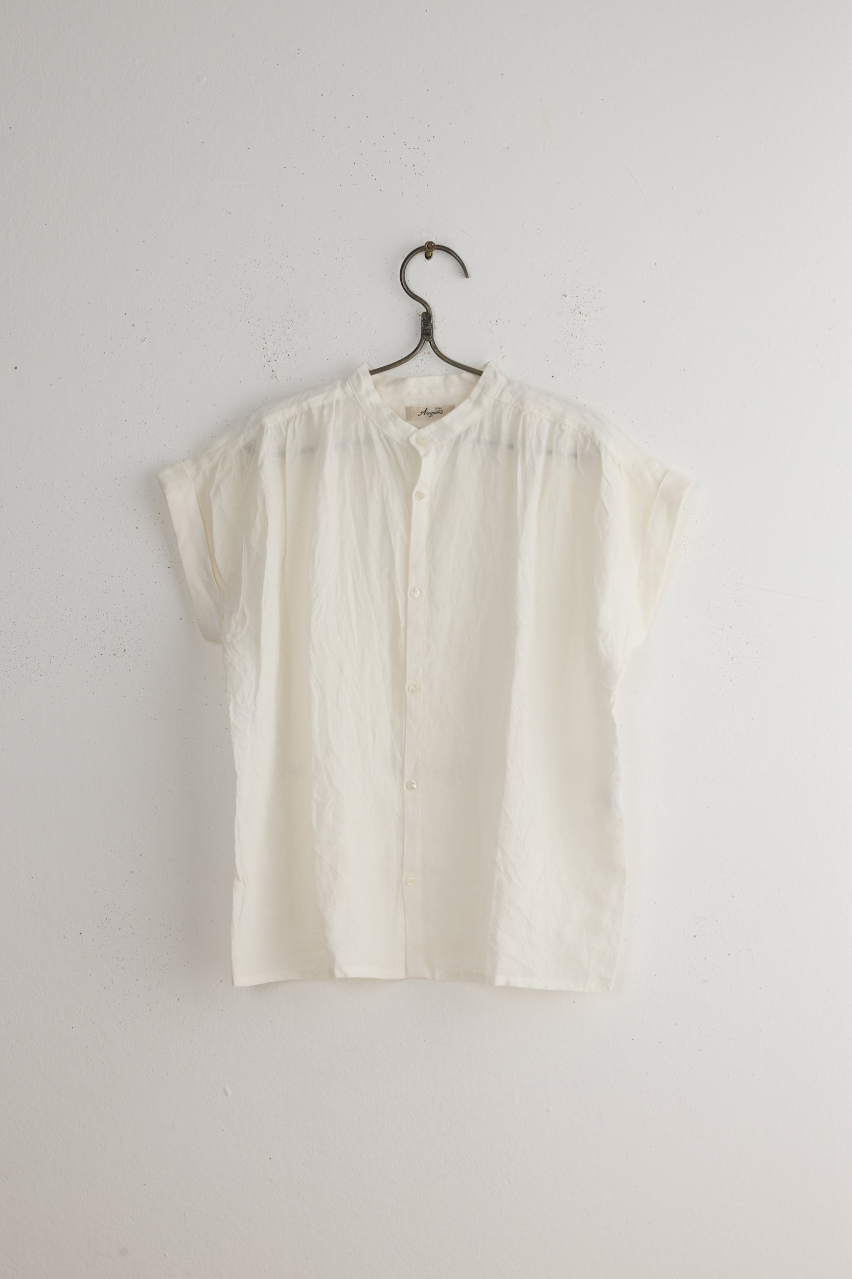 Dungaree blouse by Ichi Antiquités. A stand collar button down shirt made in a textured, lightweight linen dungaree. regular fit with cuffed short sleeves, gathering at the shoulders and a straight hem. Made in Vietnam. Measurements: Bust 116, Length 63.5, sleeve 24 cm.