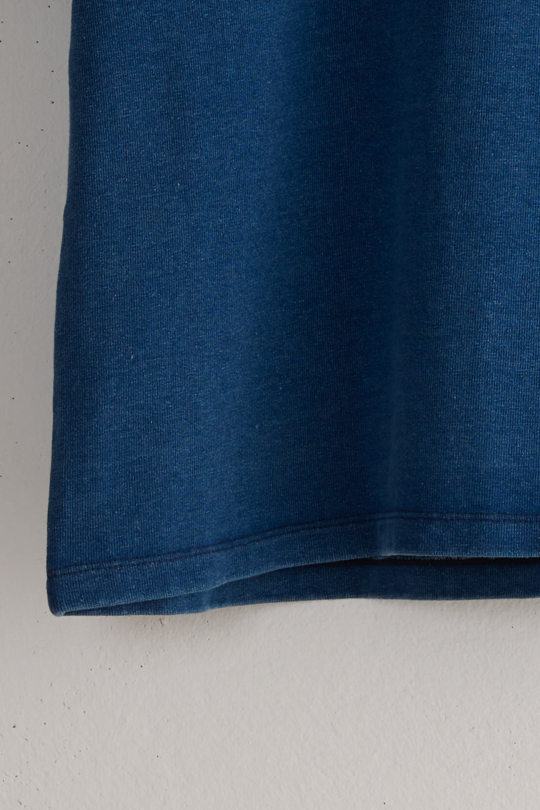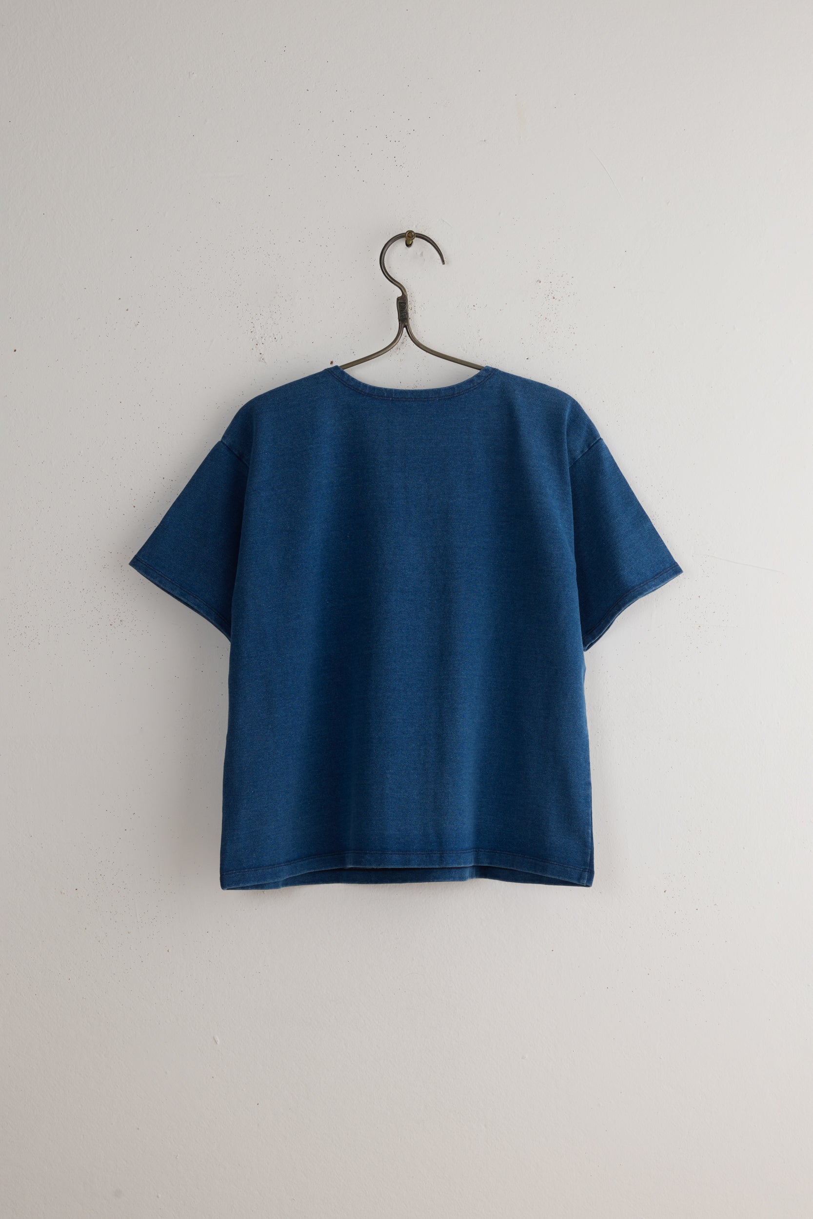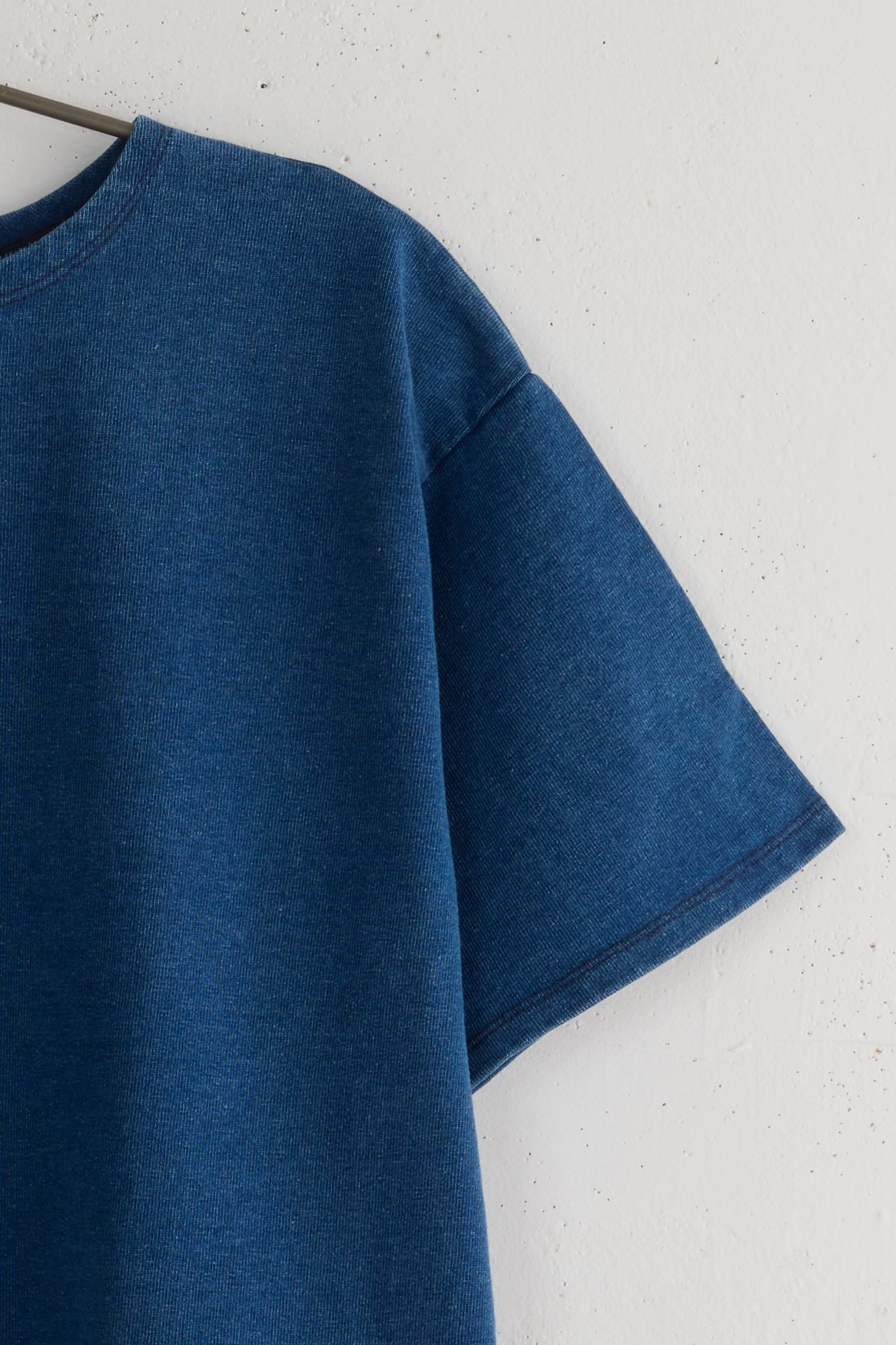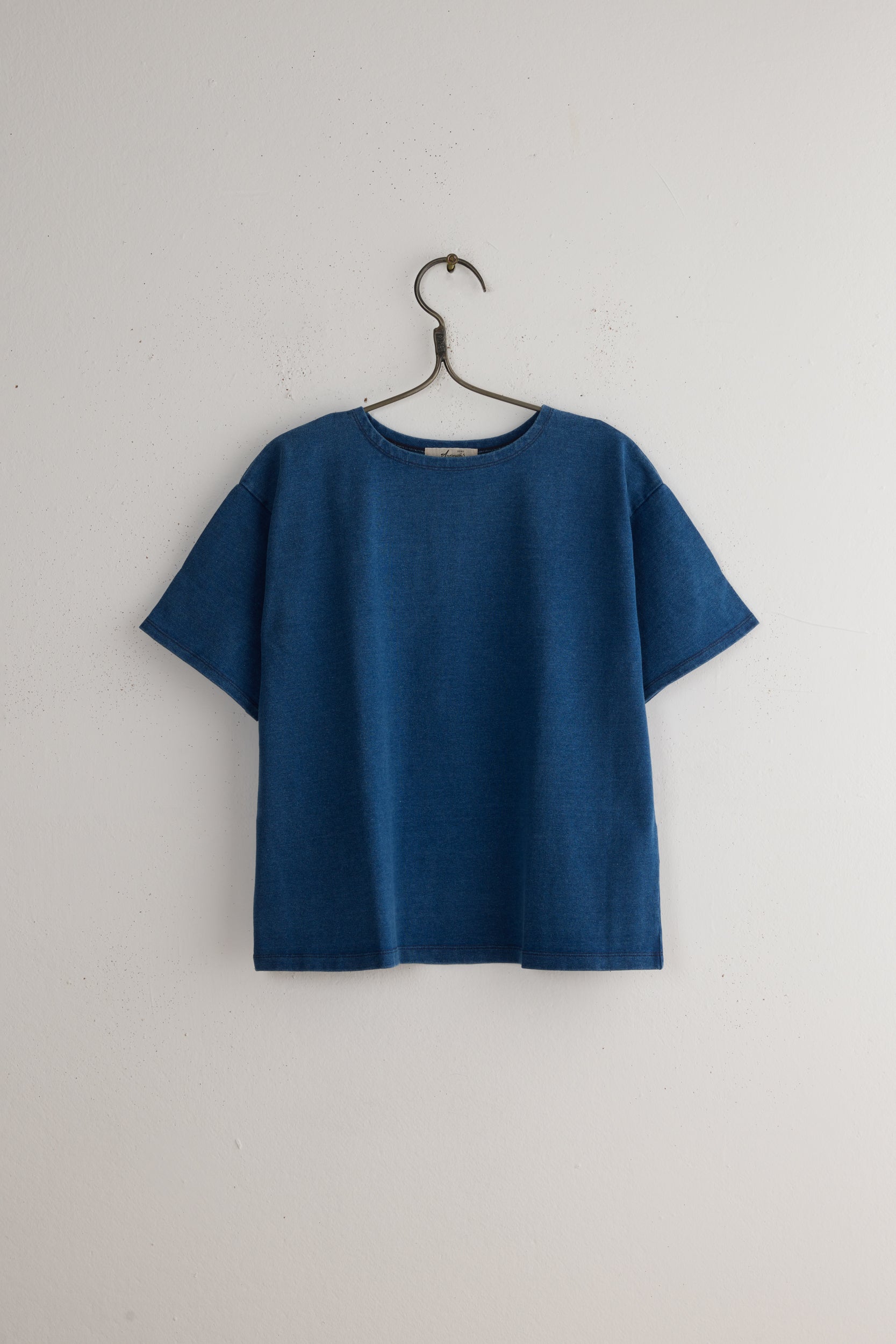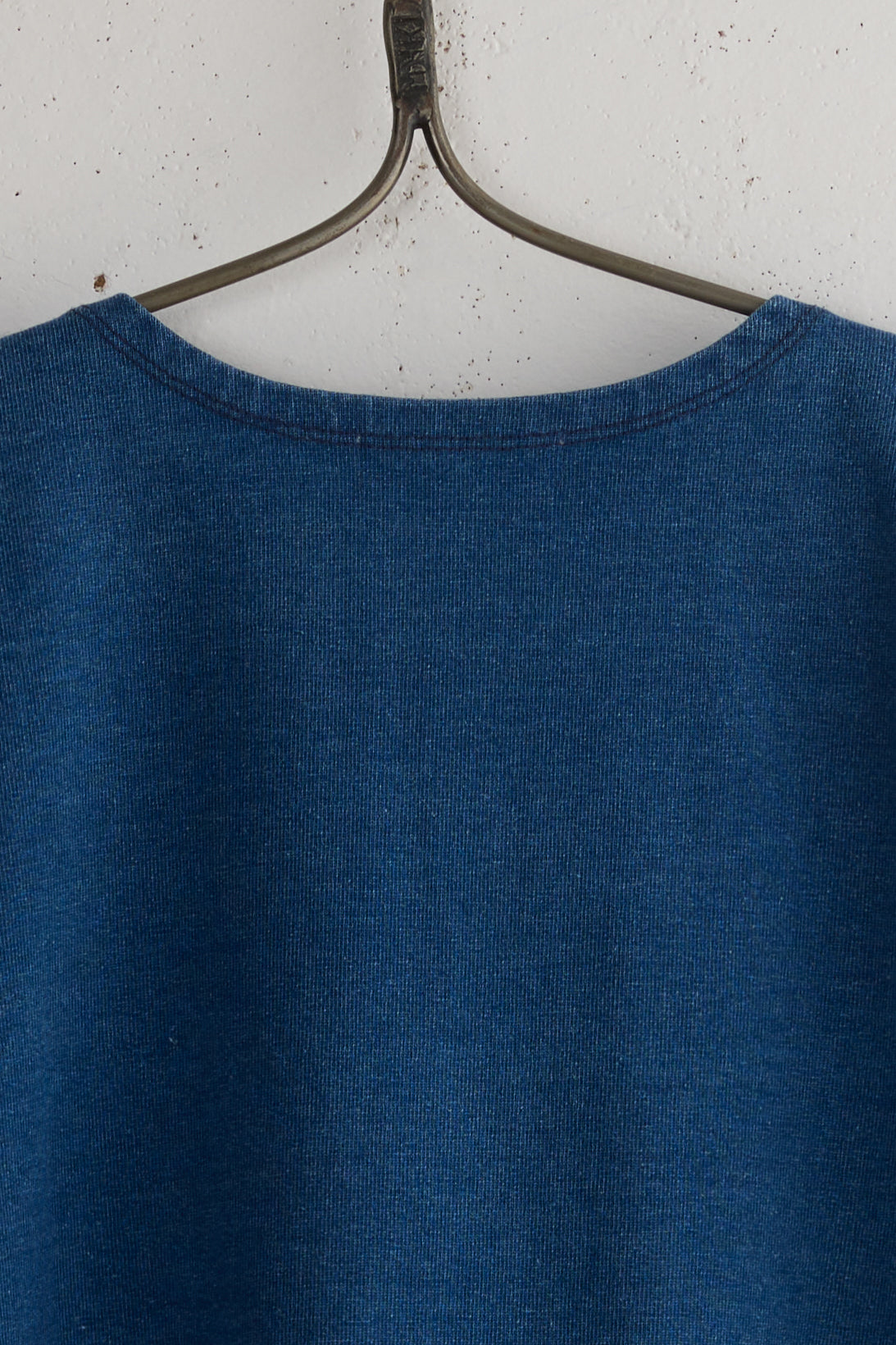 Short sleeve pullover by Ichi Antiquités. by A soft, short sleeved pullover made of a striped mid-weight cotton dyed with natural indigo. Wide, relaxed fit with a round neckline . Made in Japan.