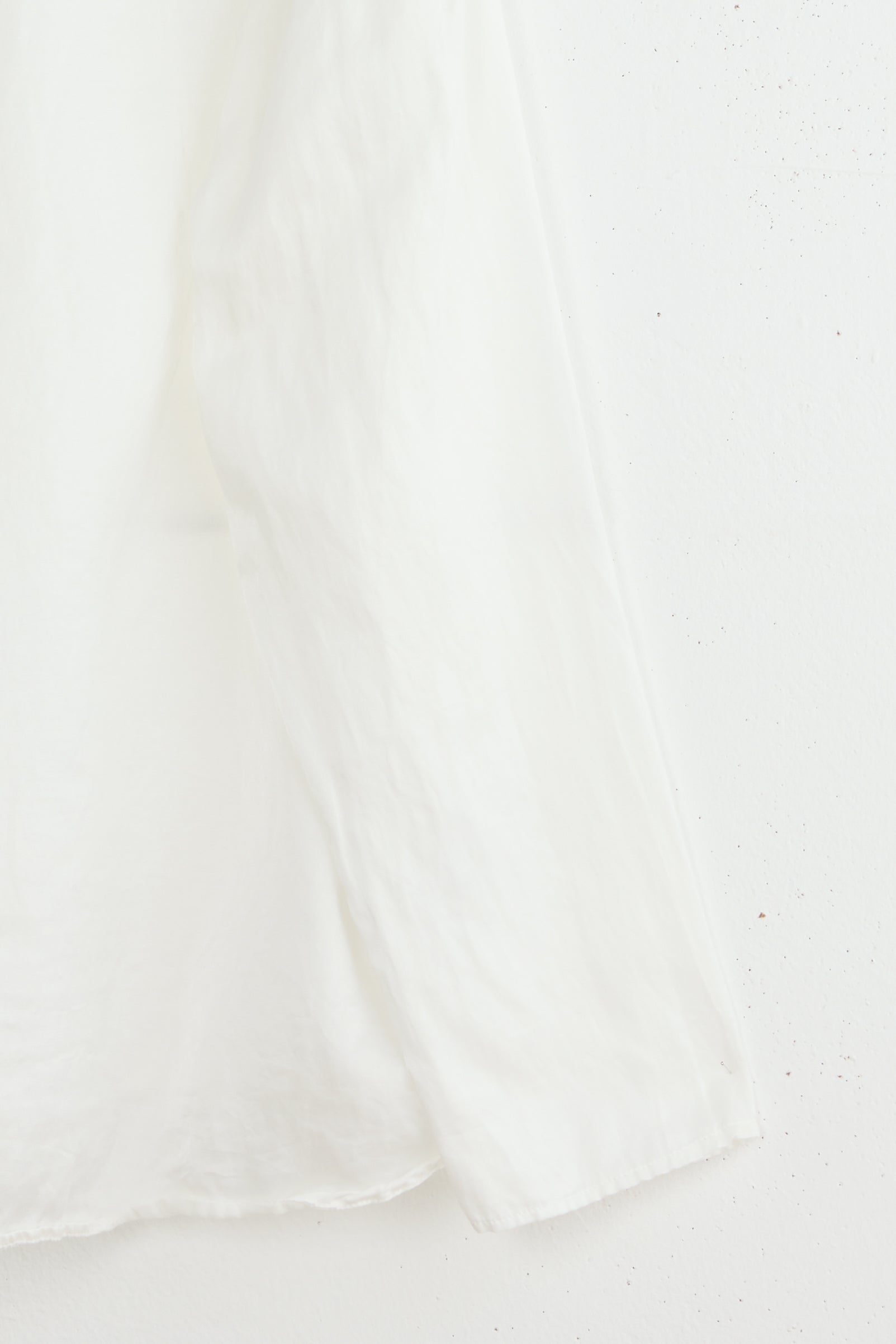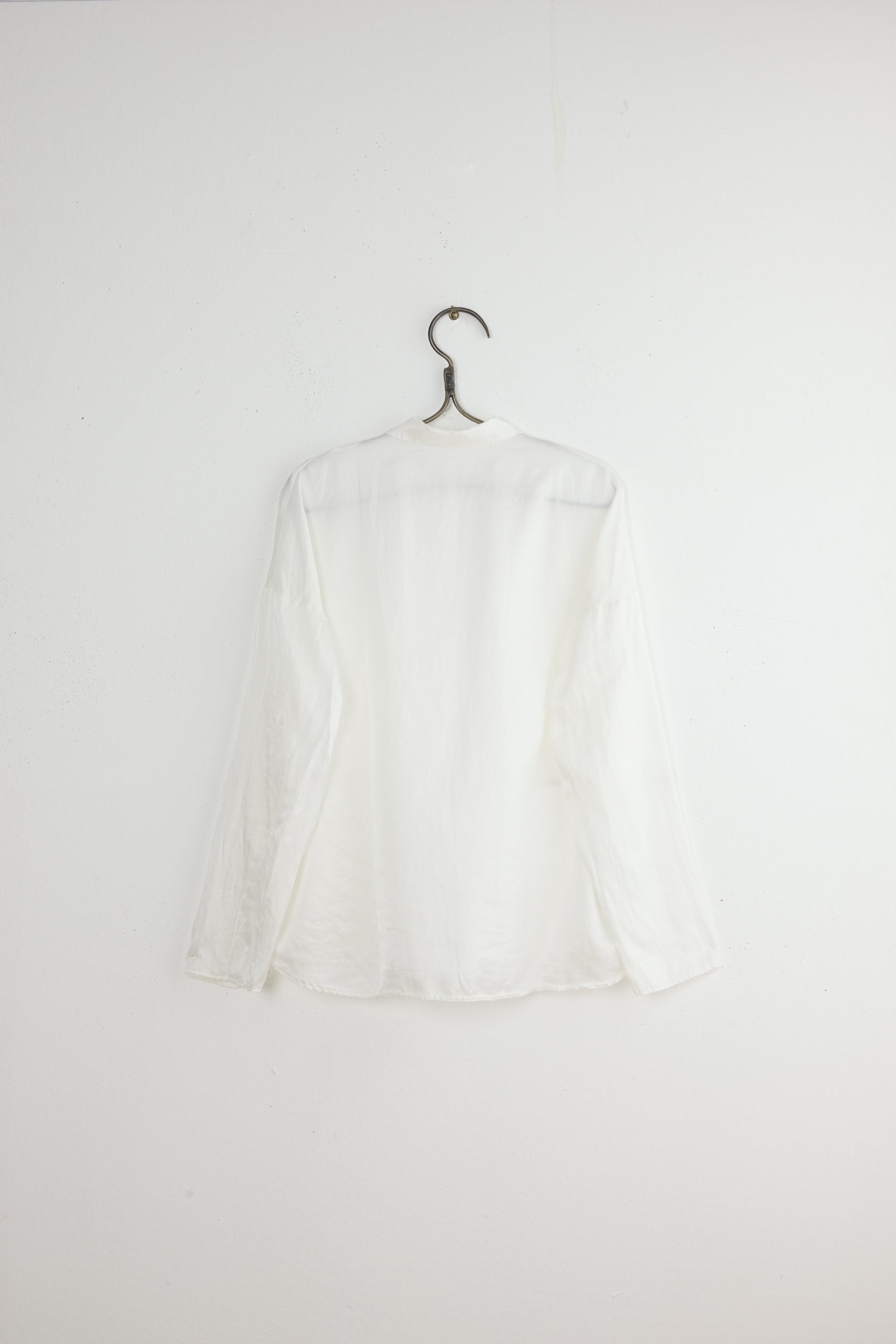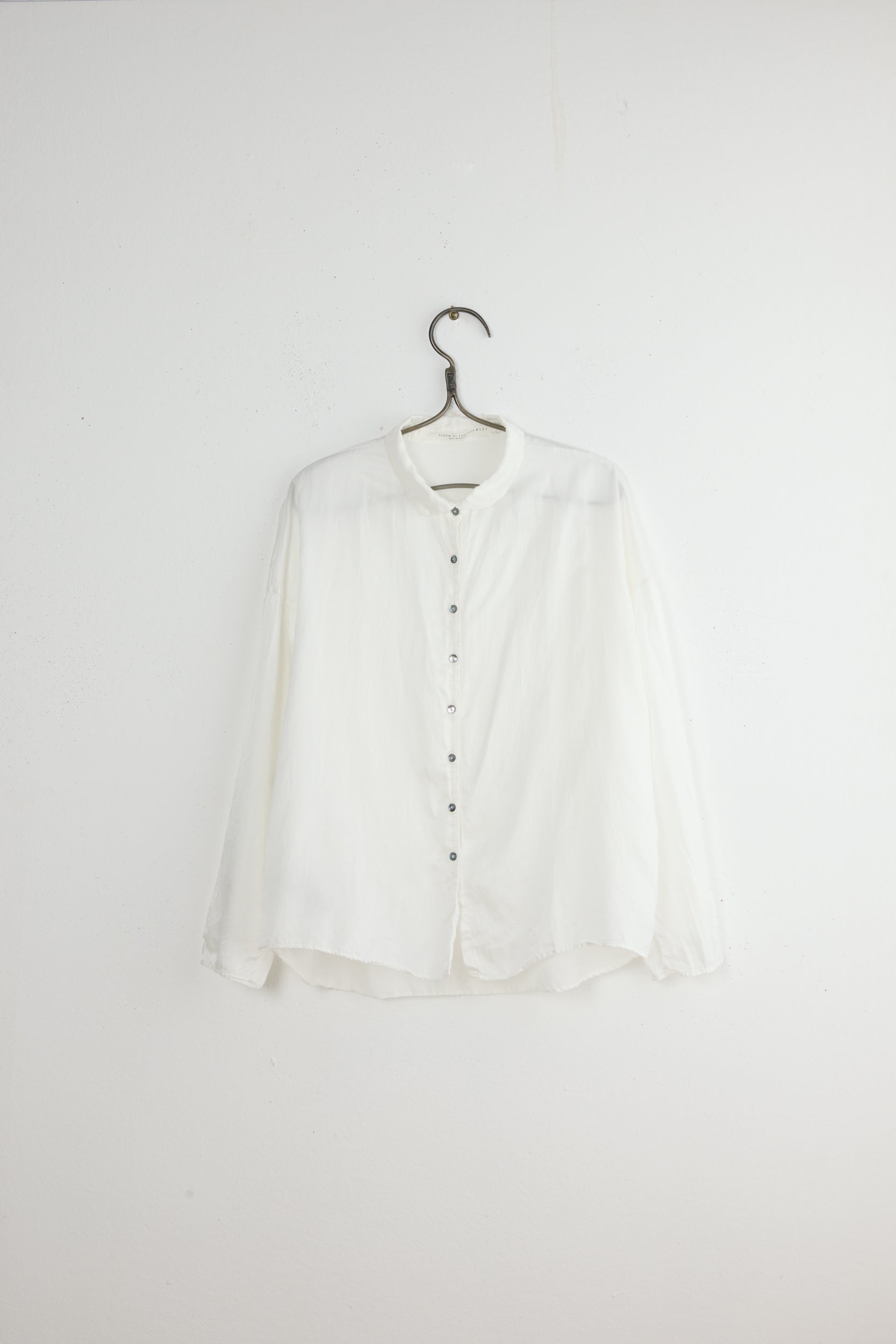 Album di Famiglia collar shirt SC. A flowy buttoned shirt made of a lightweight silk and cotton blend. Relaxed, slightly boxy silhouette with a small collar, long sleeves, dropped shoulders and front mother of pearl button closure.