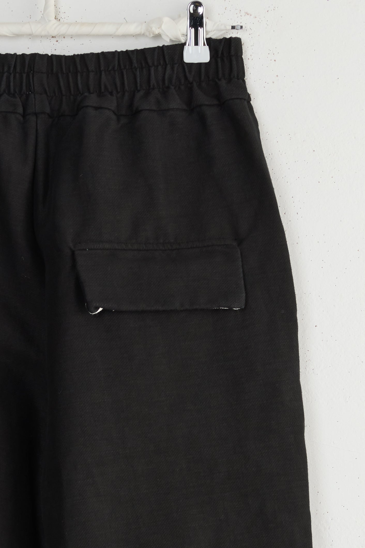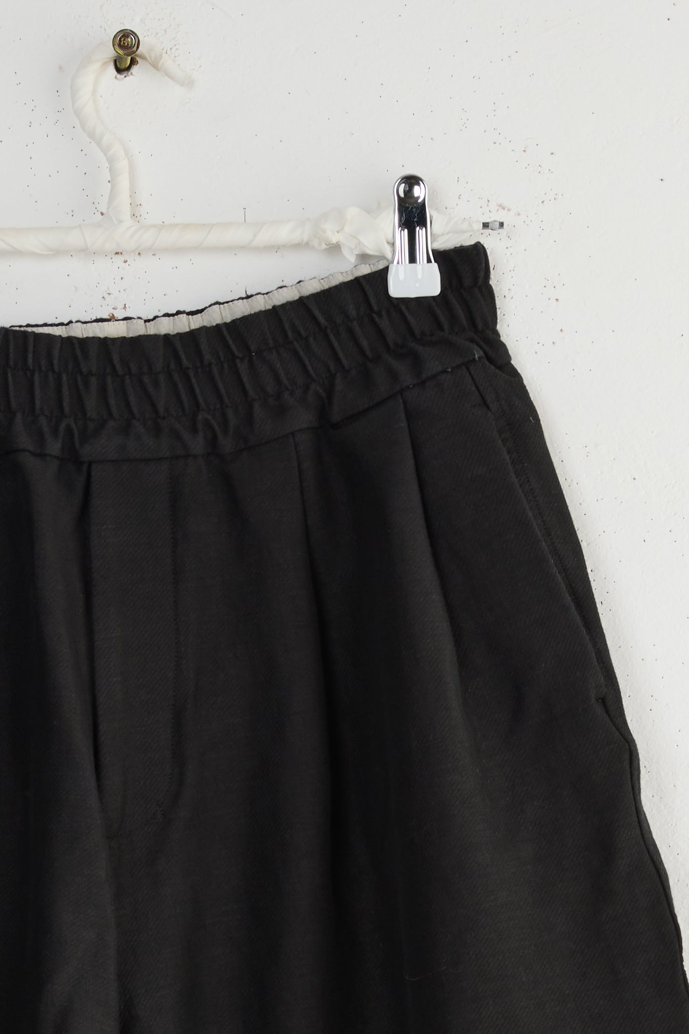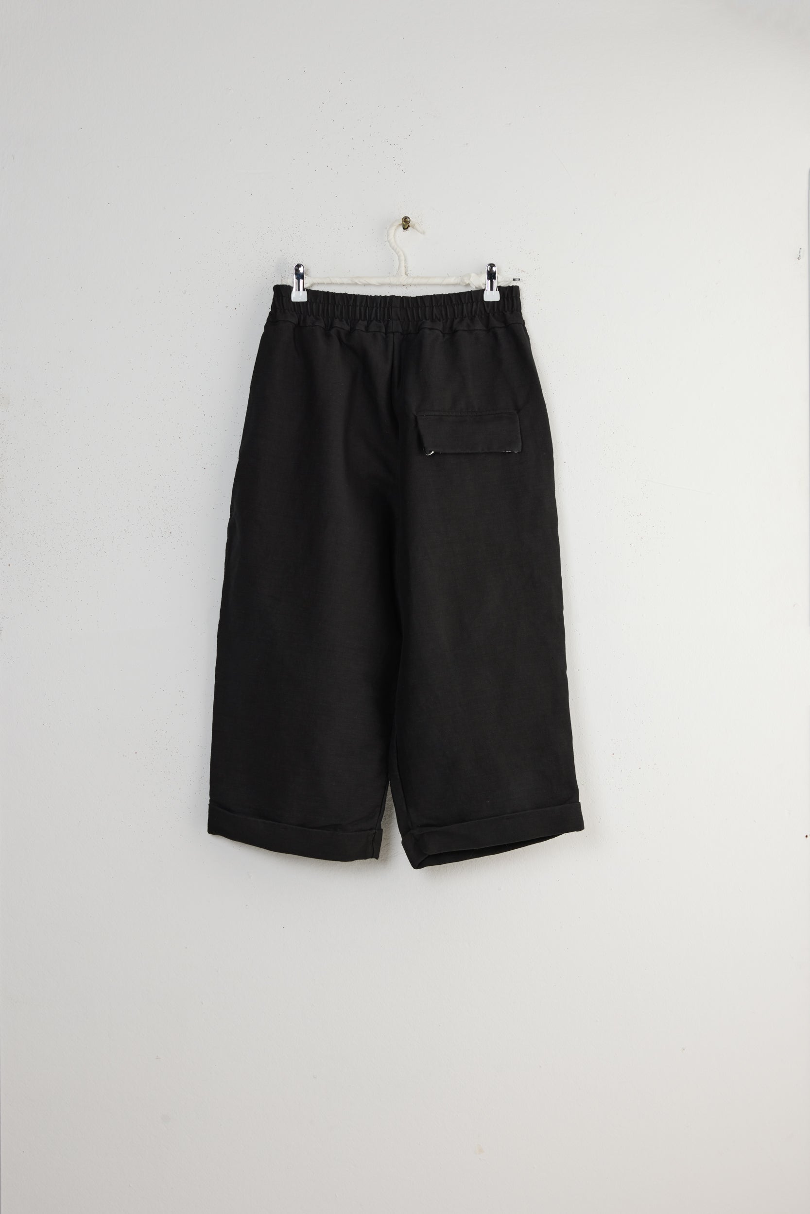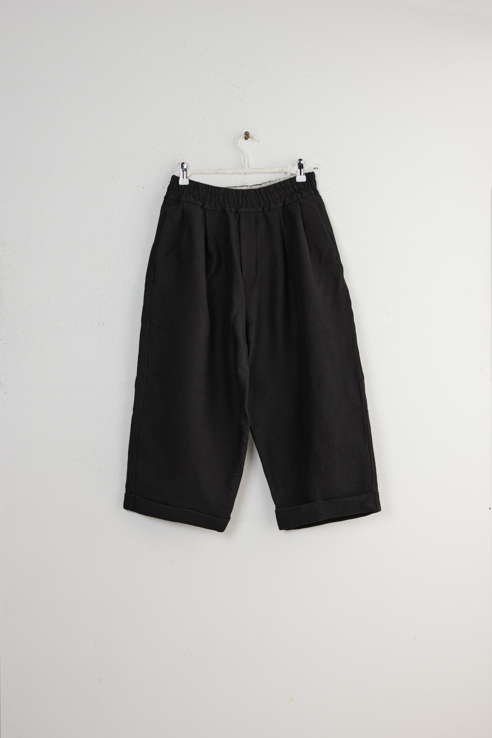 Album Di Famiglia Bragoni DS Trousers. Unisex, wide pleated trousers made from a midweight, stretchy blend of wool, cotton, and hemp. Oversized fit with cropped leg, elastic waistband, linen drawstring, side pockets and one lower back flap pocket. Made in Italy.