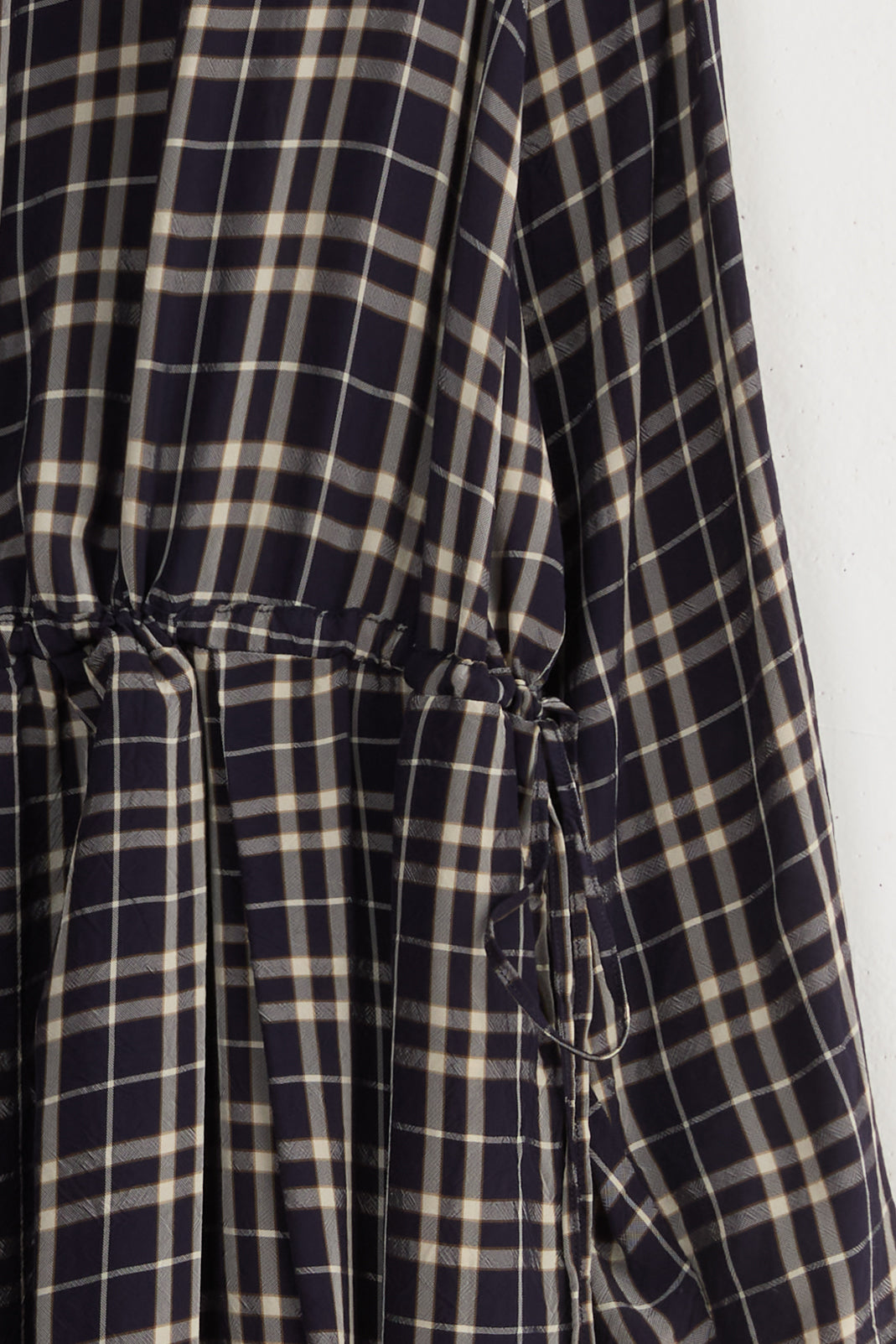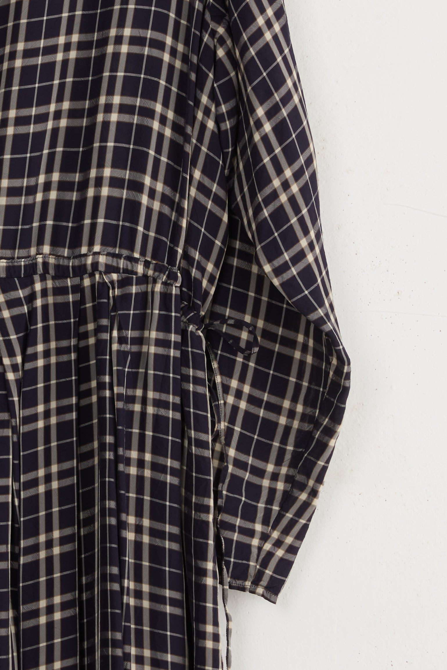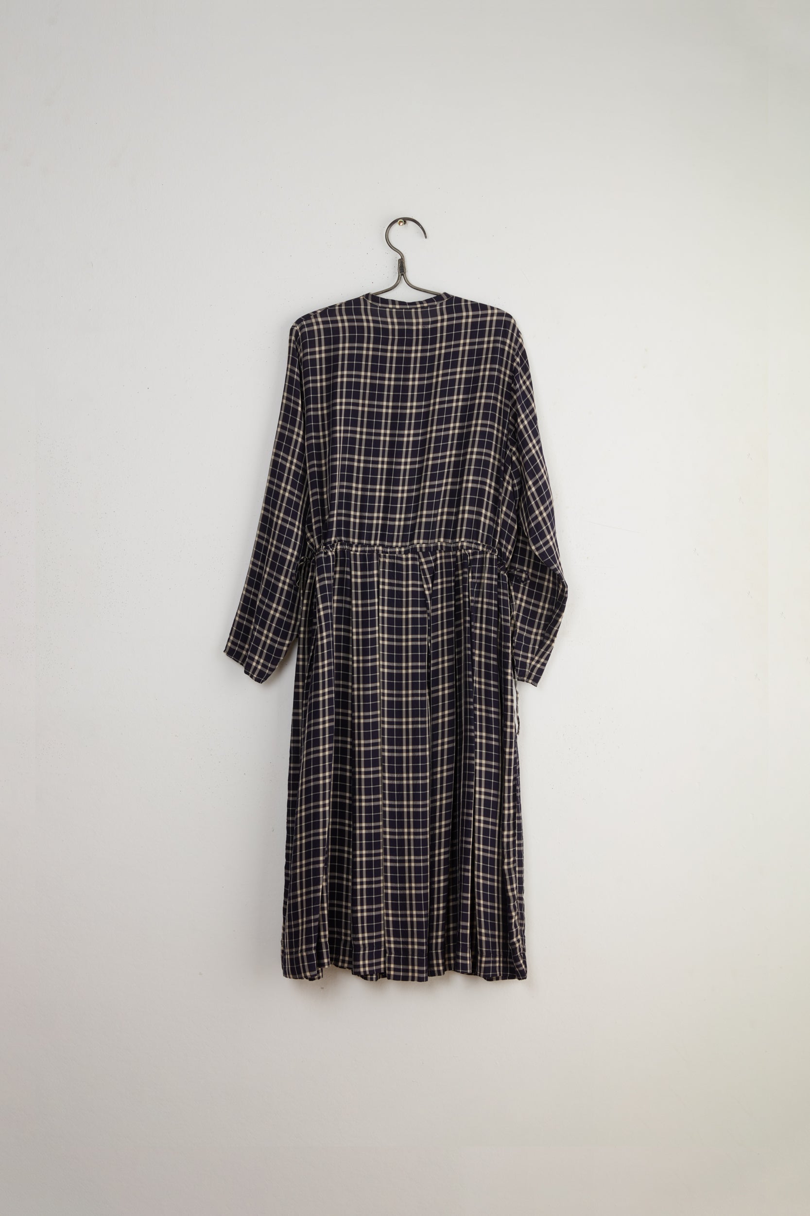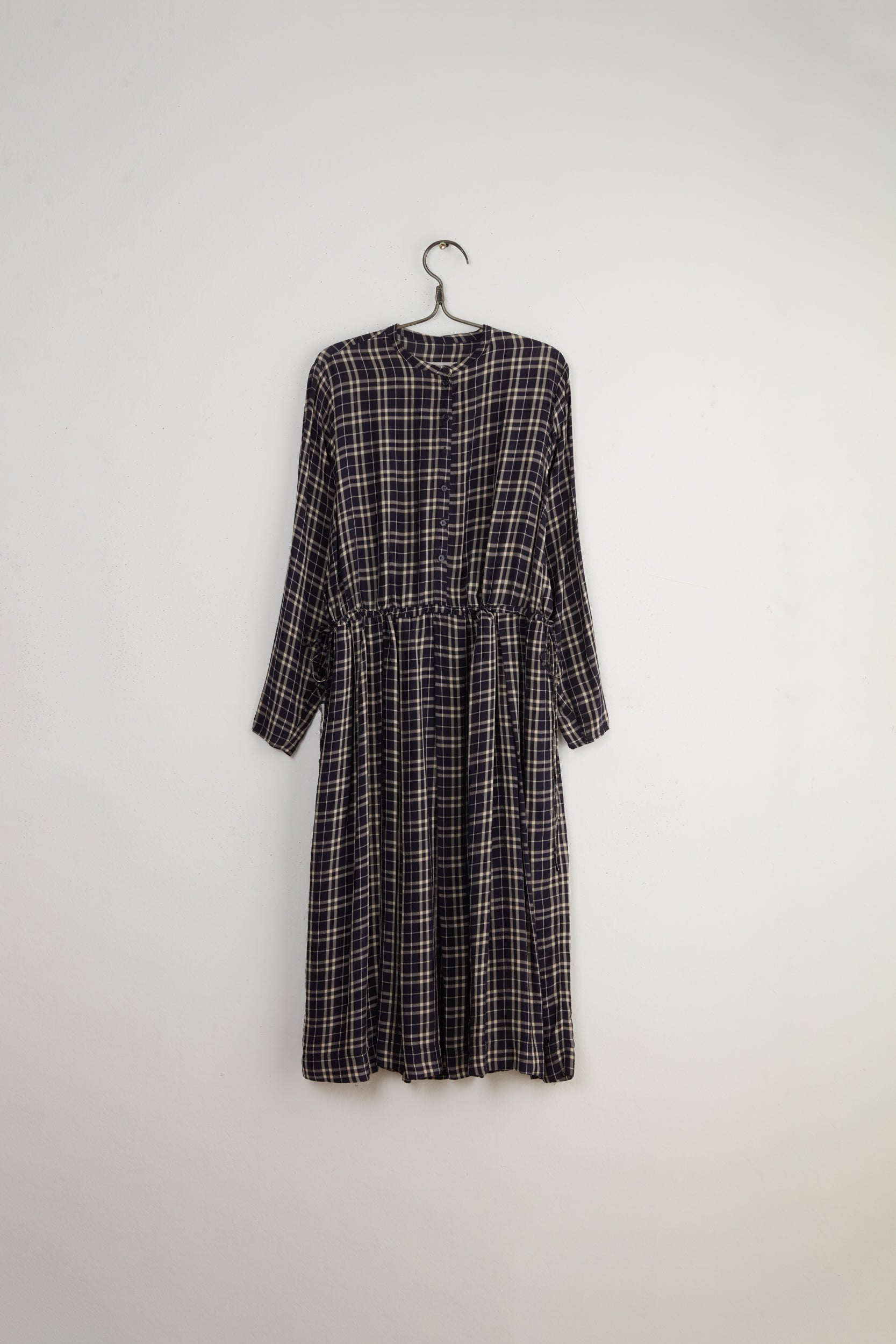 Robe Soti by Manuelle Guibal. A long plaid dress made from silky viscose. Loose-fitting , with center front buttons down to the waist seam, band collar, drawstring waist and gathered long skirt with side seam pockets. Made in France.