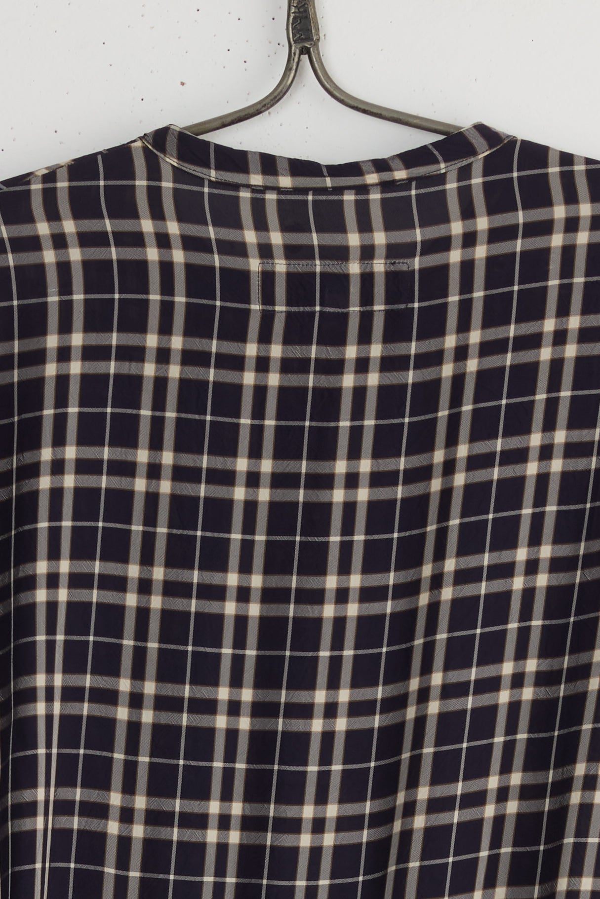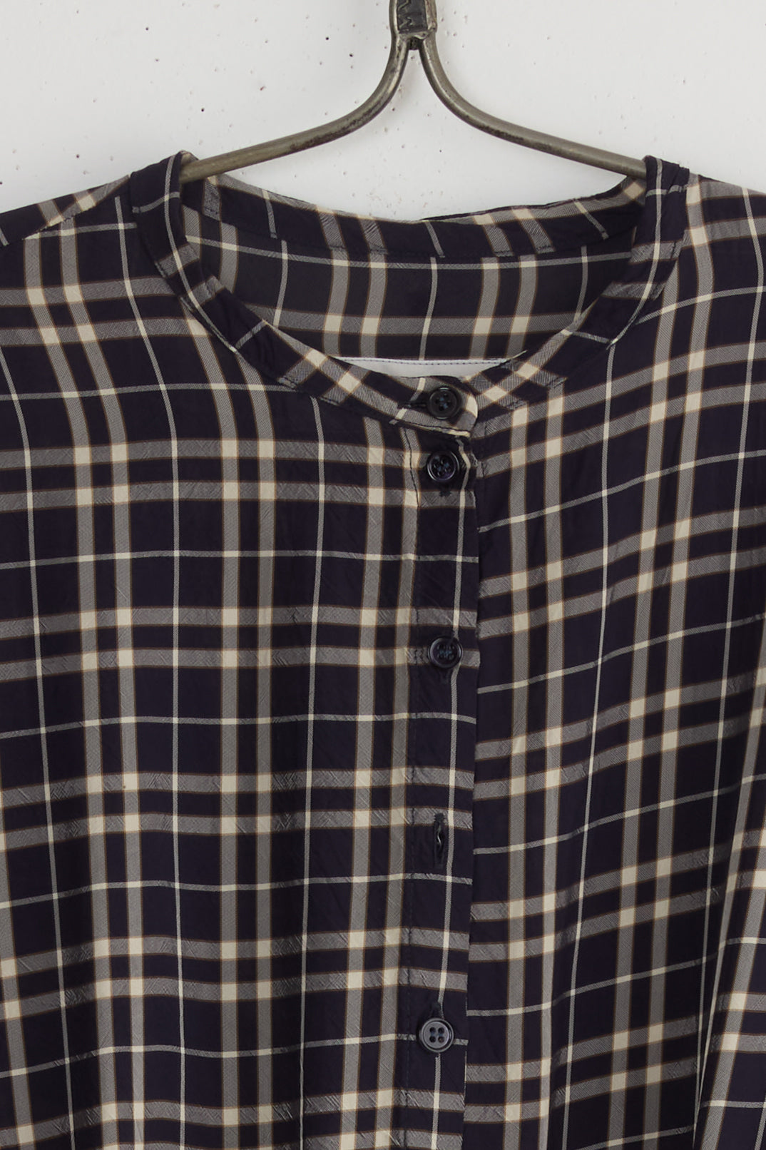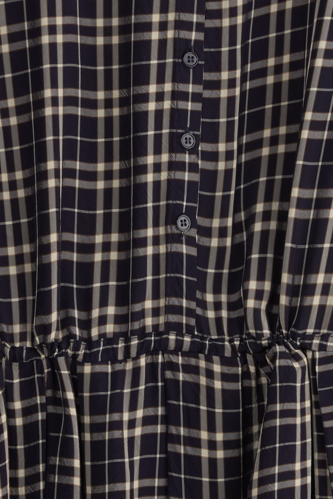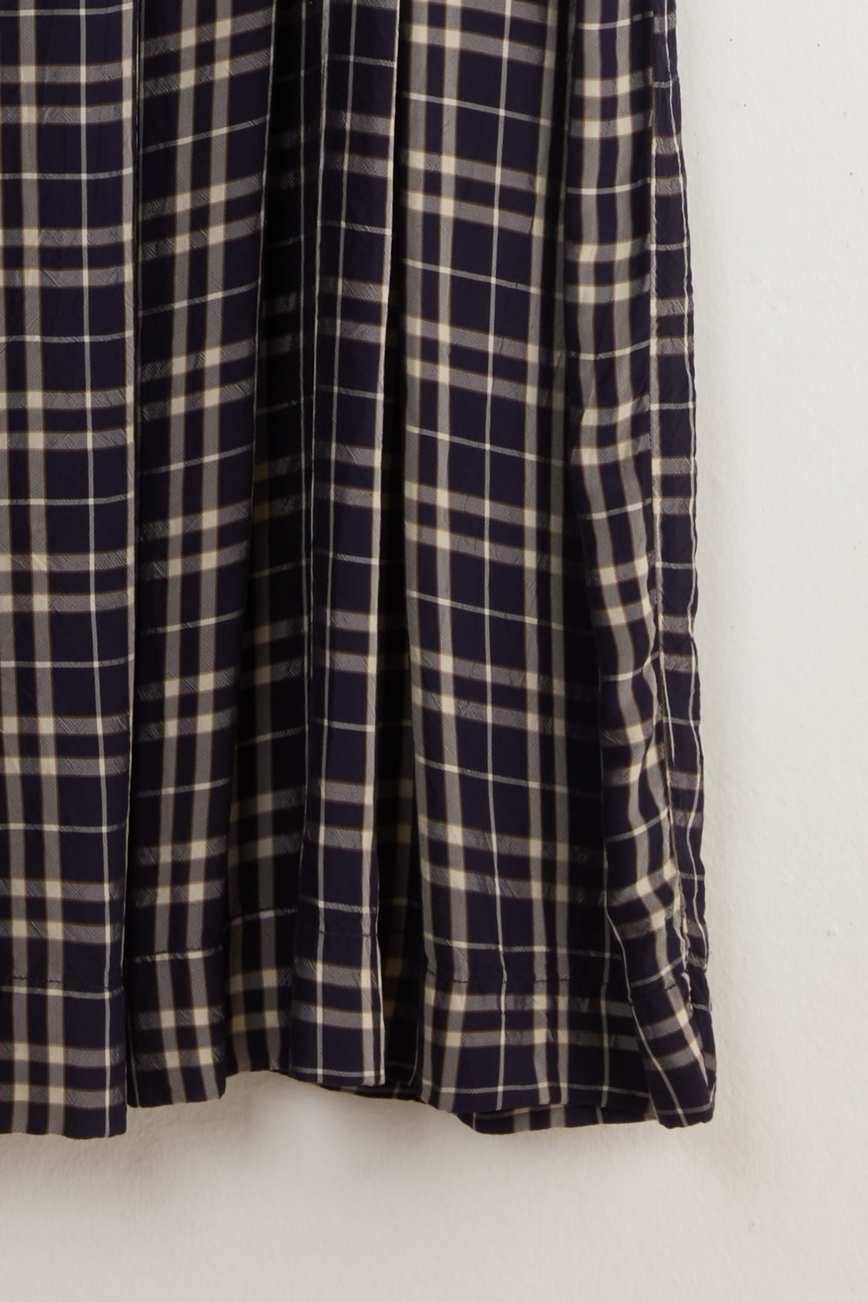Robe Soti by Manuelle Guibal. A long plaid dress made from silky viscose. Loose-fitting , with center front buttons down to the waist seam, band collar, drawstring waist and gathered long skirt with side seam pockets. Made in France.