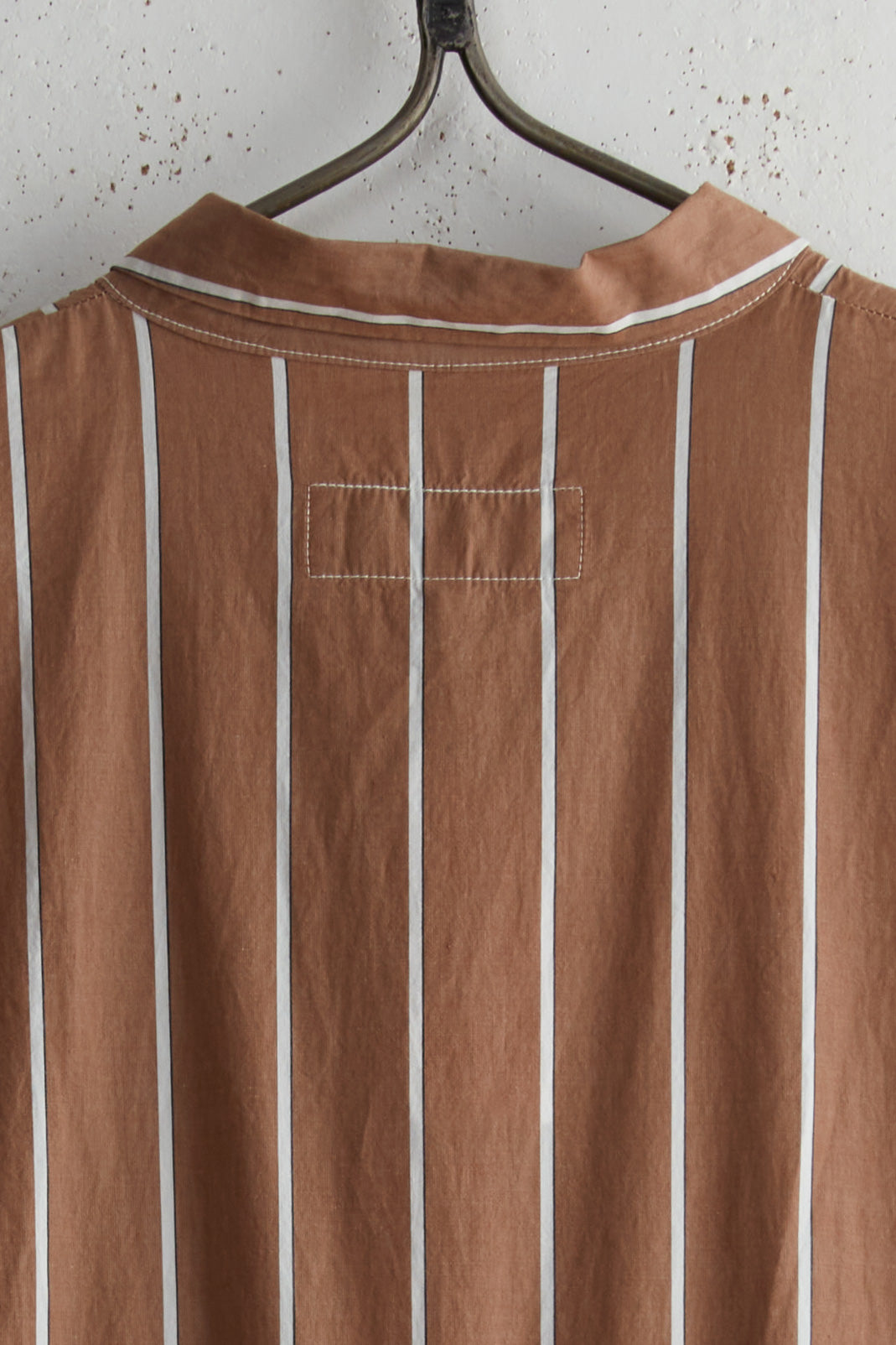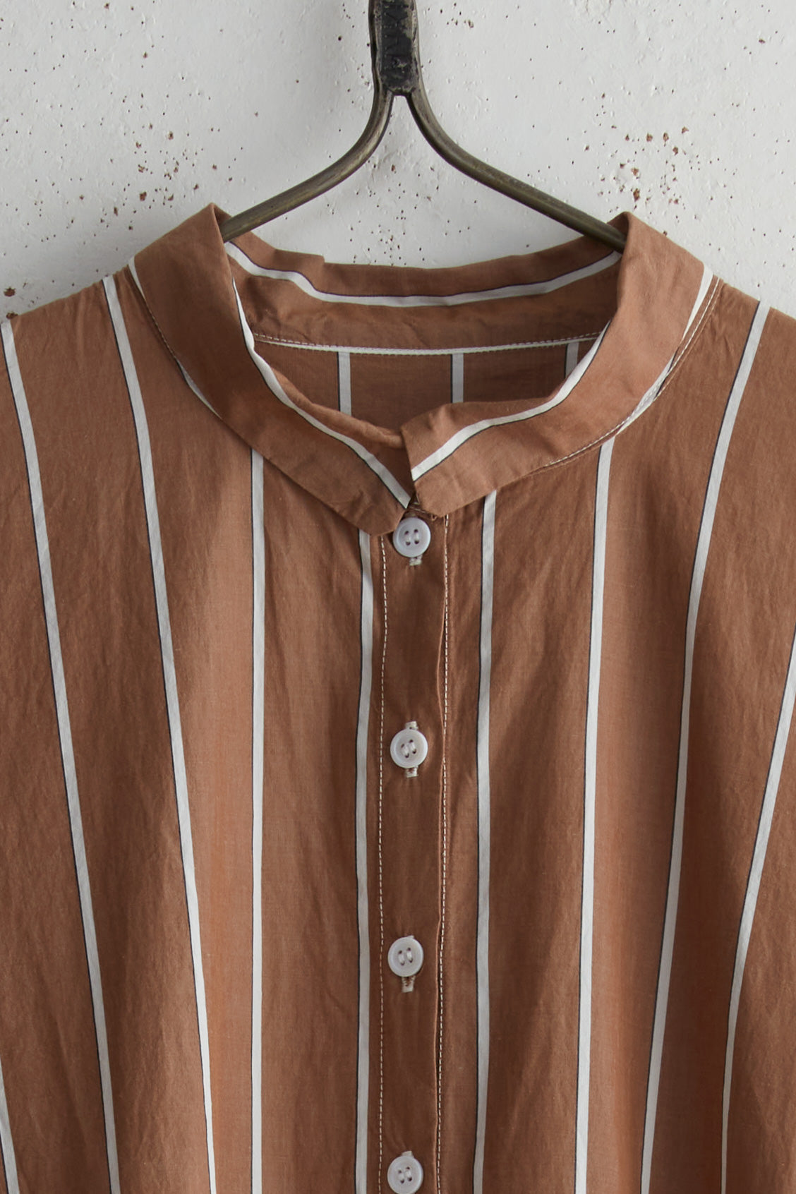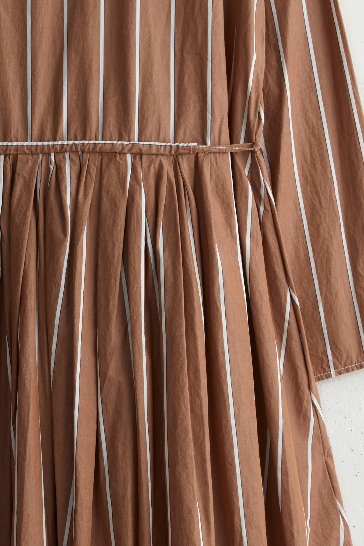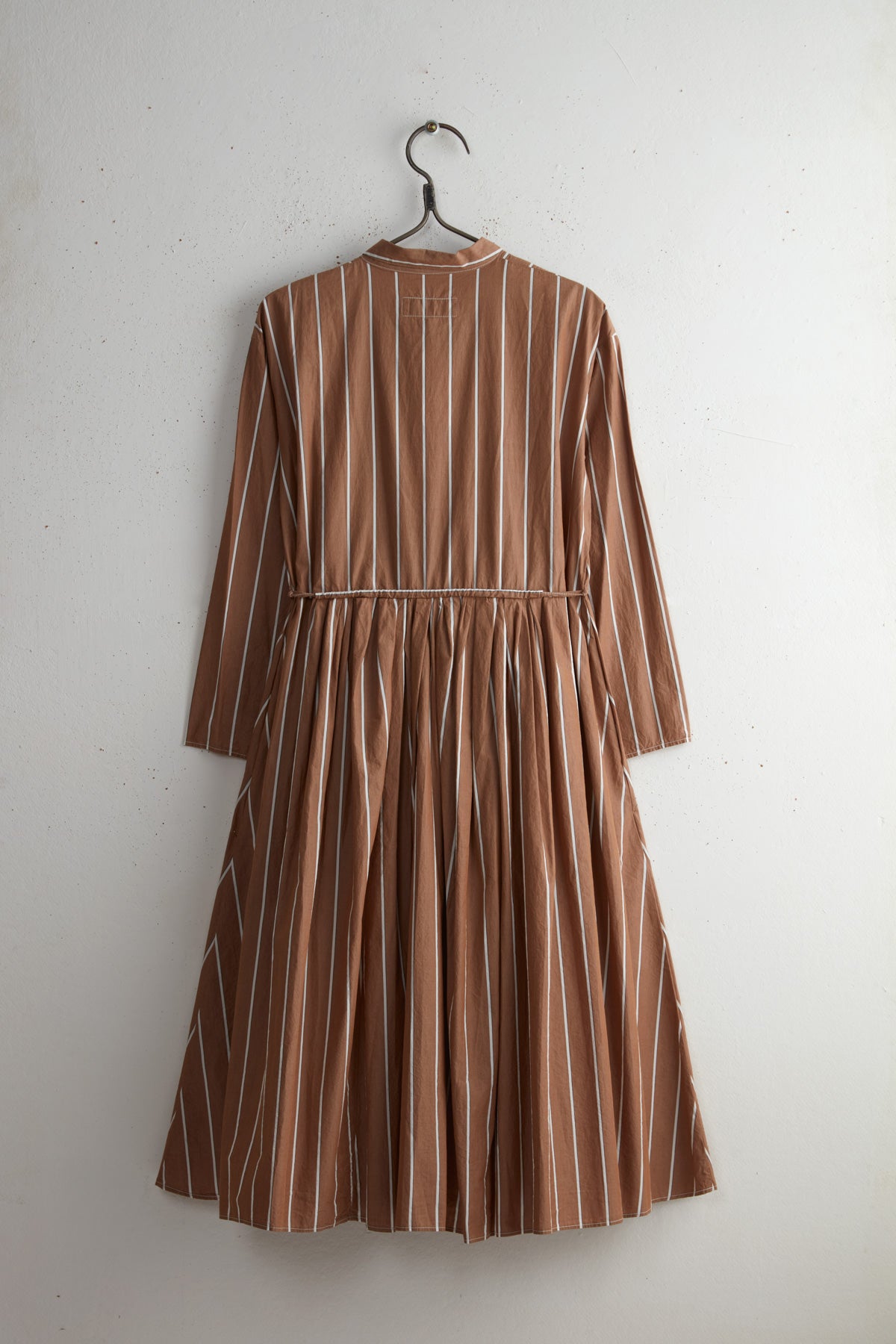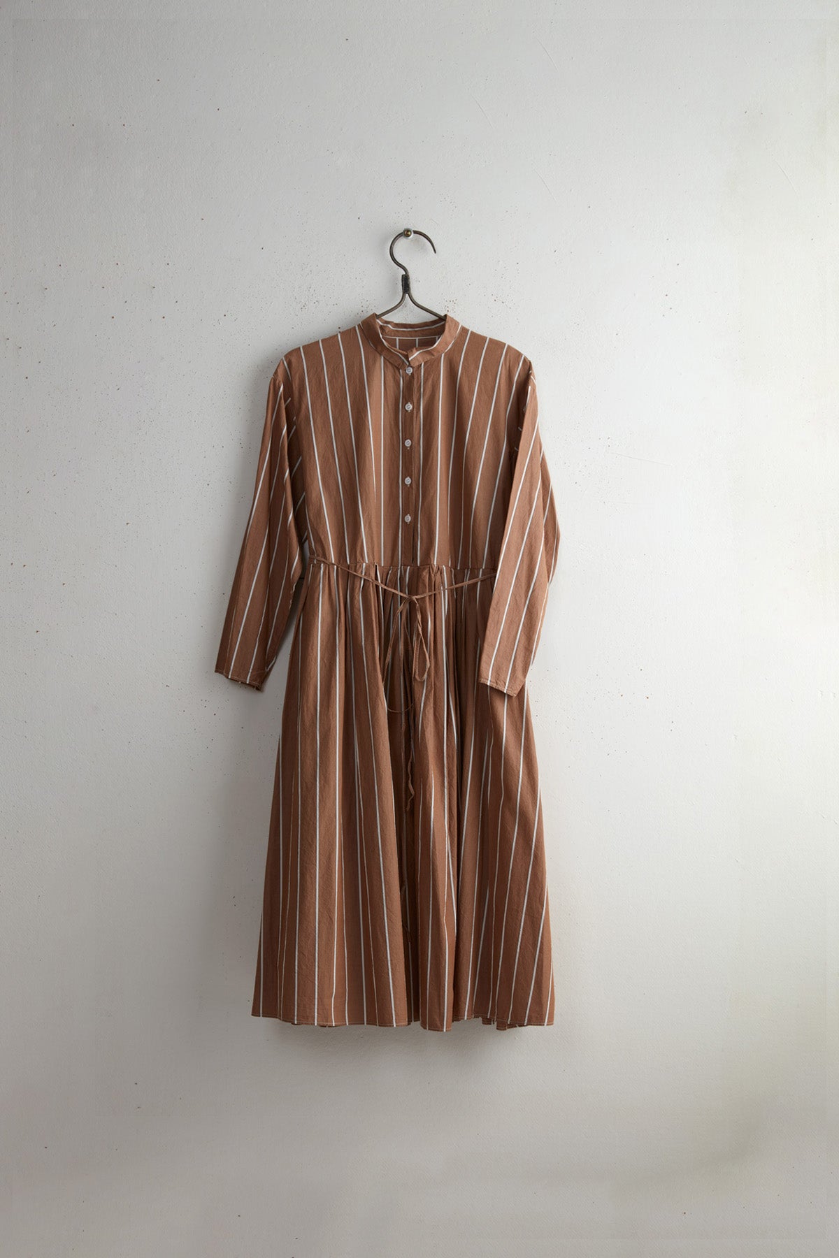 Boni Chemise dress by Manuelle Guibal. Cotton paper long collared dress with stripped pattern. Long sleeves and a pleated skirt with a Tie waist and side pockets. Button closure with natural mother of pearl buttons.
