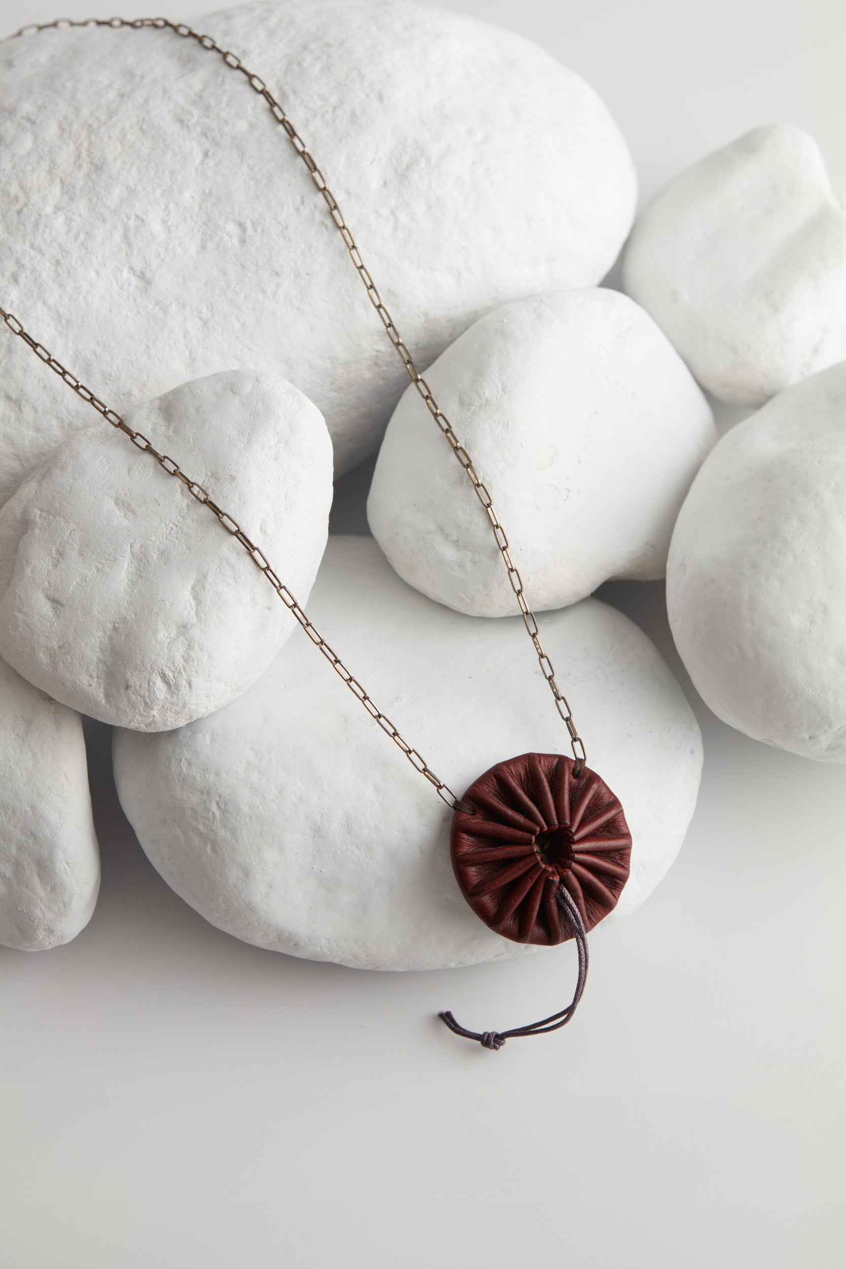 Round pleated necklace by m.a+. leather round pouch pendant with drawstring closure on a sterling silver cube link chain.
