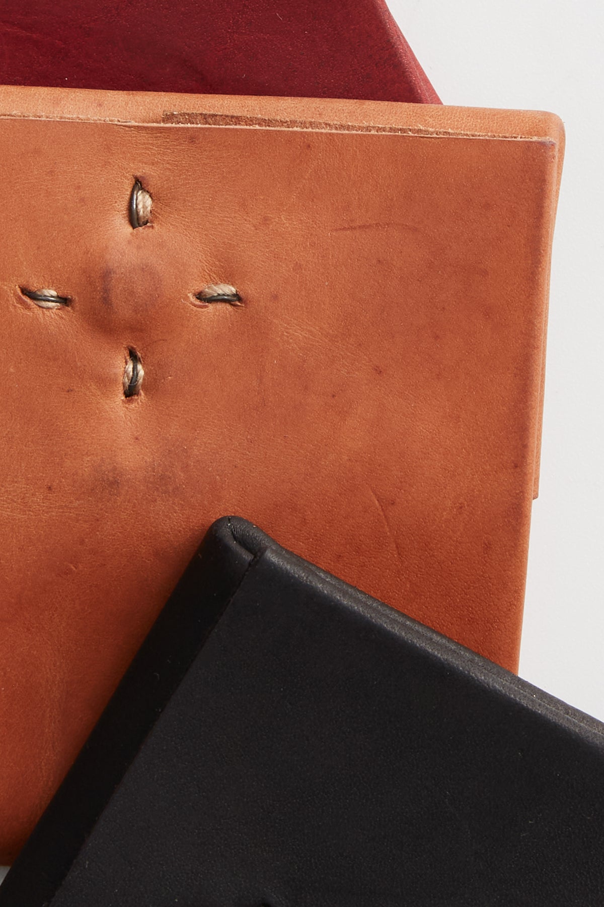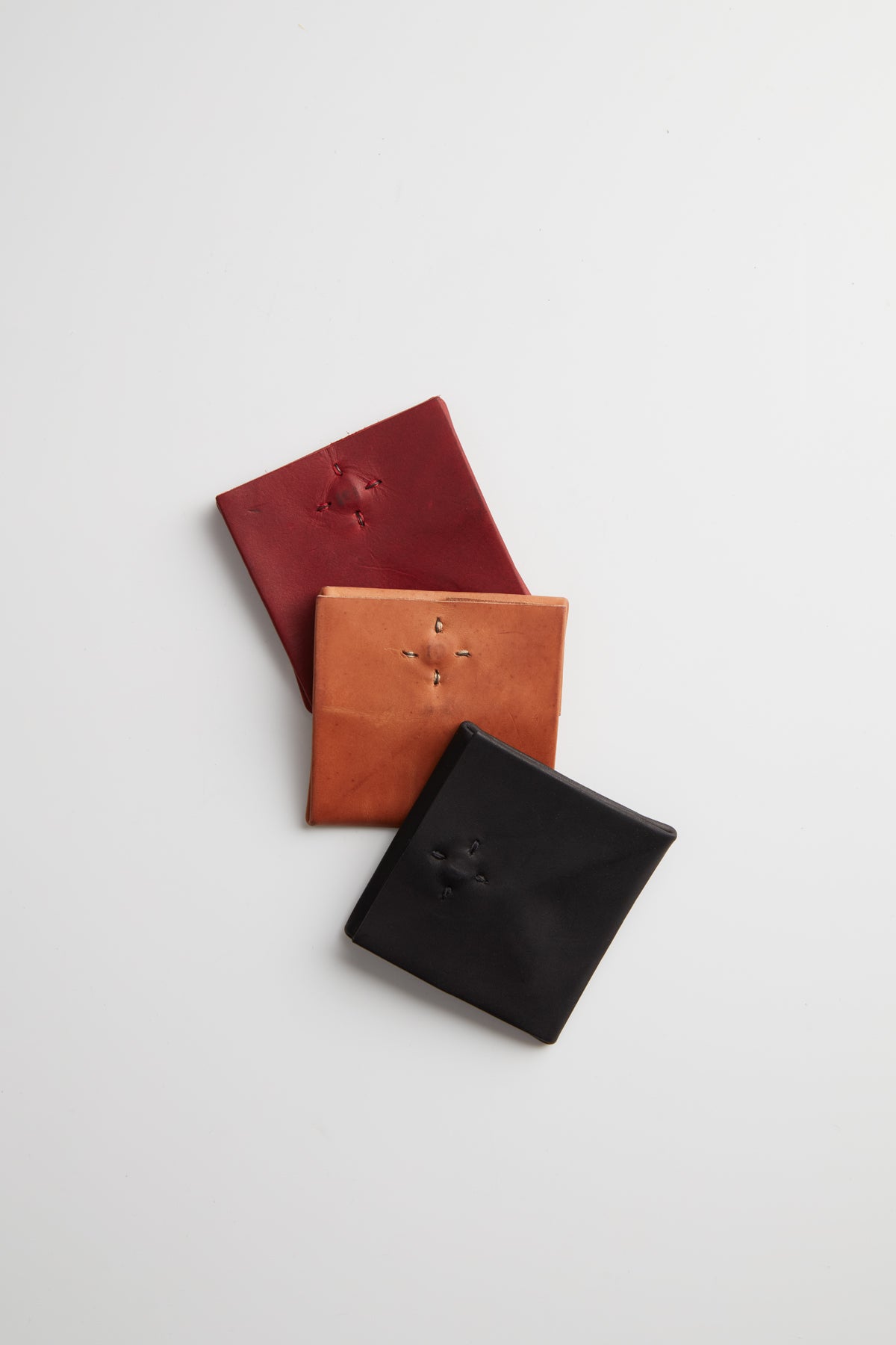 Mini square coin holder by m.a+. square coin holder made by folding a single piece of leather. hand stitched with snap button closure and the MA cross logo embossed in sterling silver.