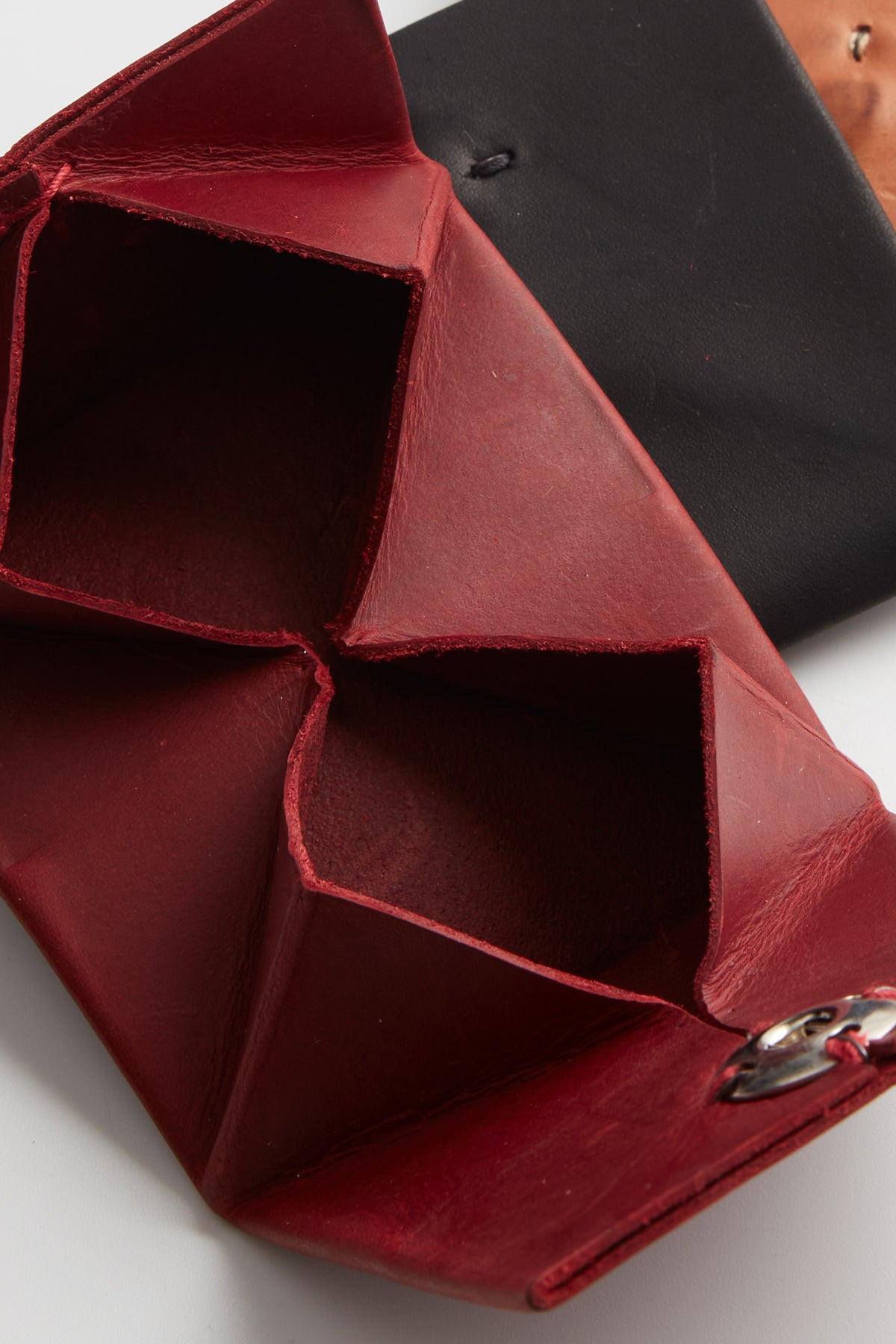 Small square coin holder by m.a+. square coin holder made by folding a single piece of leather. hand stitched with snap button closure and the MA cross logo embossed in sterling silver.