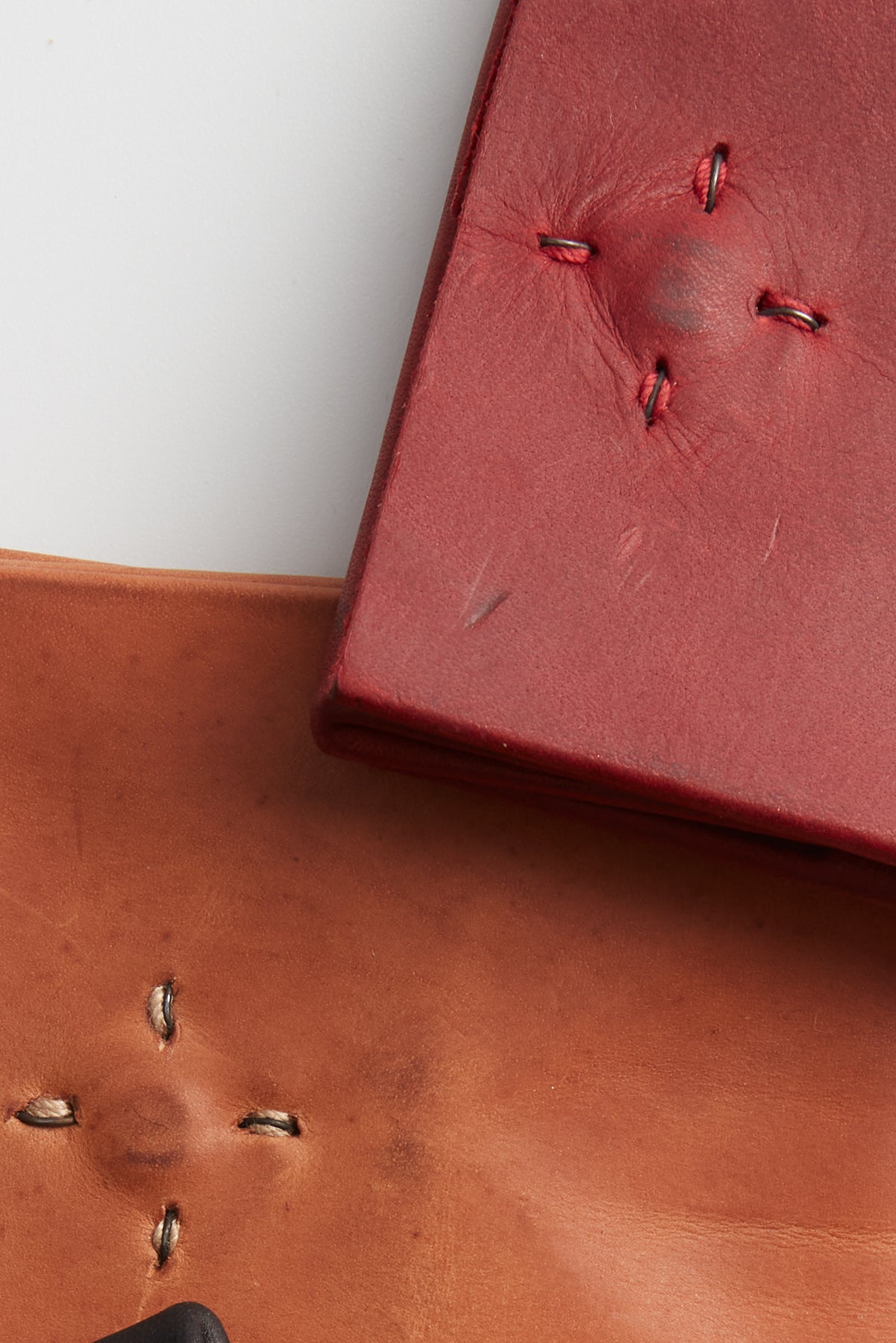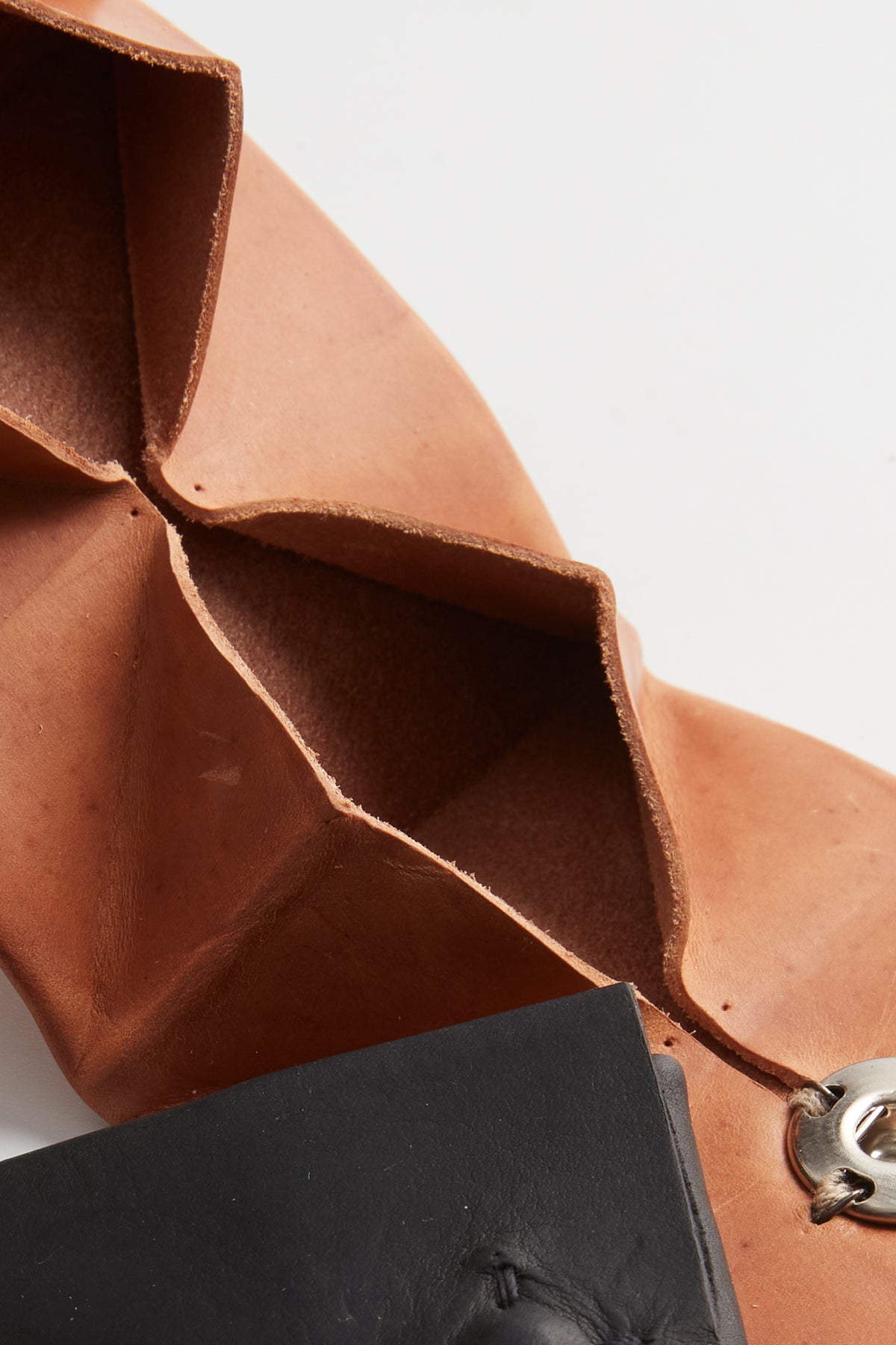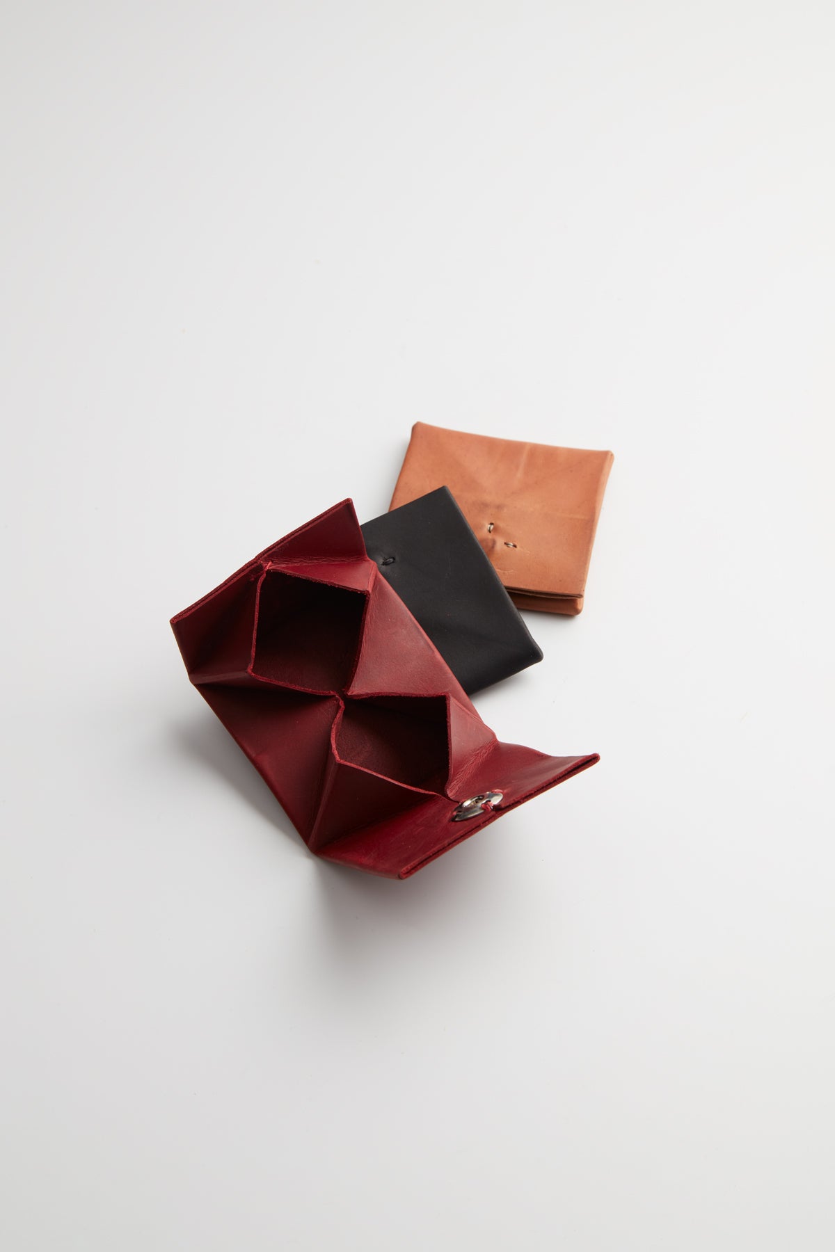 Medium square coin holder by m.a+. square coin holder made by folding a single piece of leather. hand stitched with snap button closure and the MA cross logo embossed in sterling silver.
