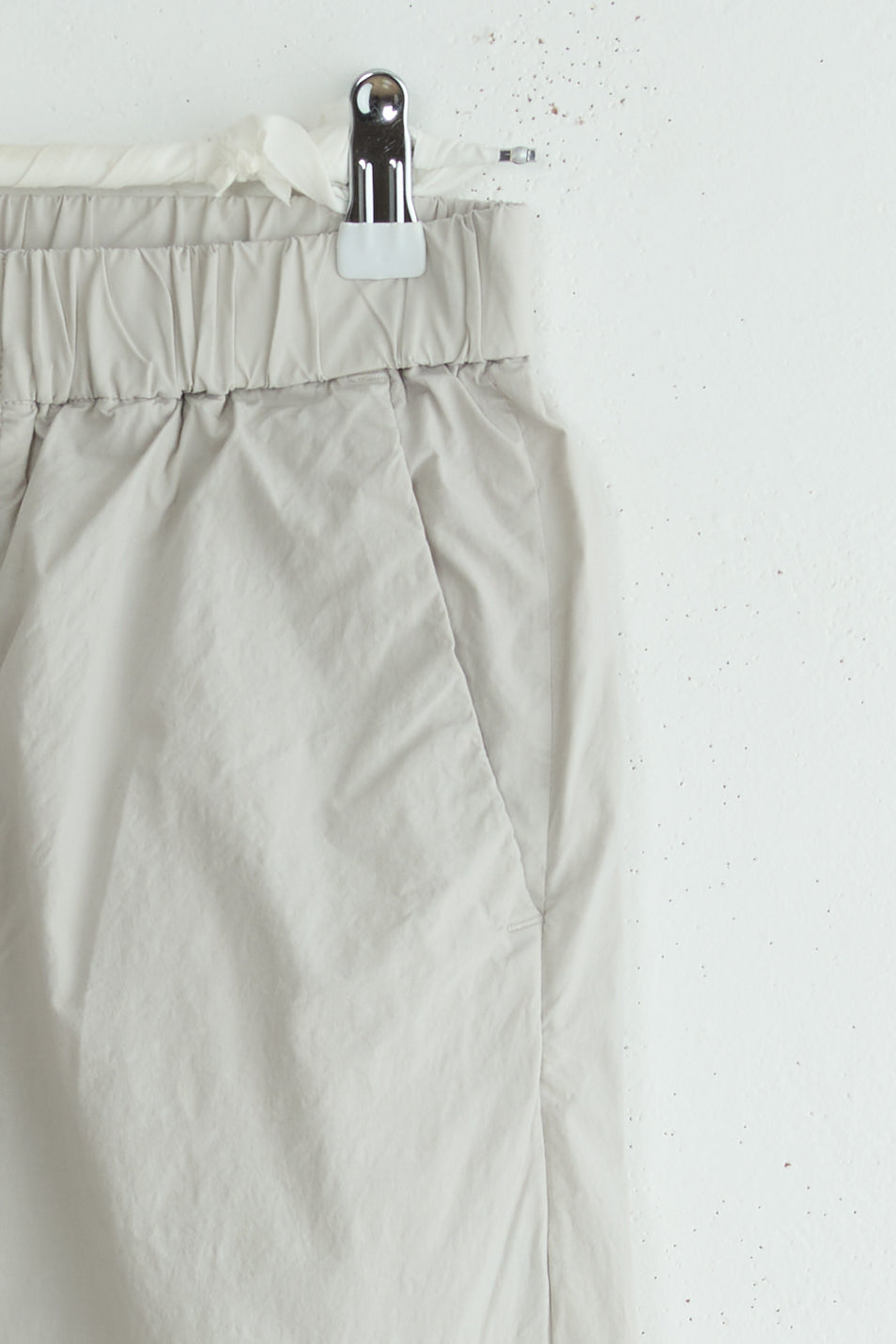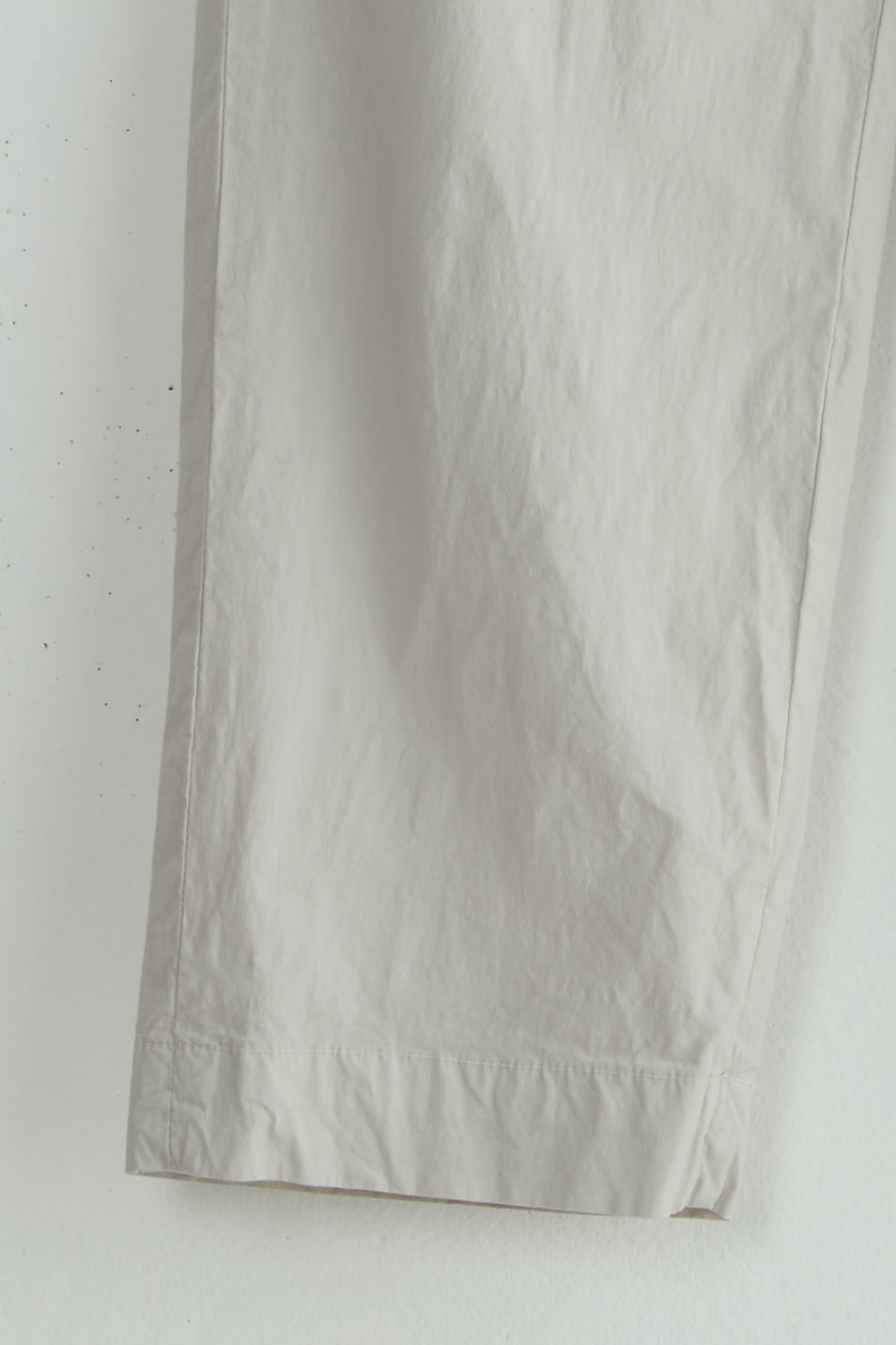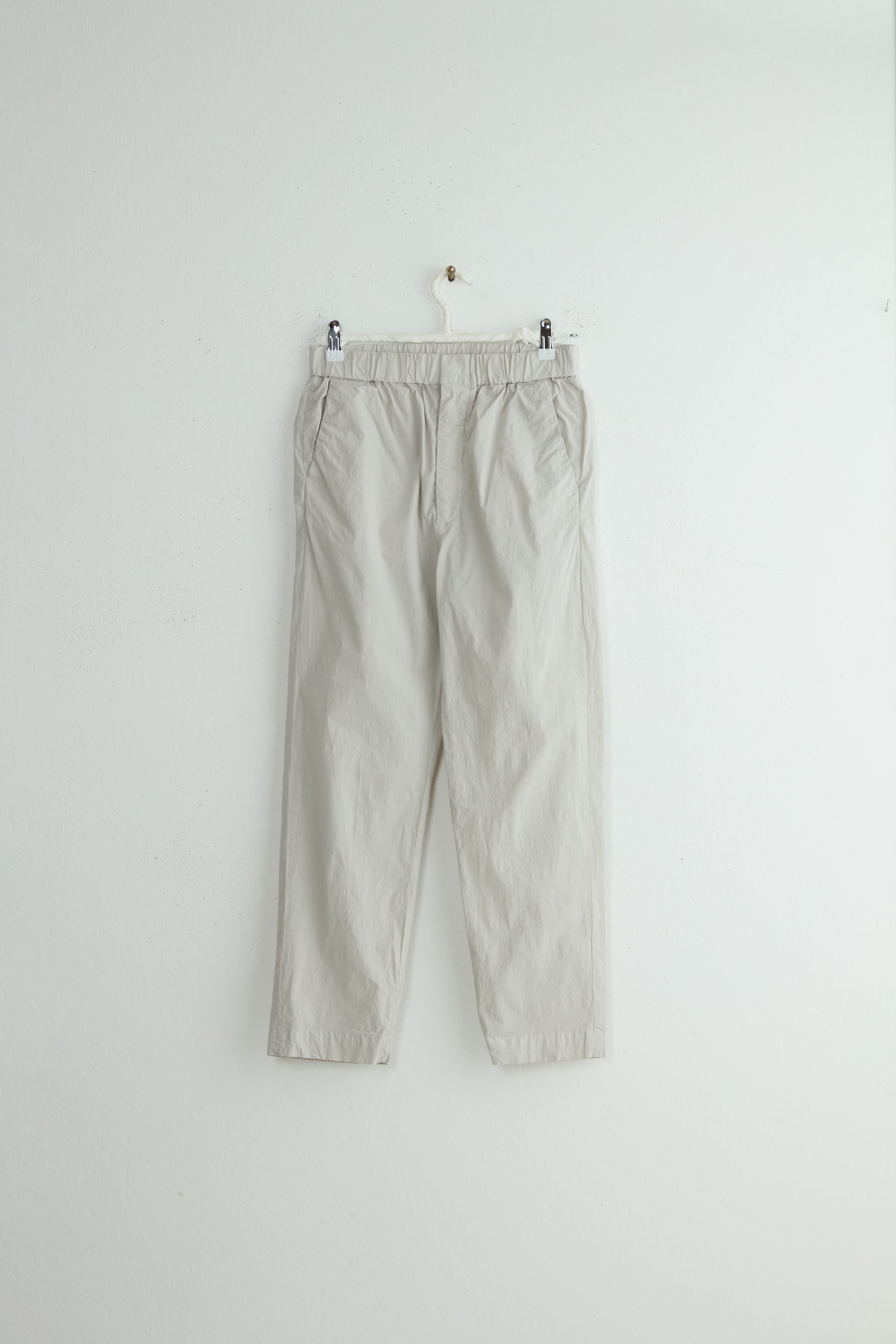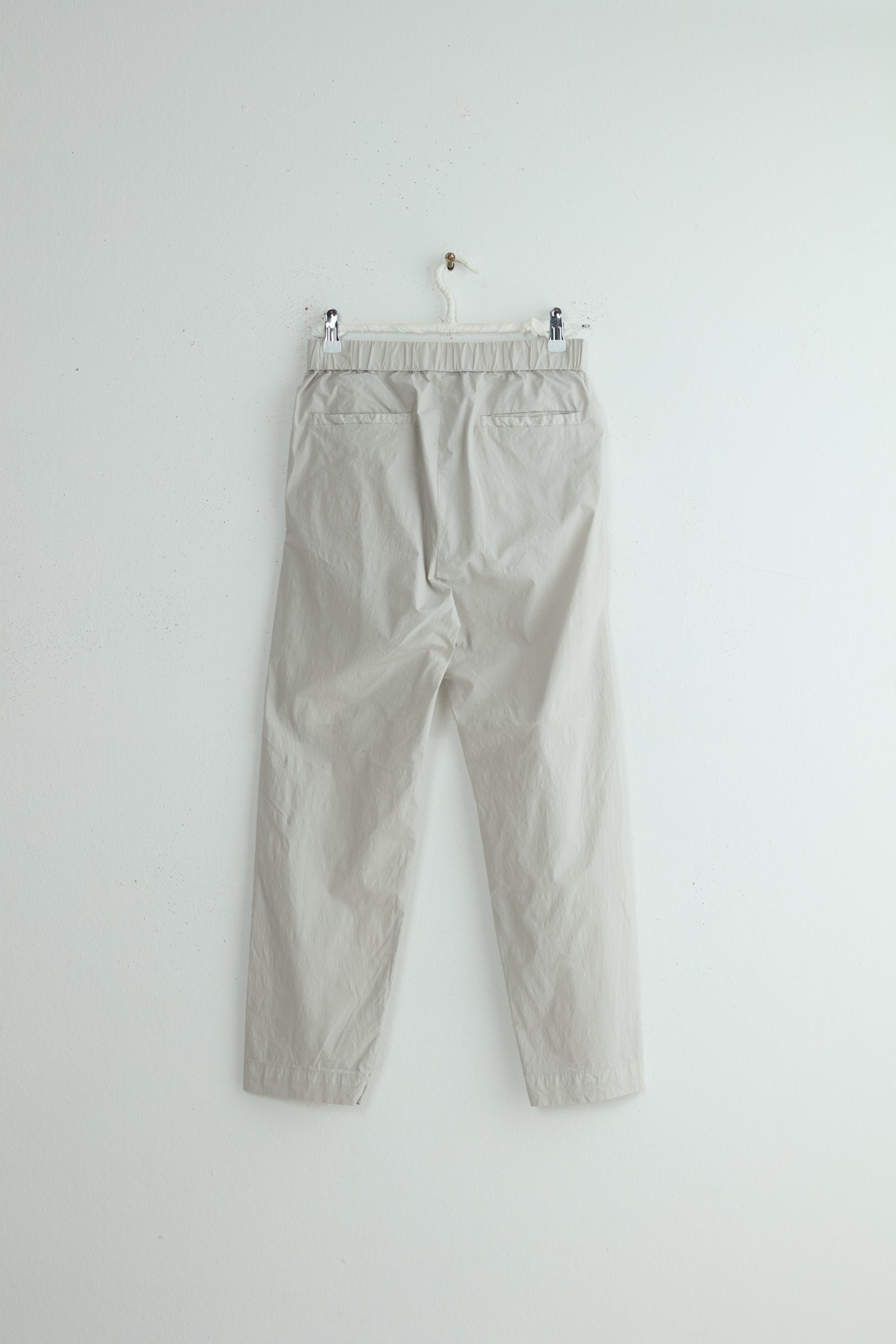 TOUJOURS Narrow Easy Trousers. Slim legged everyday trousers made of a lightweight cotton blend twill. A regular, tapered silhouette with an elastic waistband, mock fly with button fastening and both side slash pockets and back welt pockets.