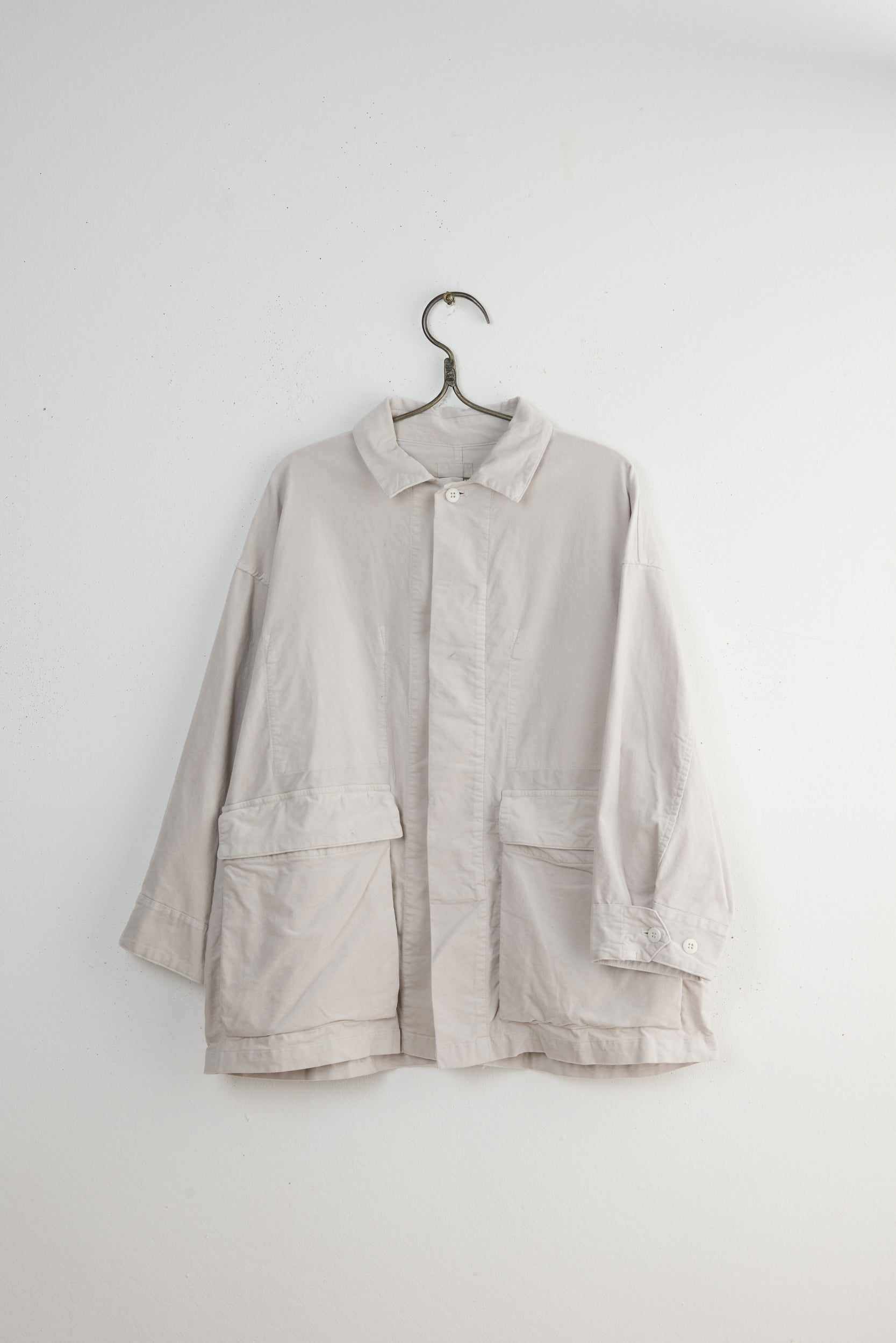 Coverall jacket by TOUJOURS. An oversized work jacket Made from a stretchy, lightweight cotton-viscose velvet. It has a relaxed, baggy fit with a small collar, hidden button placket, two exaggerated front flap pockets and two inner pockets.