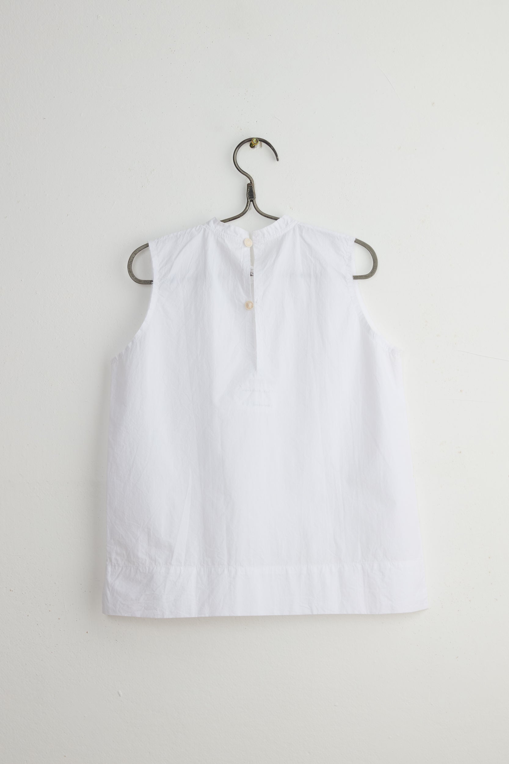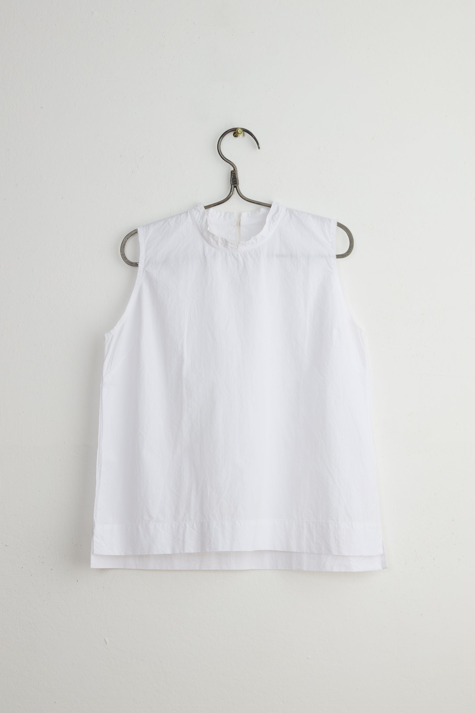 Andrea top by Maya Zukerman is a breezy sleeveless blouse made of thin Japanese paper cotton. Details include a split mandarin collar with a buttoned back slit, side slits and wide hems. Relaxed fit.