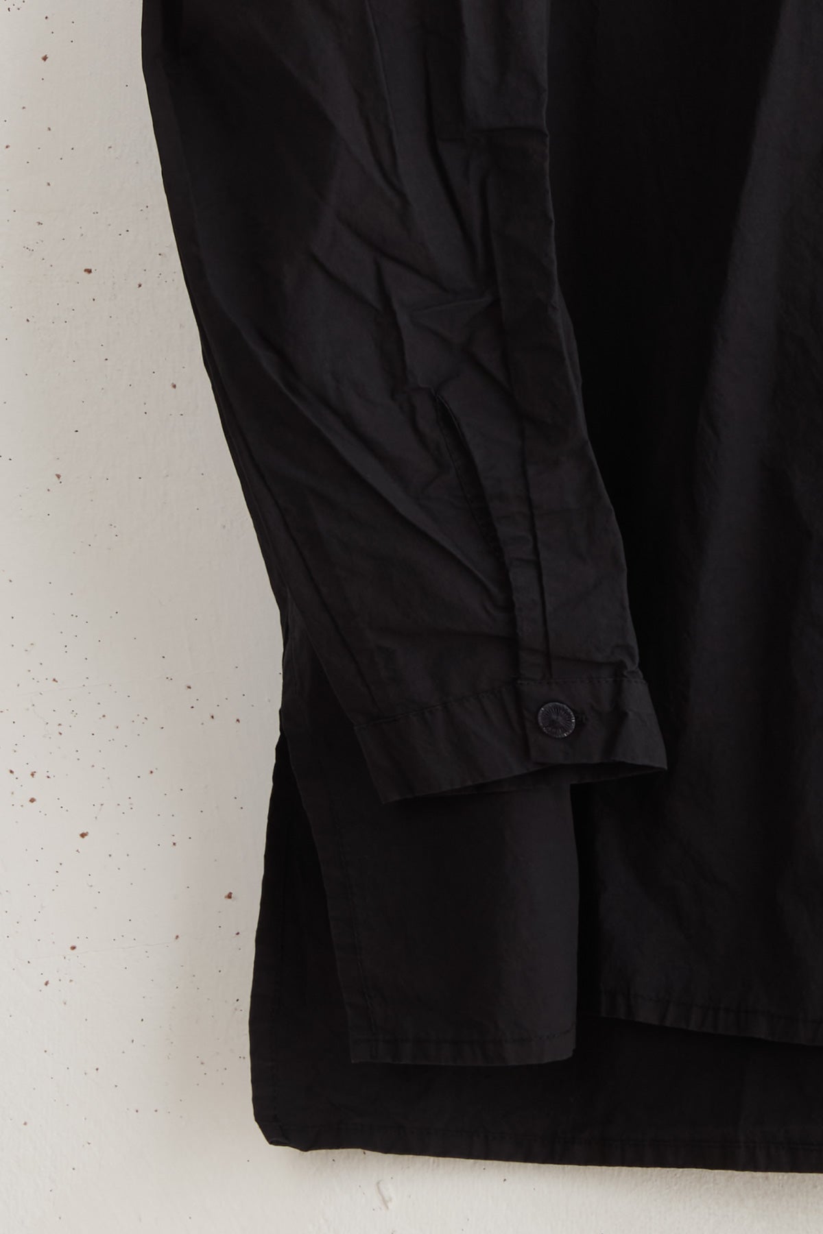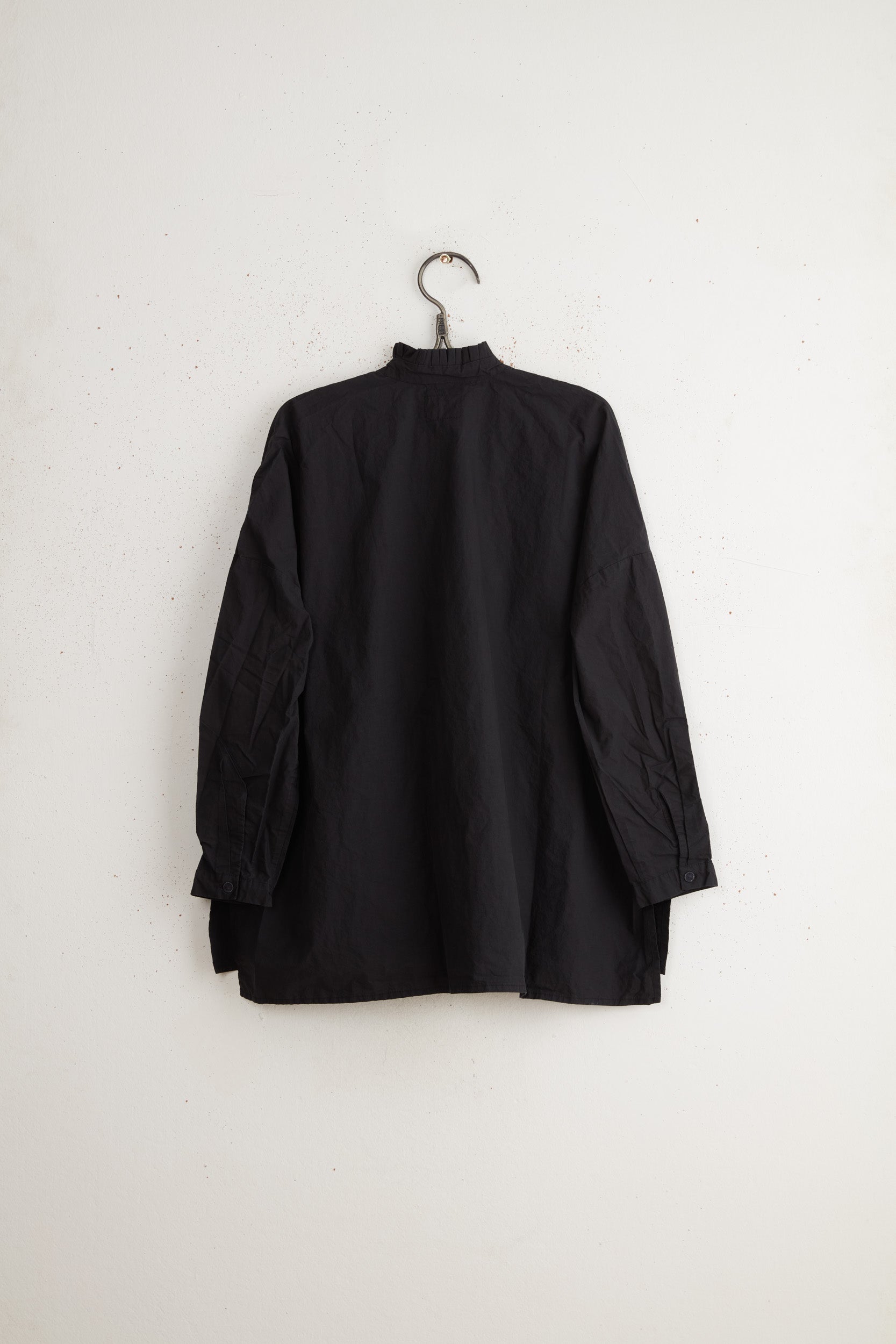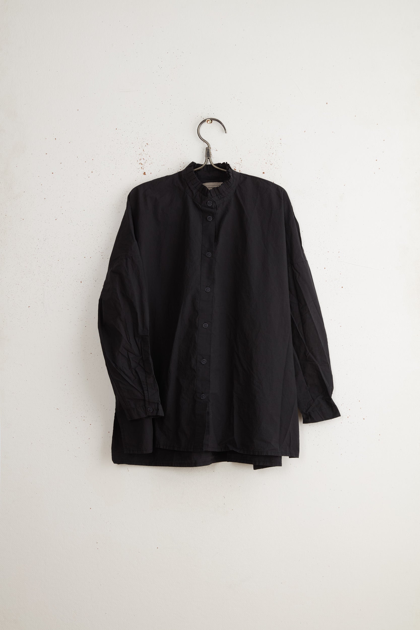 Anthony SLV shirt by Maya Zukerman is a light and crisp collar shirt made of 100% Japanese paper cotton. An oversized fit with a hand-stitched pleated stand collar. Deep, semi-closed side slits, slightly shorter on the front, hand-dyed Dorset button closure, and dropped shoulder.