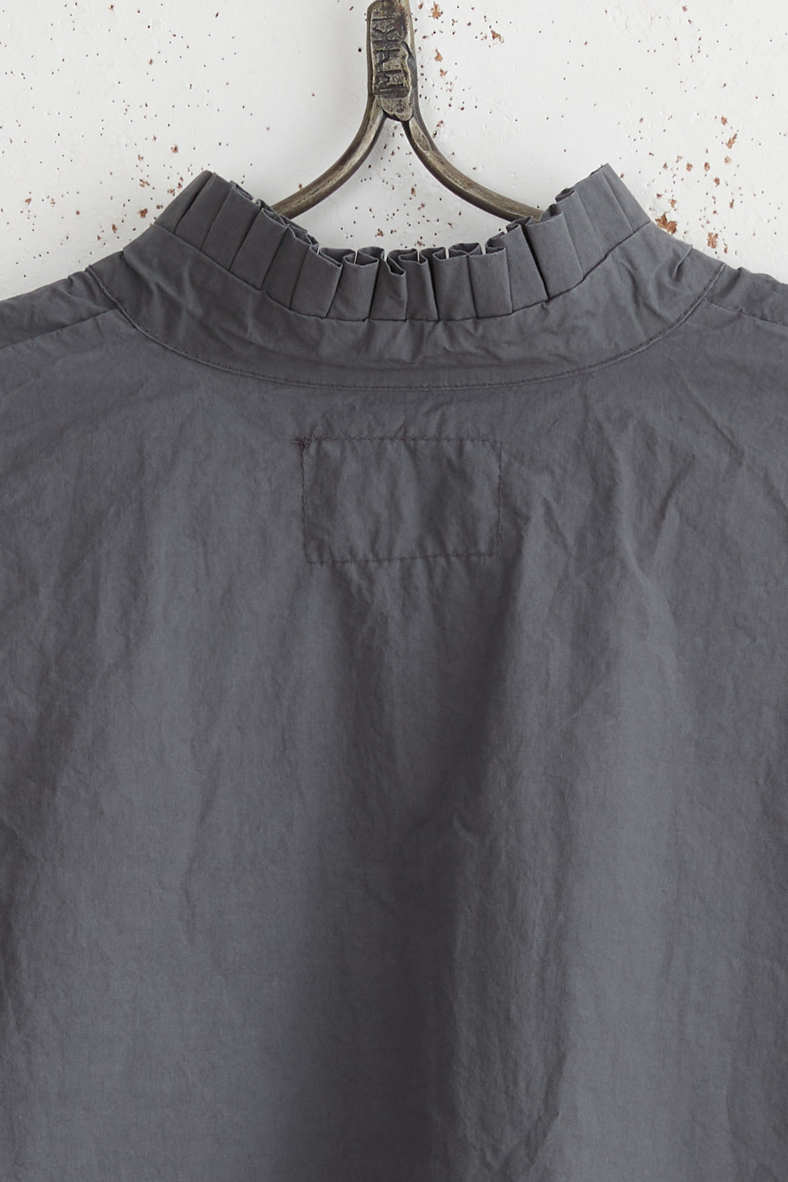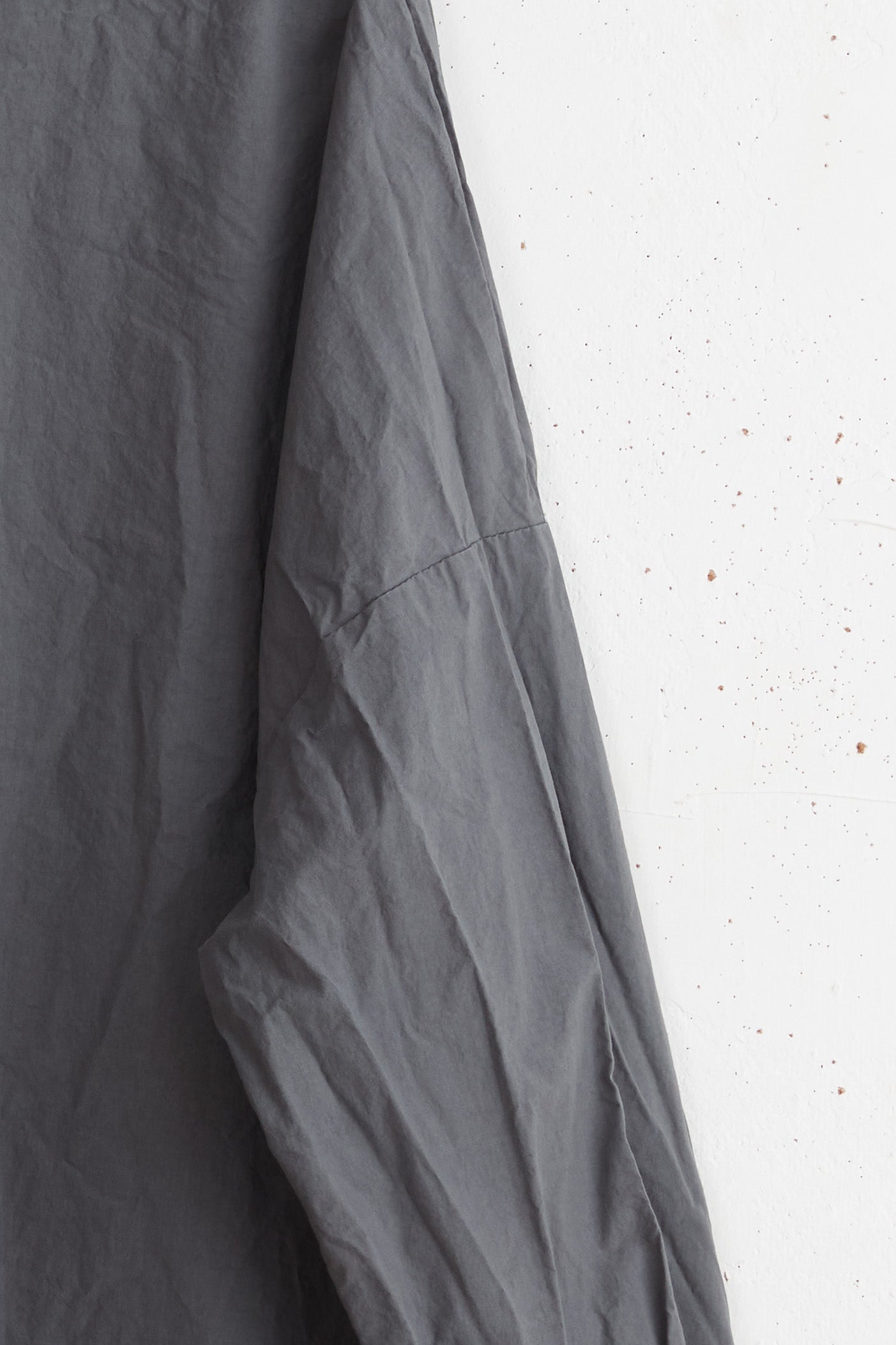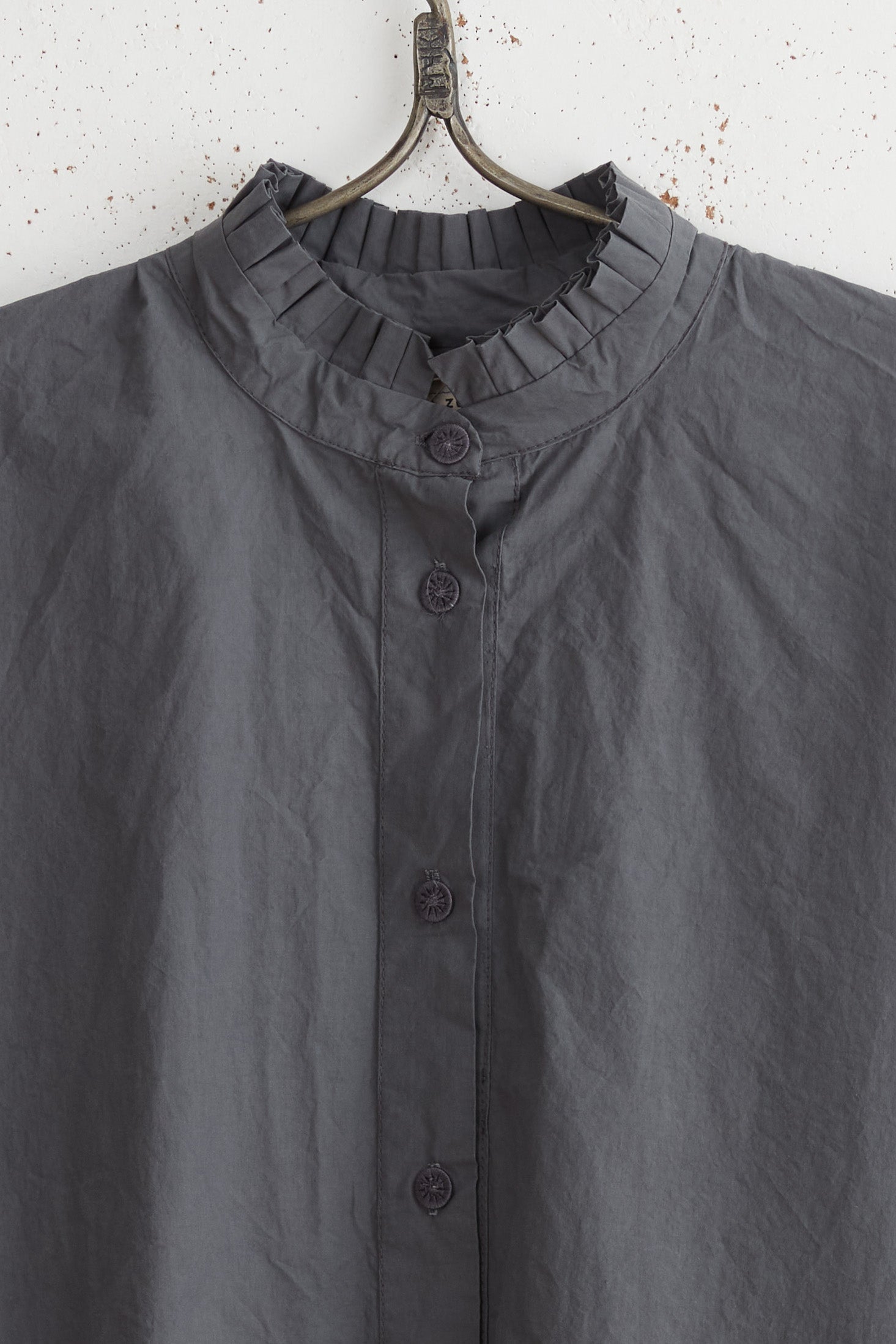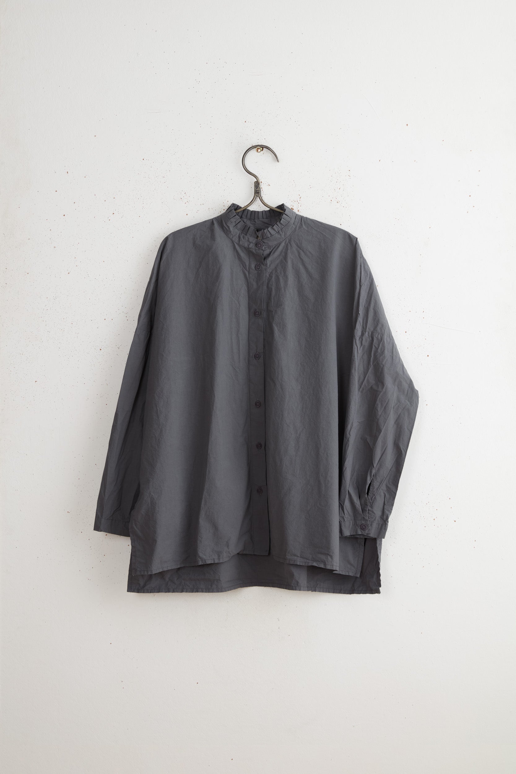 Anthony SLV shirt by Maya Zukerman is a light and crisp collar shirt made of 100% Japanese paper cotton. An oversized fit with a hand-stitched pleated stand collar. Deep, semi-closed side slits, slightly shorter on the front, hand-dyed Dorset button closure, and dropped shoulder.