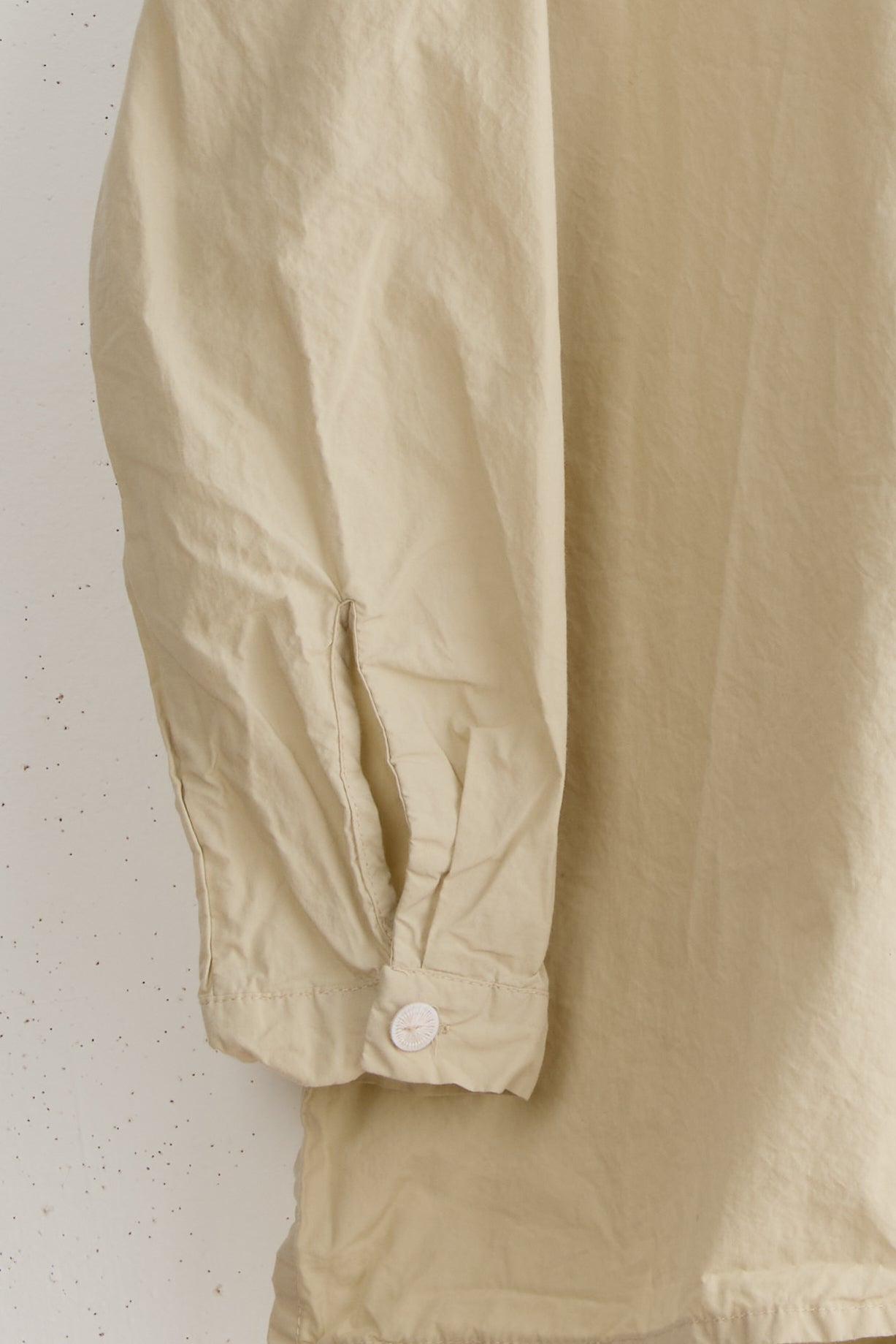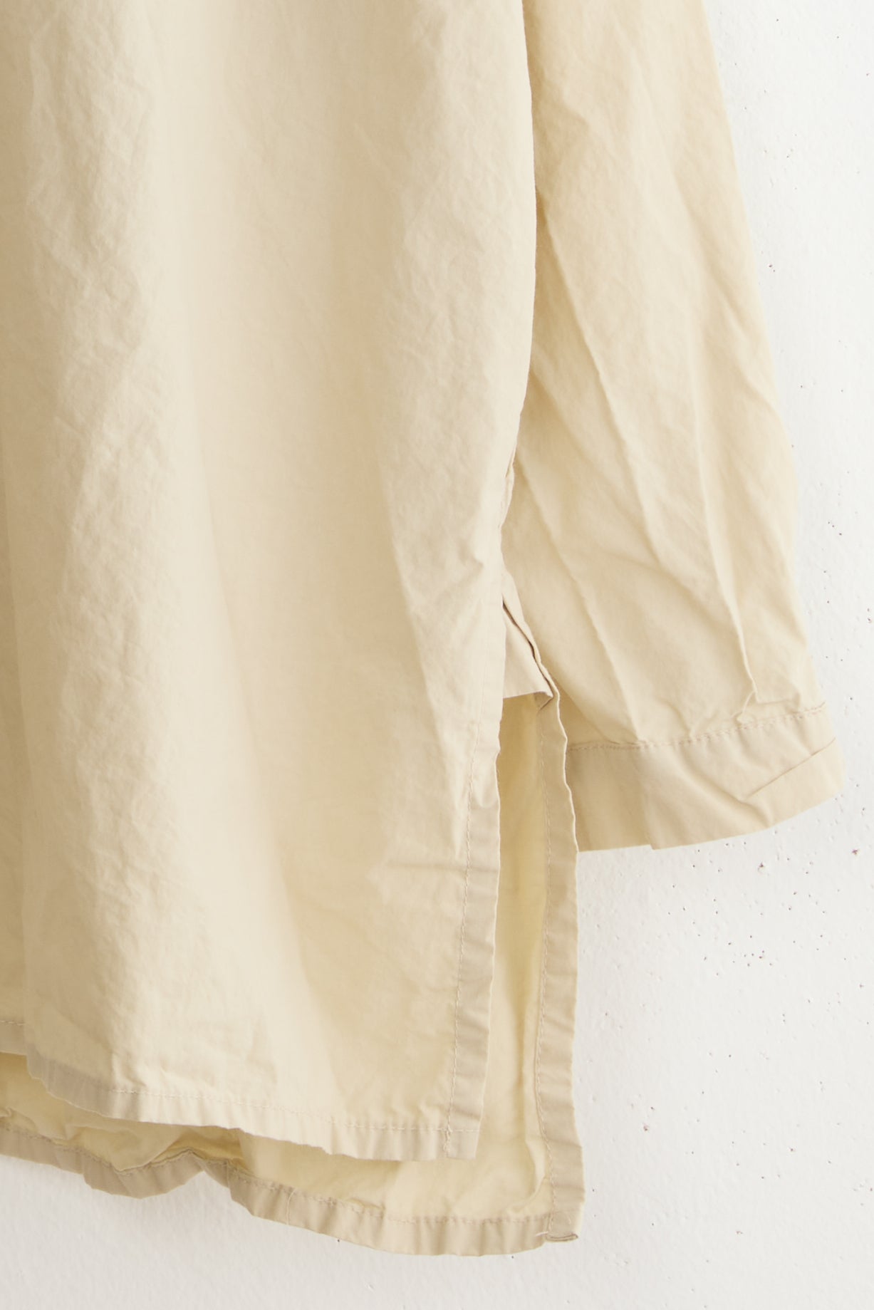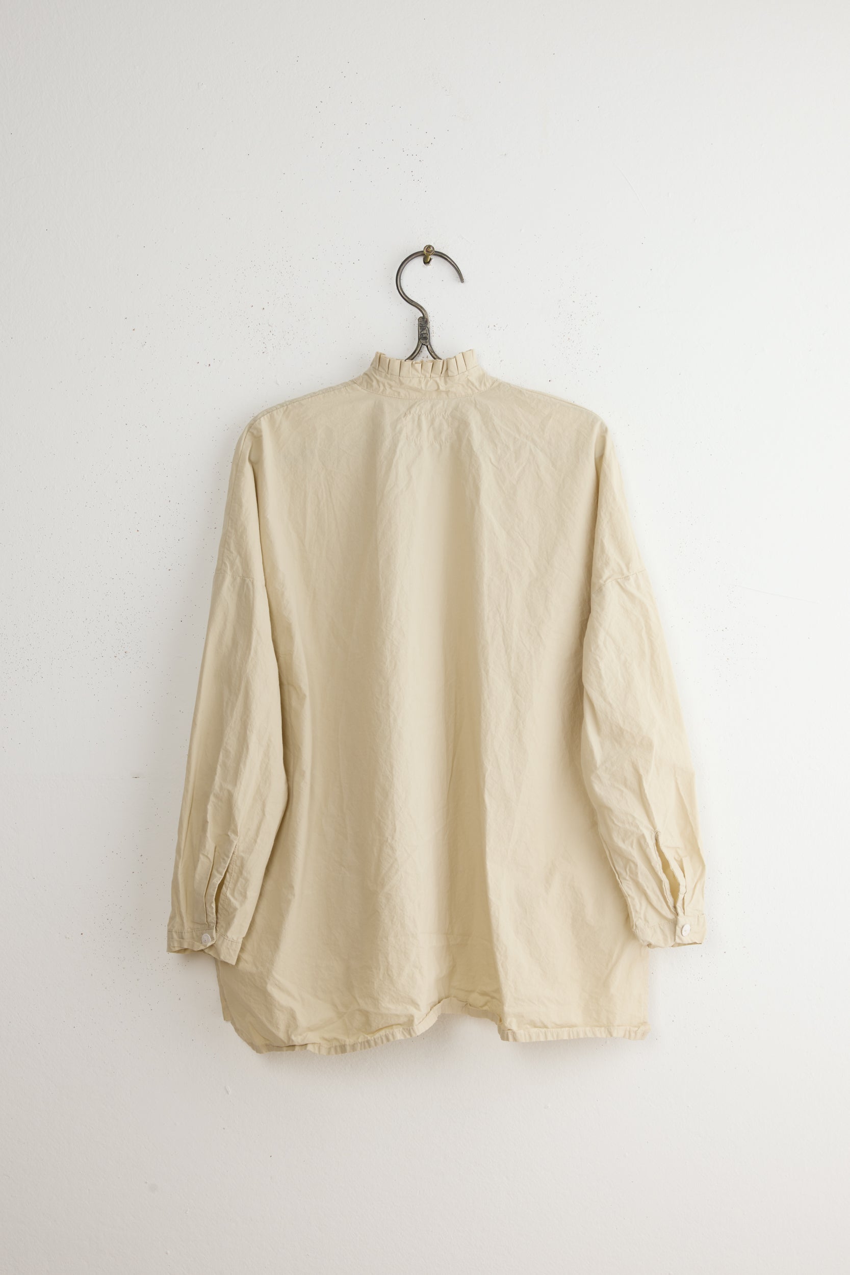 Anthony SLV shirt by Maya Zukerman is a light and crisp collar shirt made of 100% Japanese paper cotton. An oversized fit with a hand-stitched pleated stand collar. Deep, semi-closed side slits, slightly shorter on the front, hand-dyed Dorset button closure, and dropped shoulder.