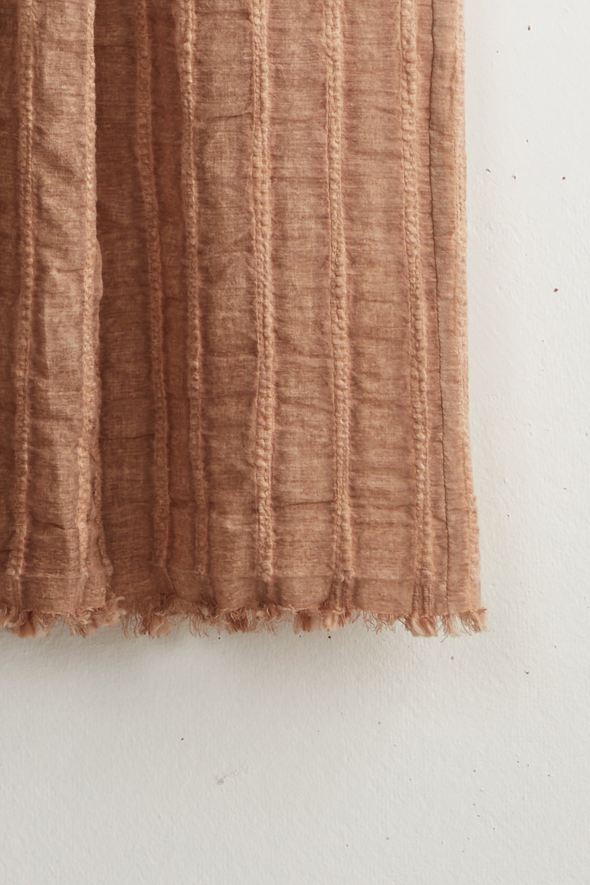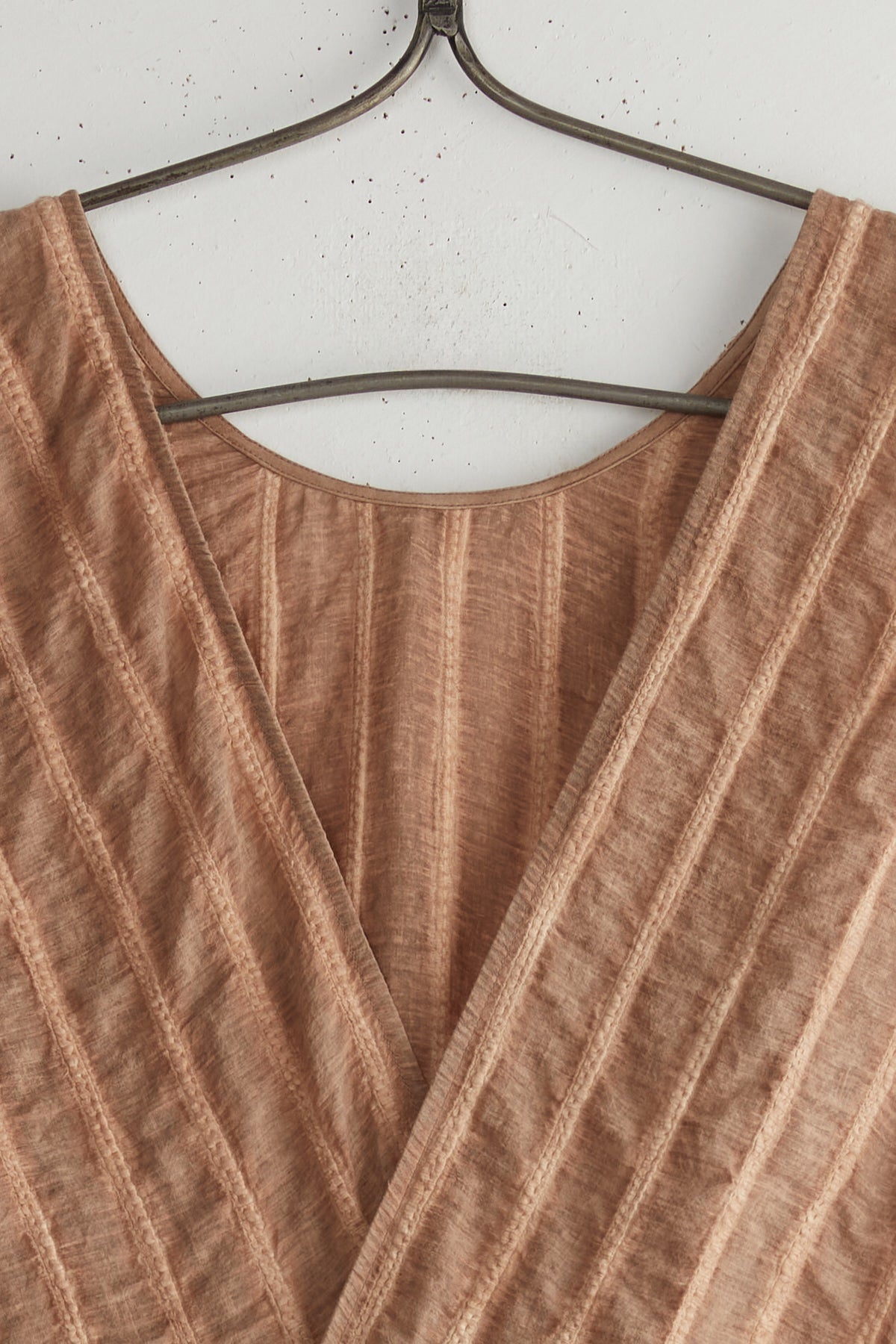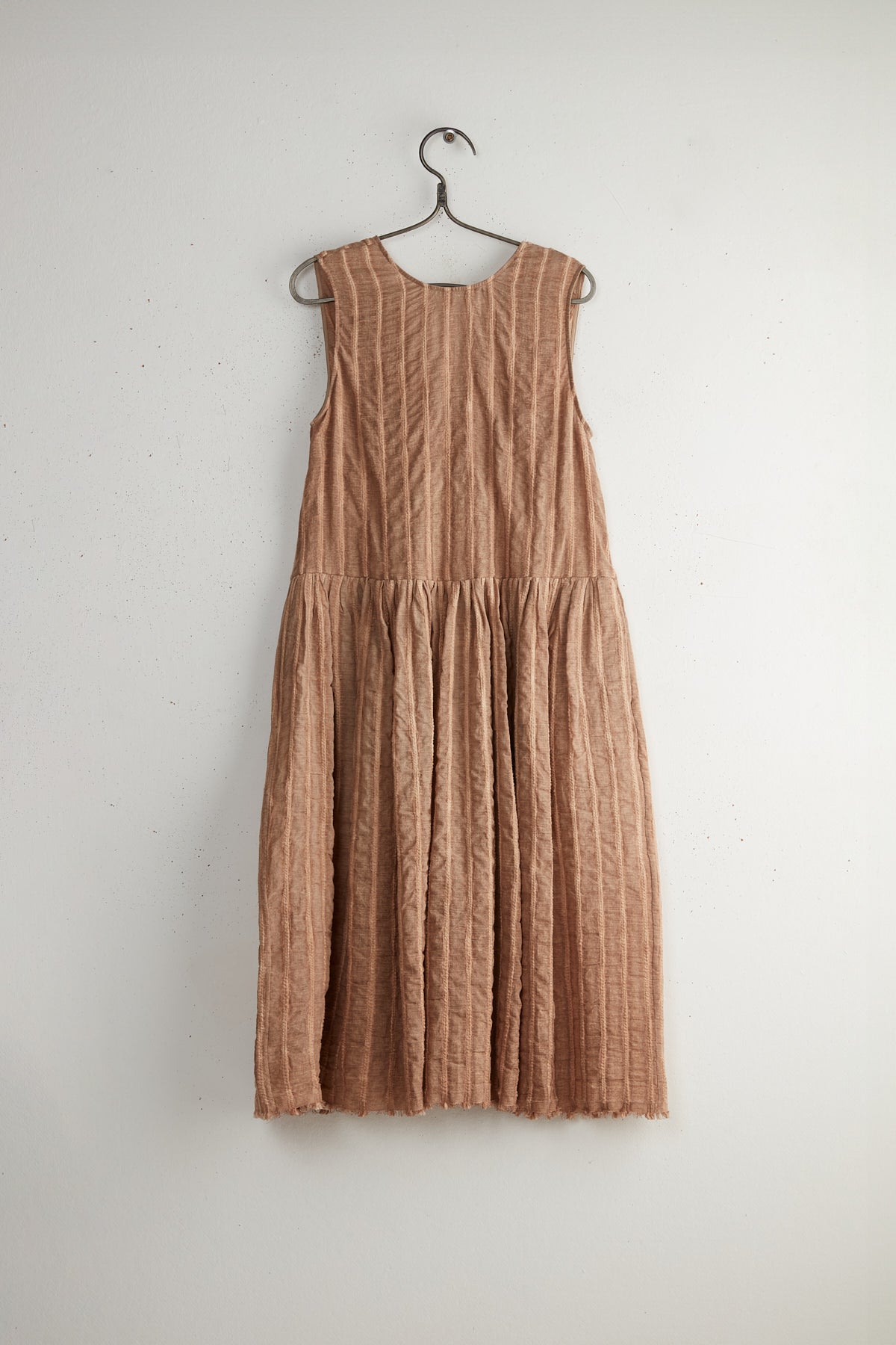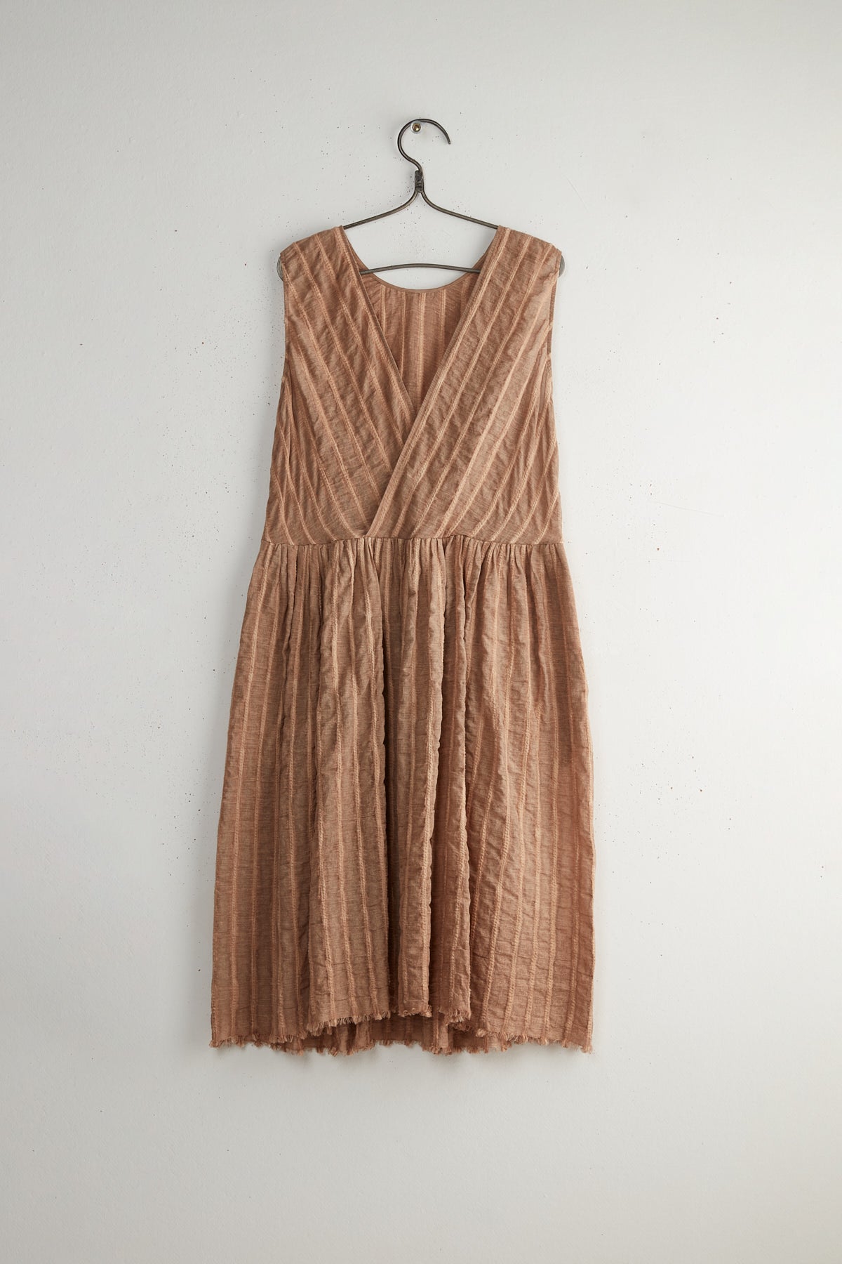 Ardel dress from the house of Chinese designer Uma Wang. Light weight sleeveless dress with a round neckline, open crossed back, raw hems and gathered details at waistline. The striped embroidered pattern creates a unique texture to this flowy relaxed mid-length dress. Our tip: can be worn on both sides.