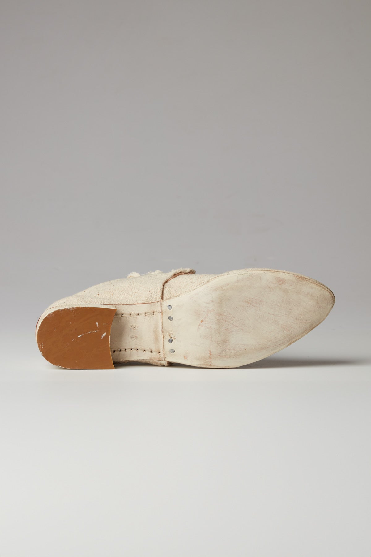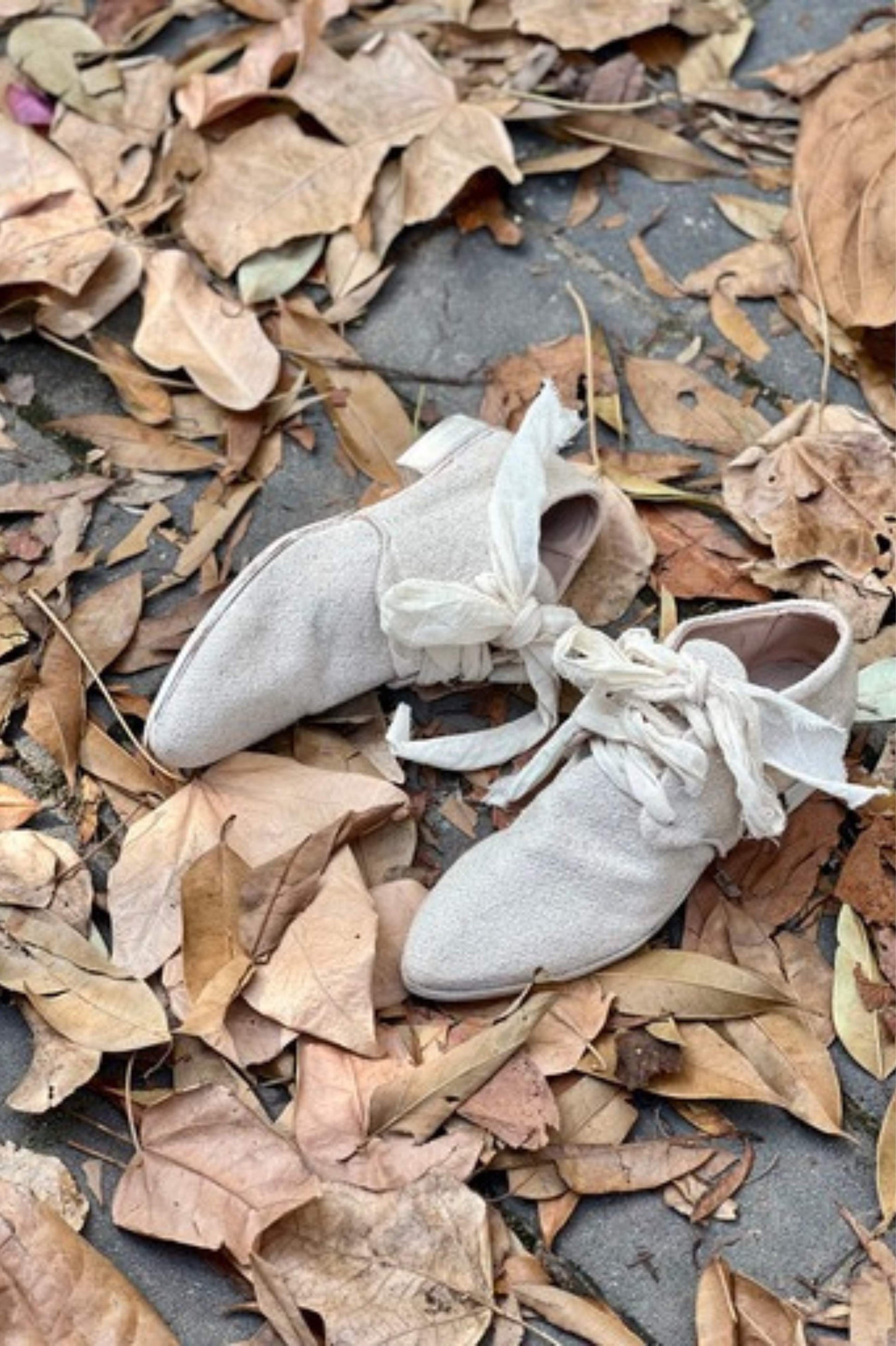 Linen ore shoes by Atelier Inscrire. Calfskin lined upper with woven linen overlay, pointed toe, tonal gauze laces. Crafted with vegetable-tanned leather soles, and stitched with waxed thread. Heels are made of polished wood with a natural rubber cover.