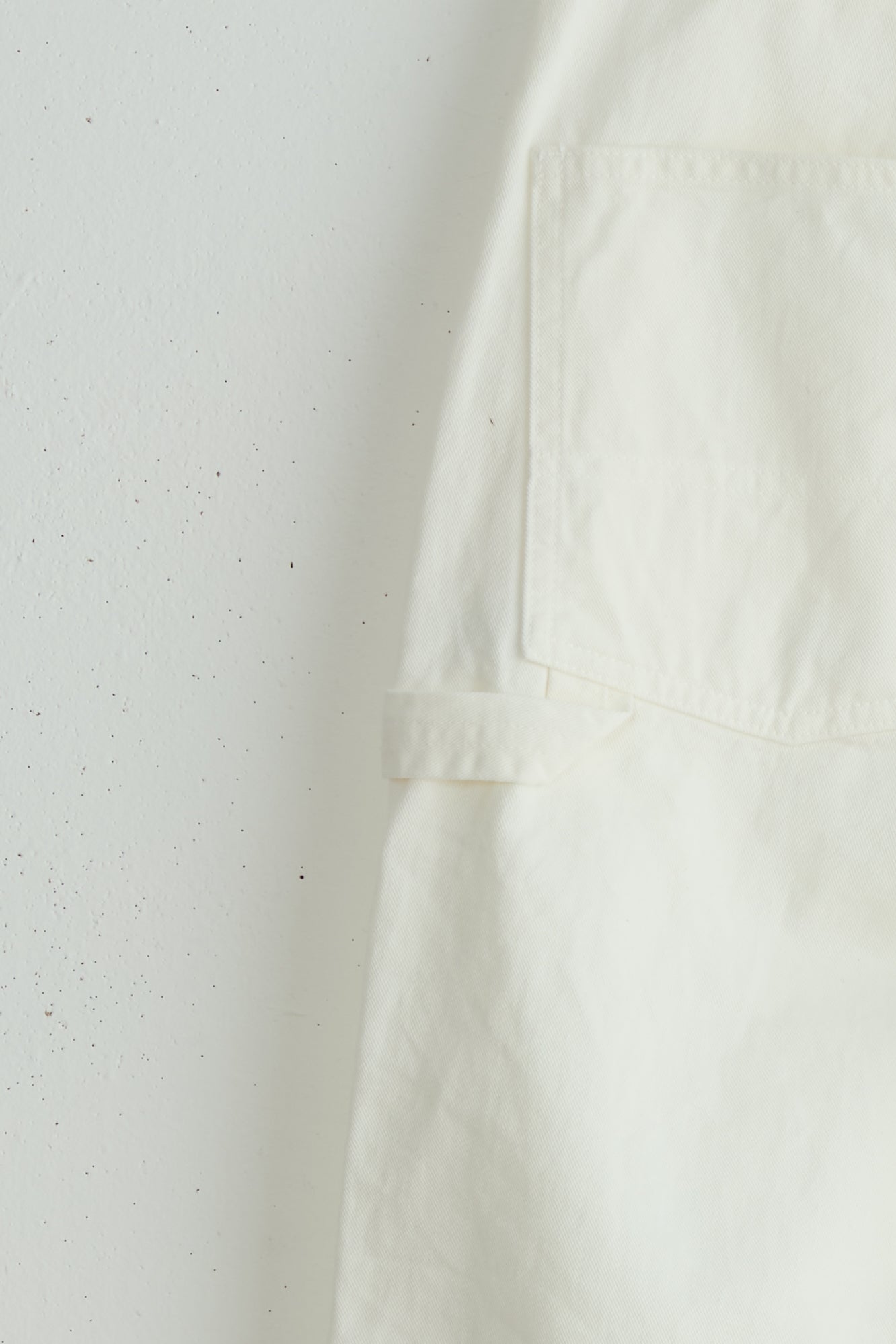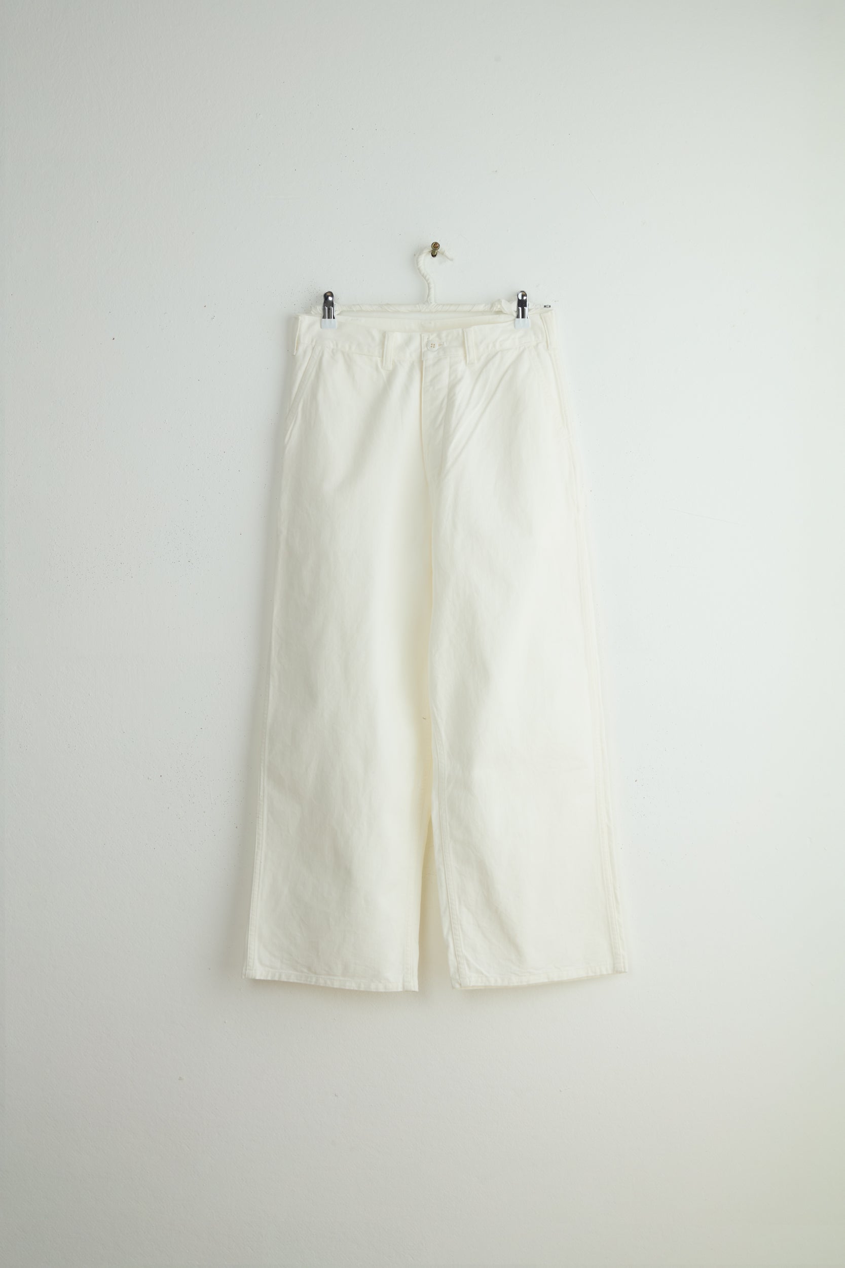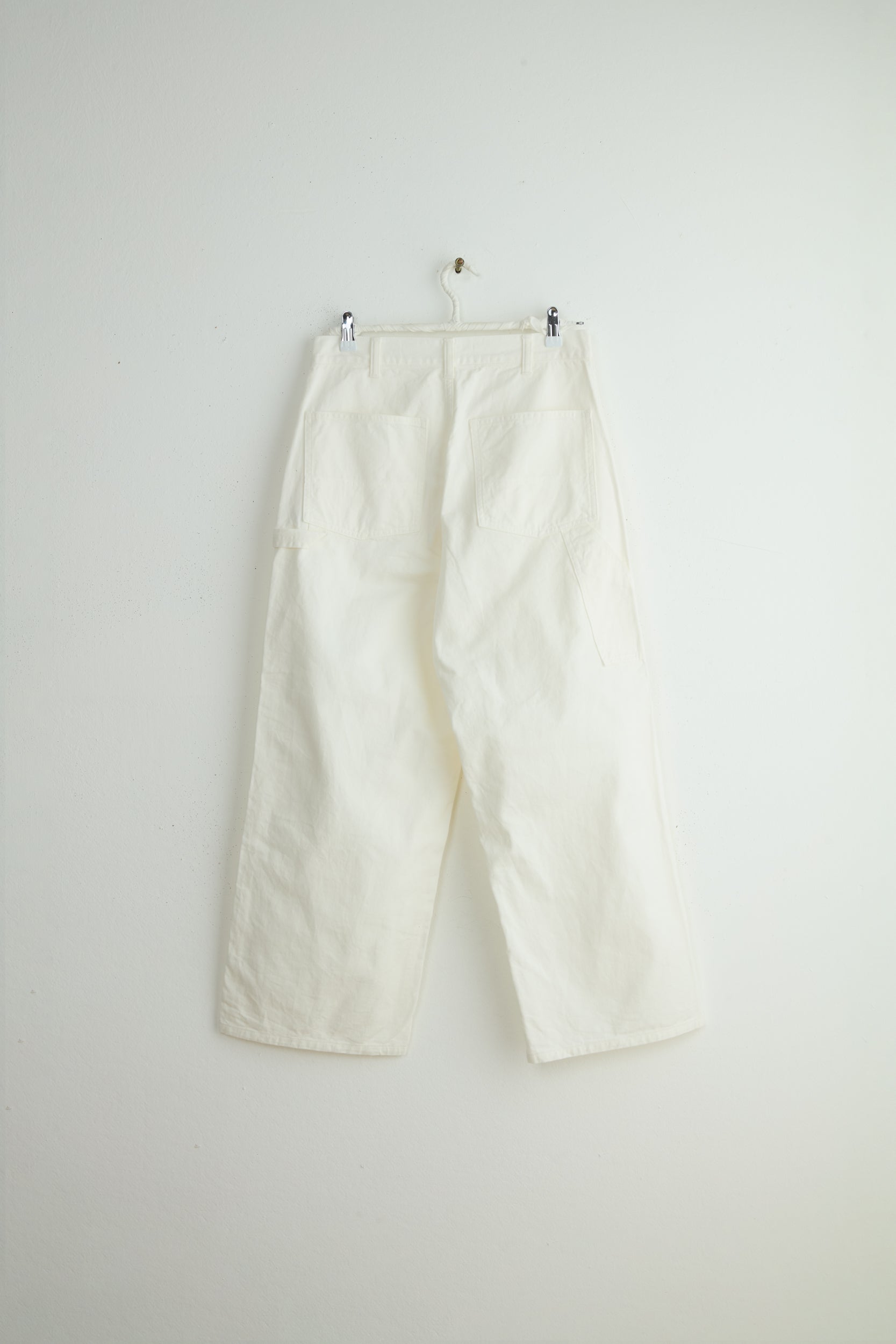 Classic painter pants by TOUJOURS. wide leg workpants made of lightweight cotton denim with a crinkle effect. Relaxed, high rise silhouette with button-fly closure, belt loops, slanted side pockets, patch back pockets, carpenter pocket at the right leg and hammer loop at the left.