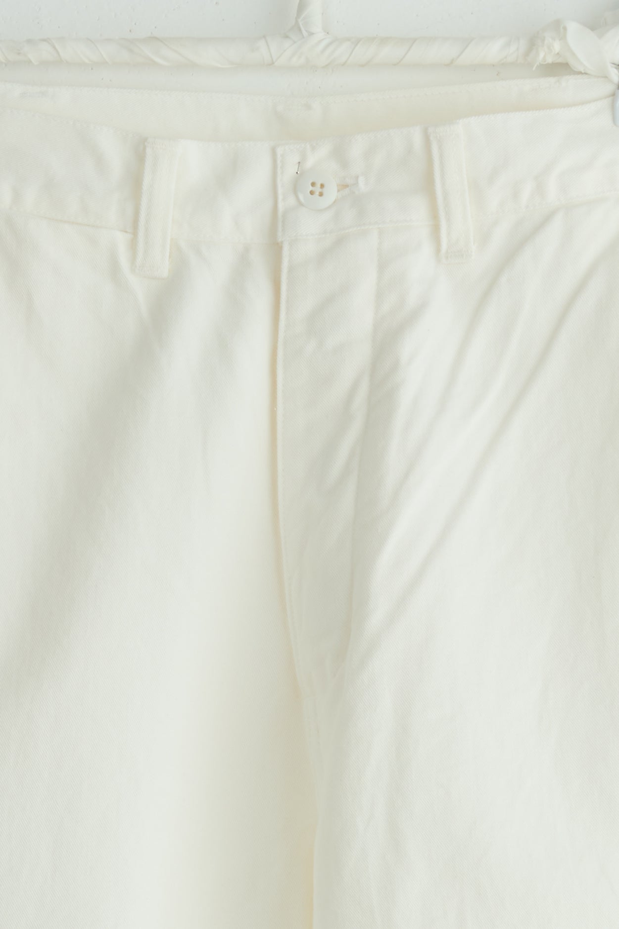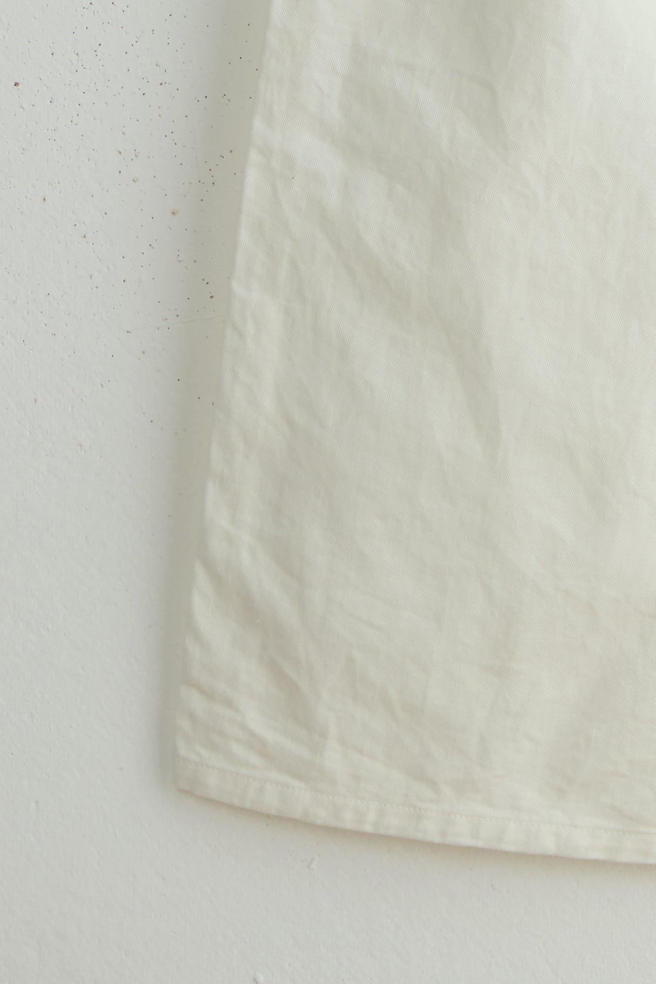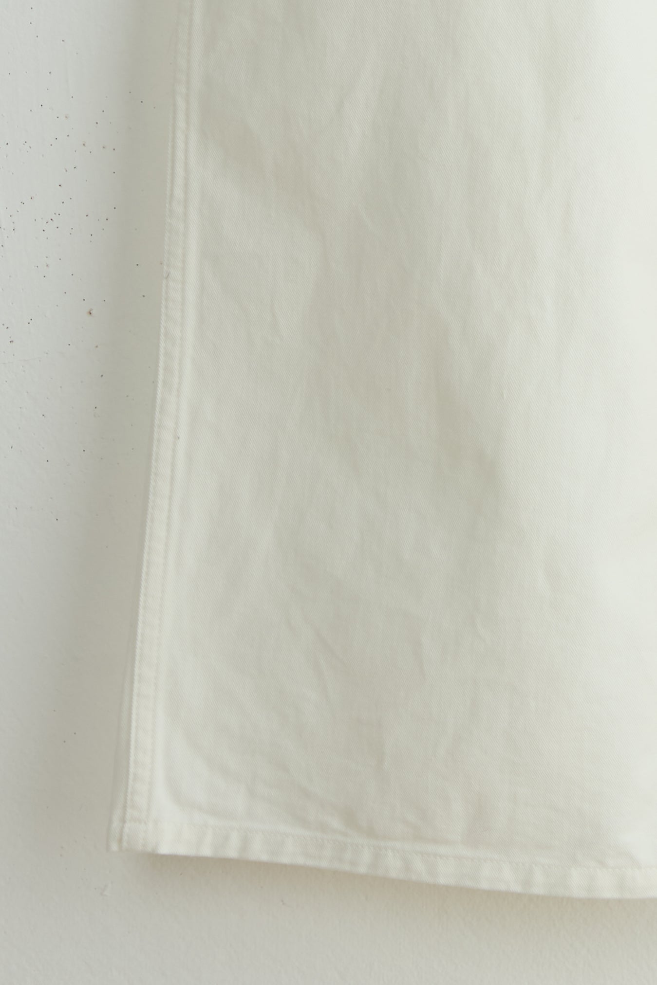 Classic painter pants by TOUJOURS. wide leg workpants made of lightweight cotton denim with a crinkle effect. Relaxed, high rise silhouette with button-fly closure, belt loops, slanted side pockets, patch back pockets, carpenter pocket at the right leg and hammer loop at the left.