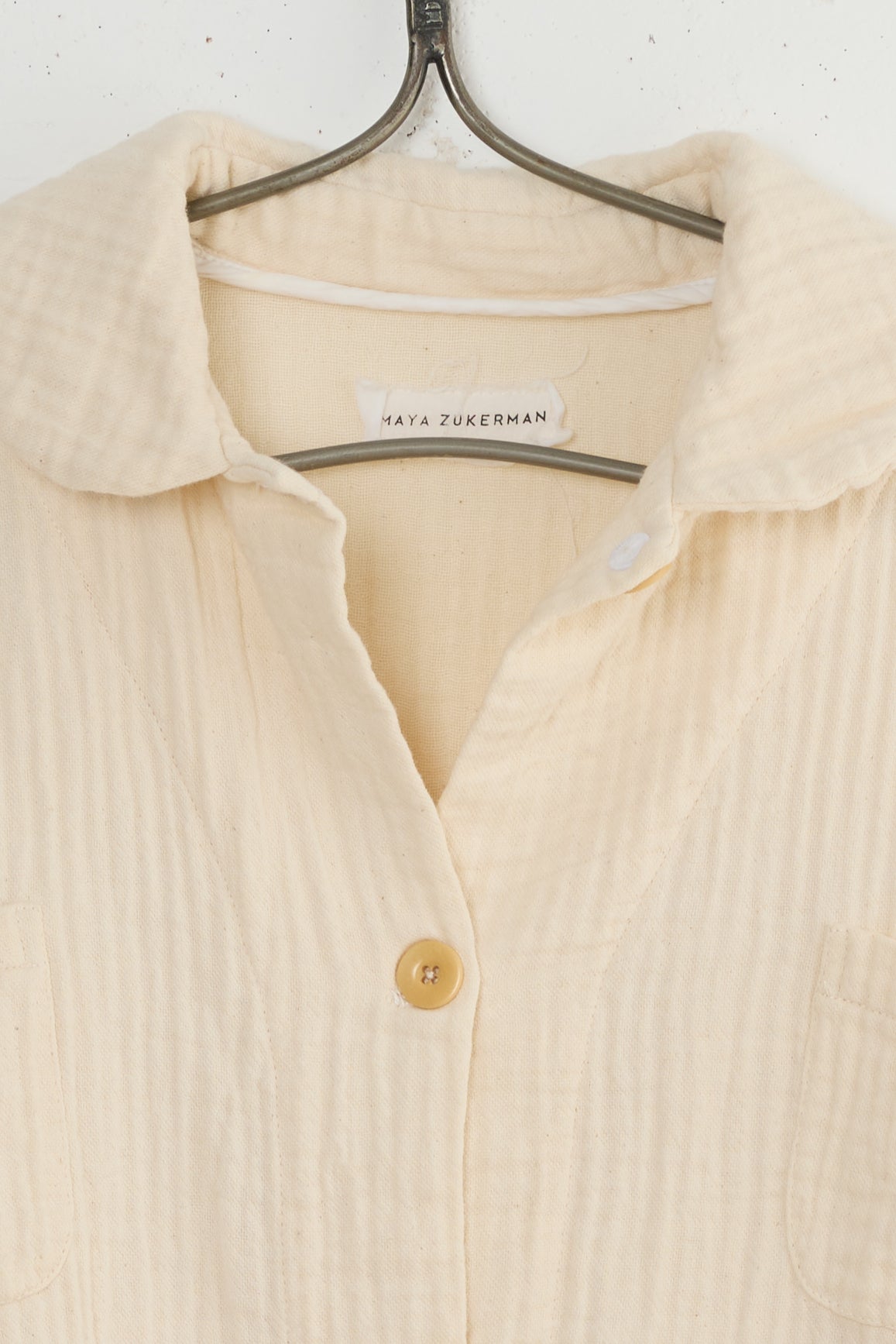 Bonn jacket by Maya Zukerman. A short and light-weight shirt jacket made from soft, textured triple guaze cotton cloth. Relaxed fit with a round collar, dropped shoulders, a shorter front side and three front patch pockets. Features Corozo buttons, hand embroidered button holes and side slits.