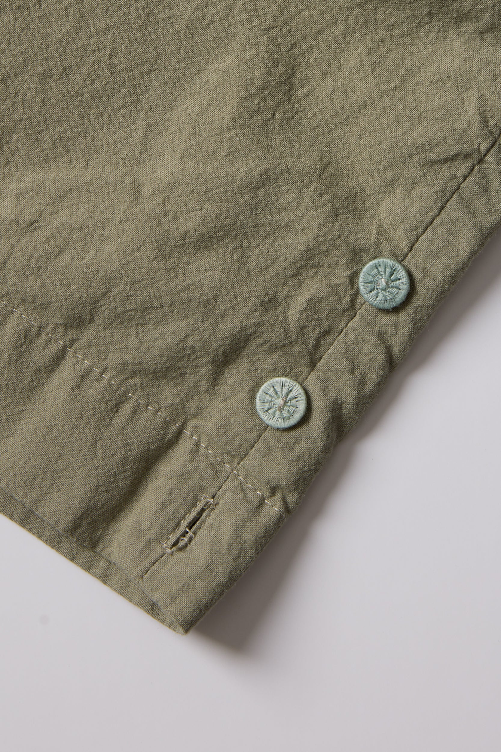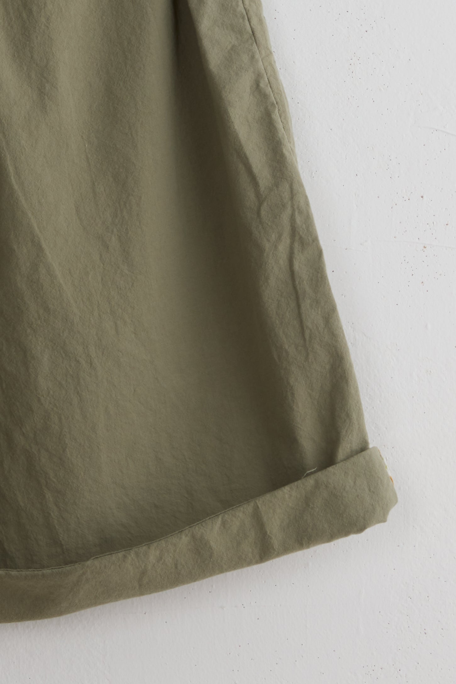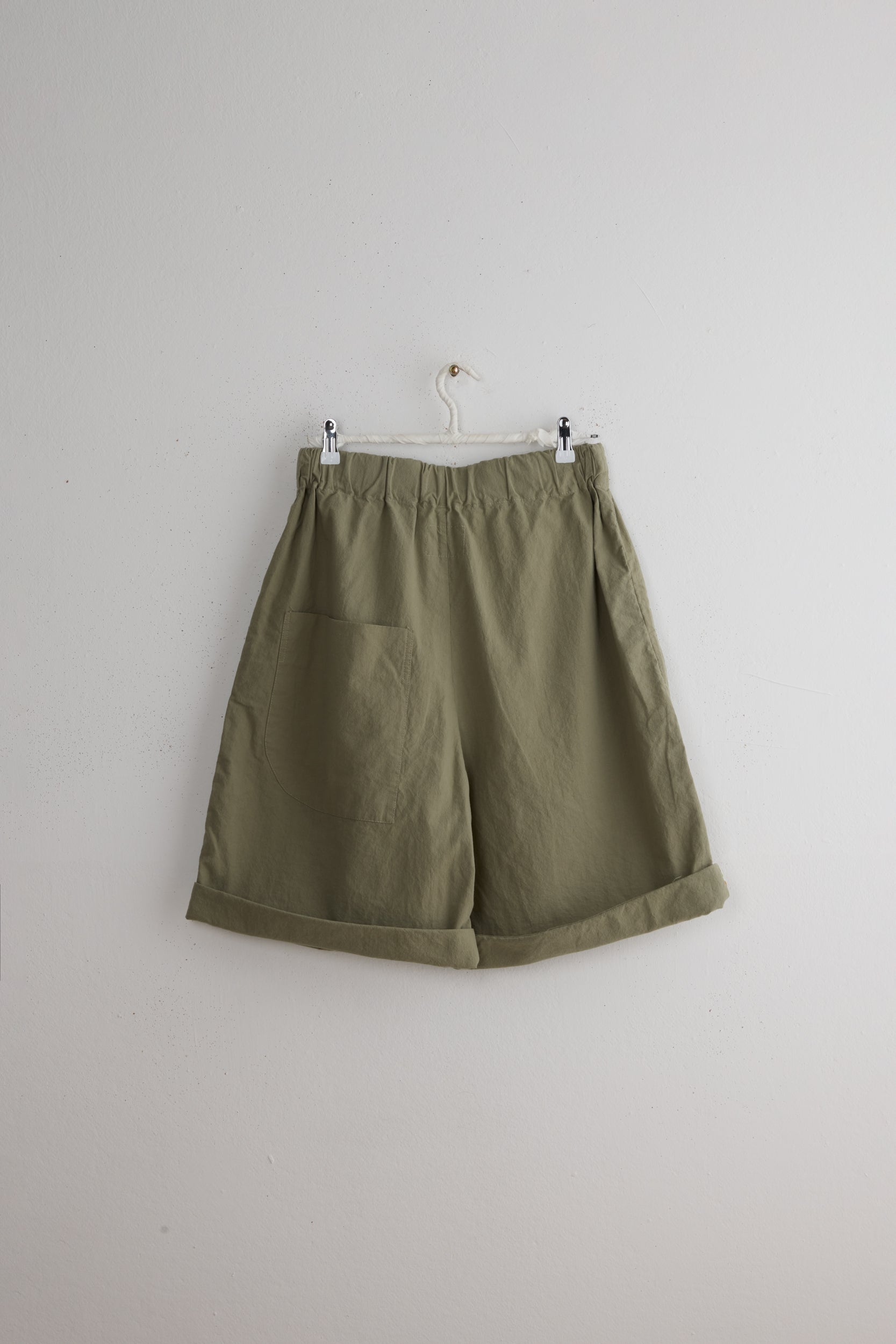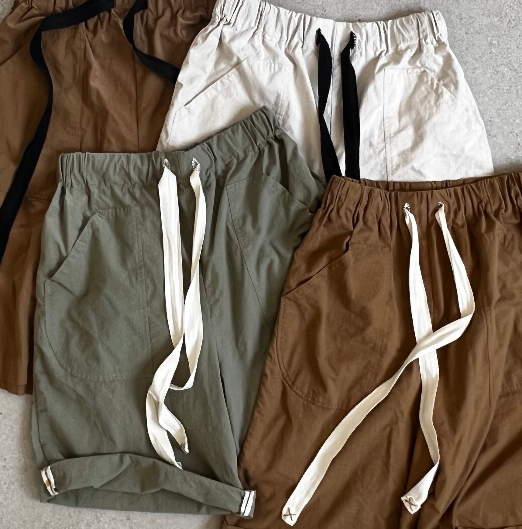 Charlie bermuda shorts by Maya Zukerman. Long and wide bermudas made from soft mid-weight cotton perfect for summer. Wide leg, oversized fit with an elastic waist, colorful ribbon finish inside, two workwear style front patch pockets and a big rectangular one at the back. the waist is laced with a super long drawstring and decorated with hand stitched details. these shorts can be worn in three different lengths - regularly below the knee, folded once or twice. the length can be adjusted with two buttons on the sides of each leg.