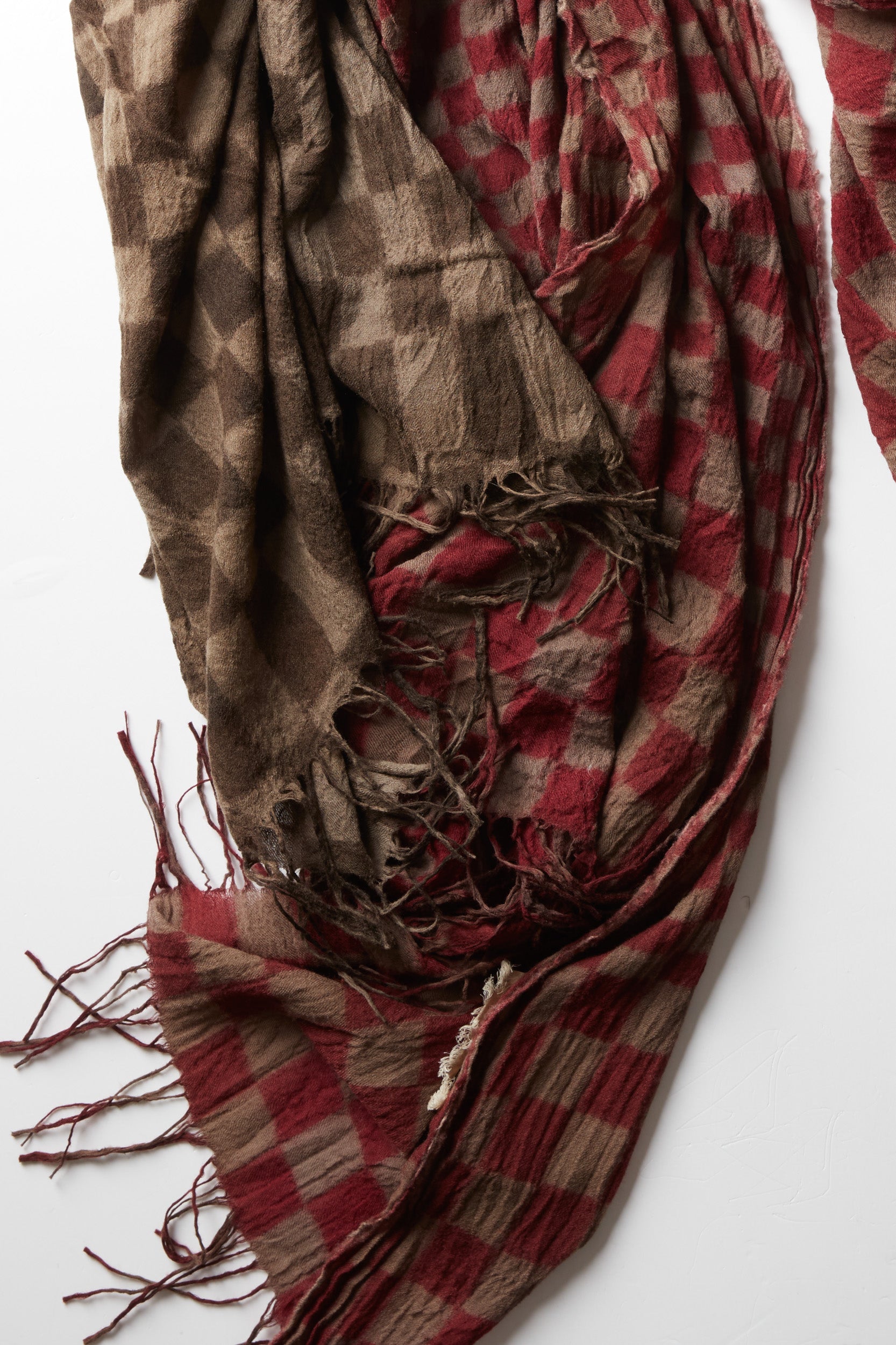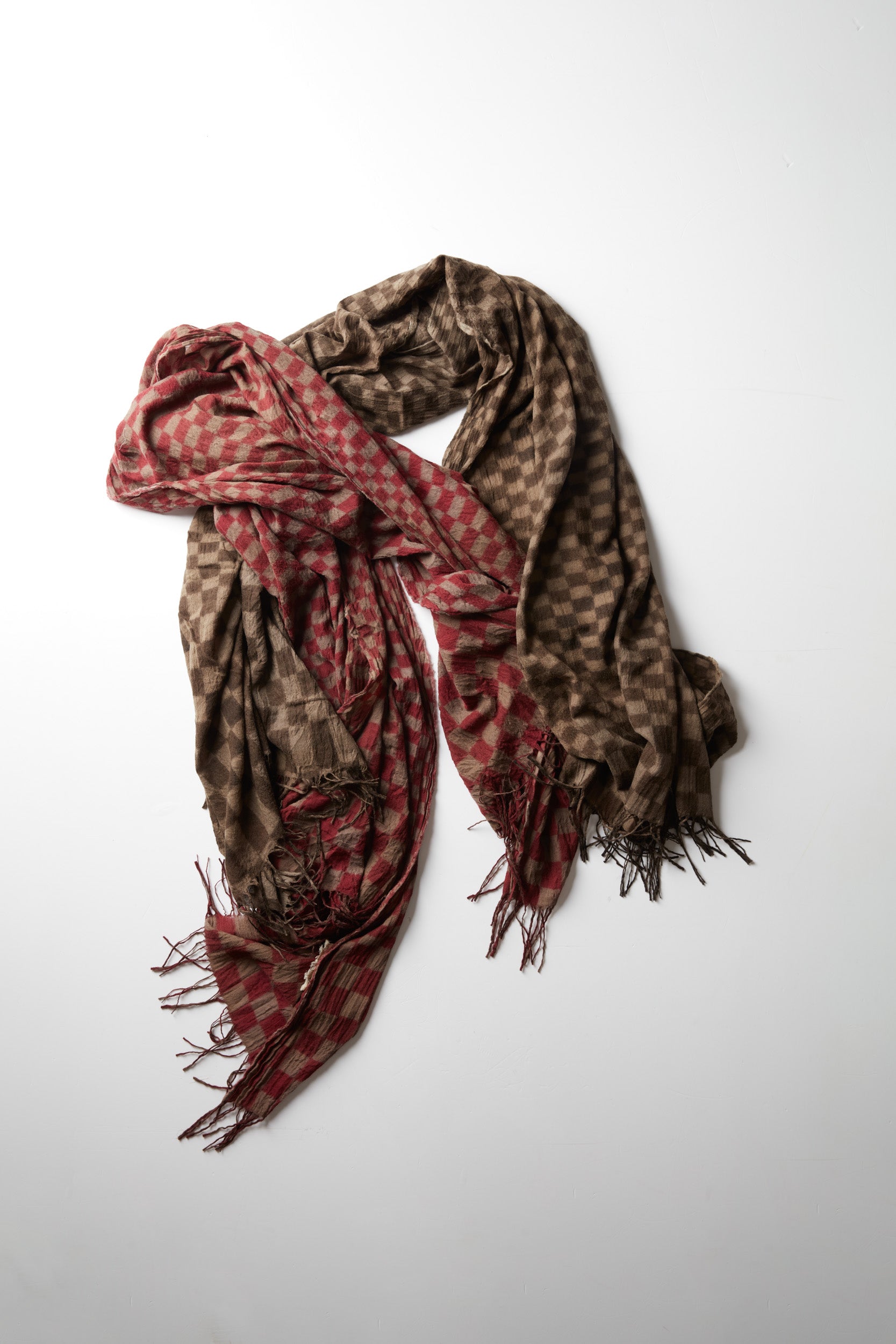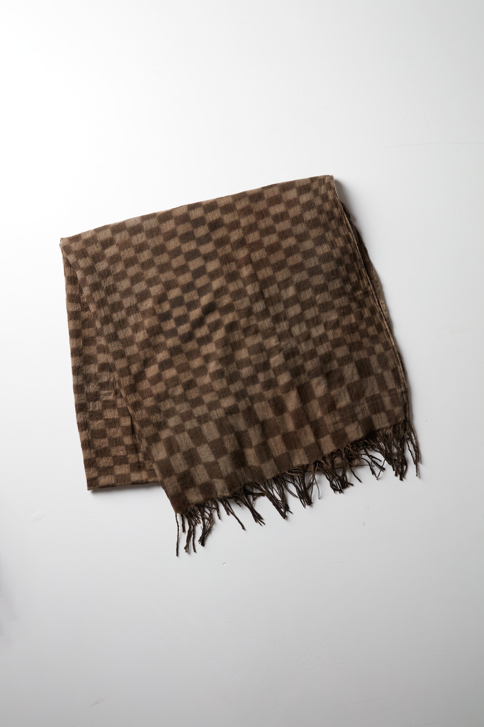 Check scarf from the house of Chinse designer Uma Wang. 100% virgin wool long scarf (51x86) with a grey brown check print and fringed edges. A slightly crinkled texture.