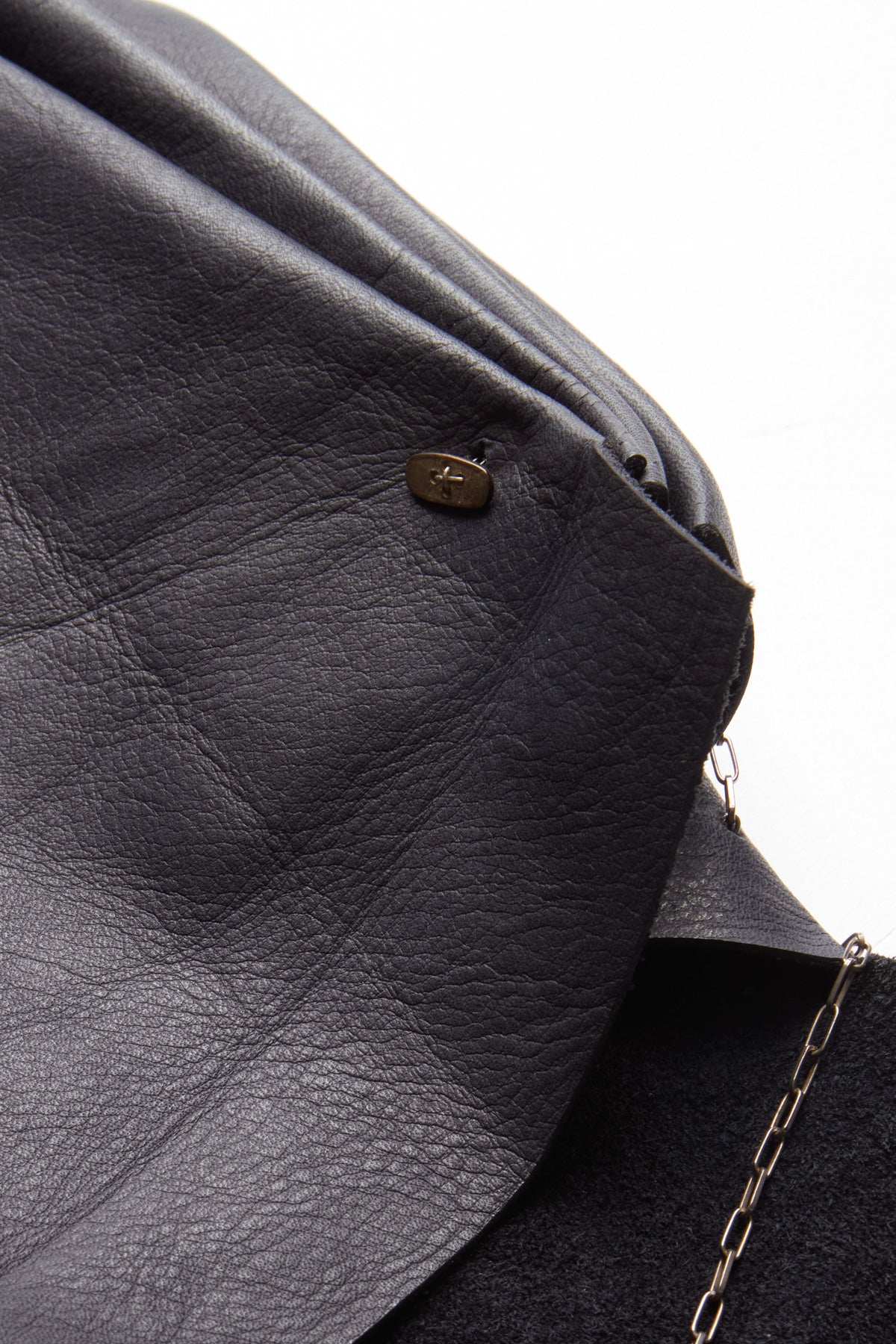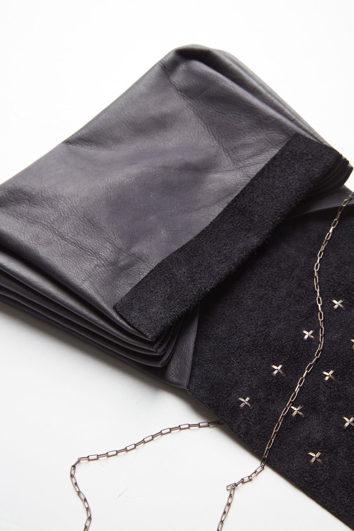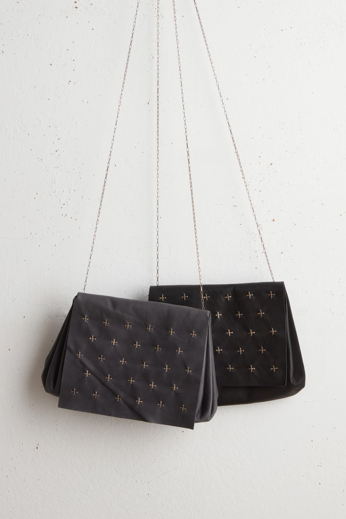 Cross Studded XS Accordion handbag by m.a+. Handmade in Italy out of Cow leather, this sling bag has a Signature rectangular shape with accordion-like expanding folds on the sides, the Signature silver cross detail on the flap, and a silver chain strap.
