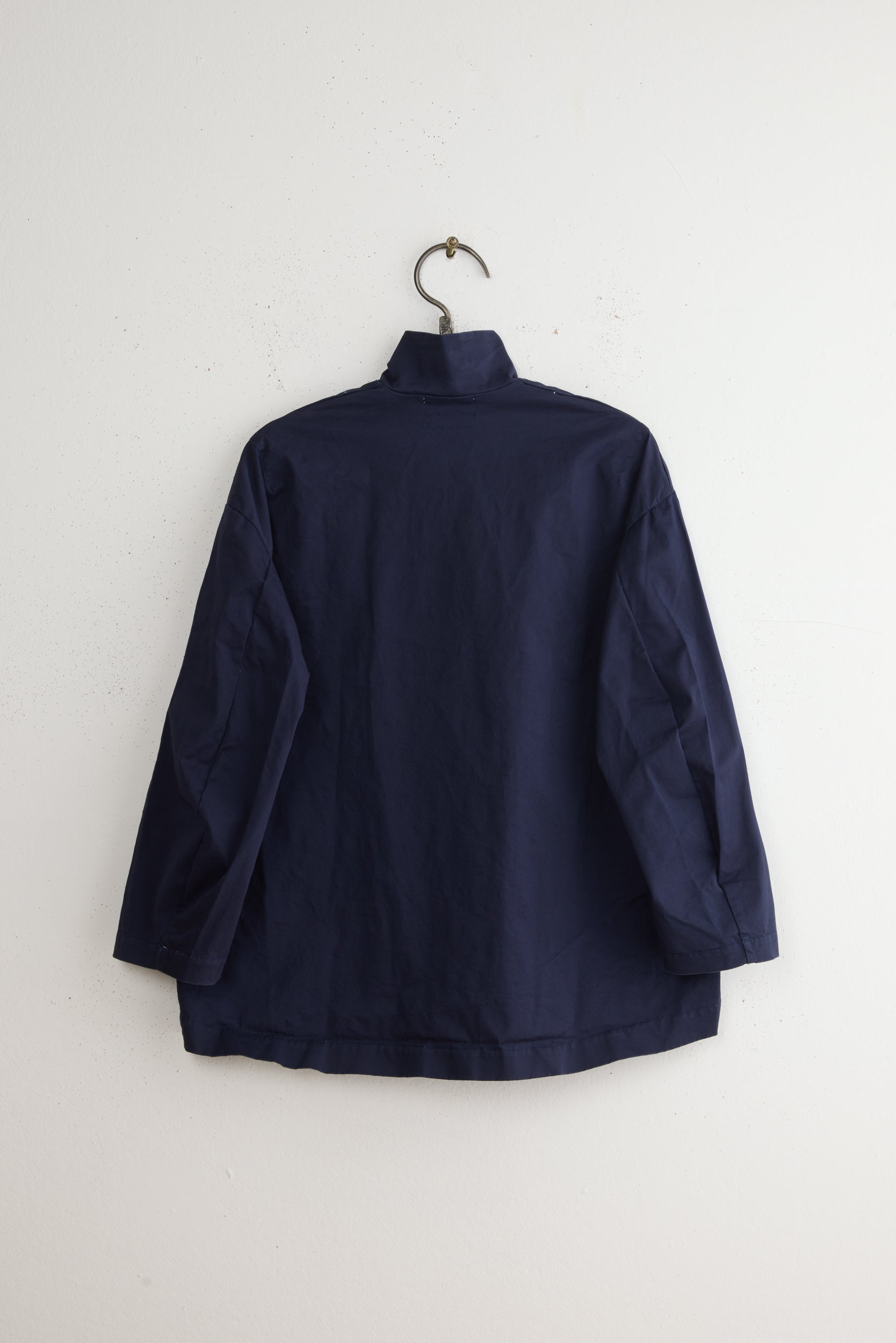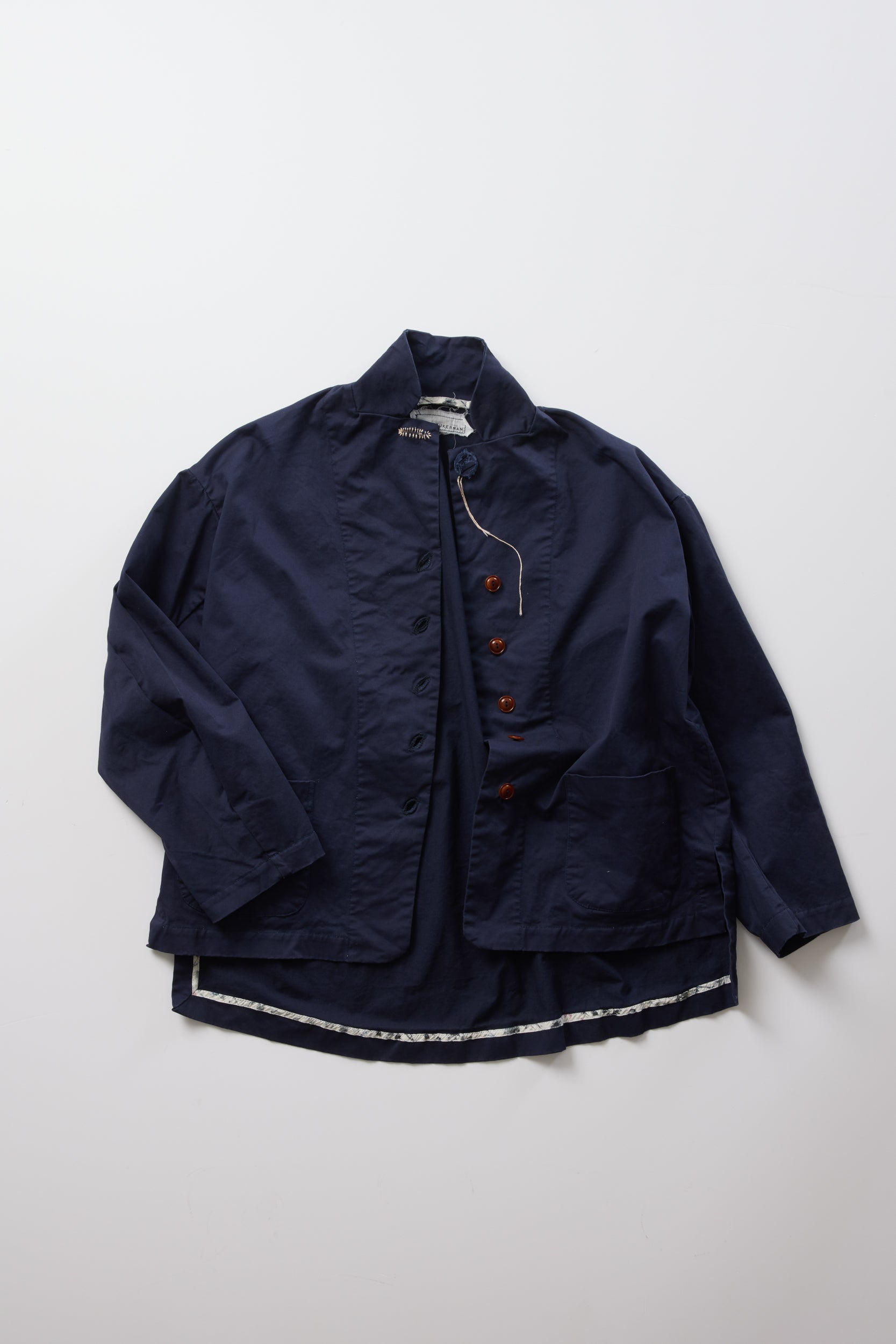 Dani jacket by Maya Zukerman. A short, light-weight cotton jacket. Relaxed fit with dropped shoulders, a shorter front side and an upright collar. Features Corozo button closure, floral inside ribbons and hand embroidered slanted button holes. The first button is made as a flower by stacking layers of the material. This jacket also has Side slits and two front patch pockets. suited especially for the hot summer days and chilly spring nights of Tel-Aviv.