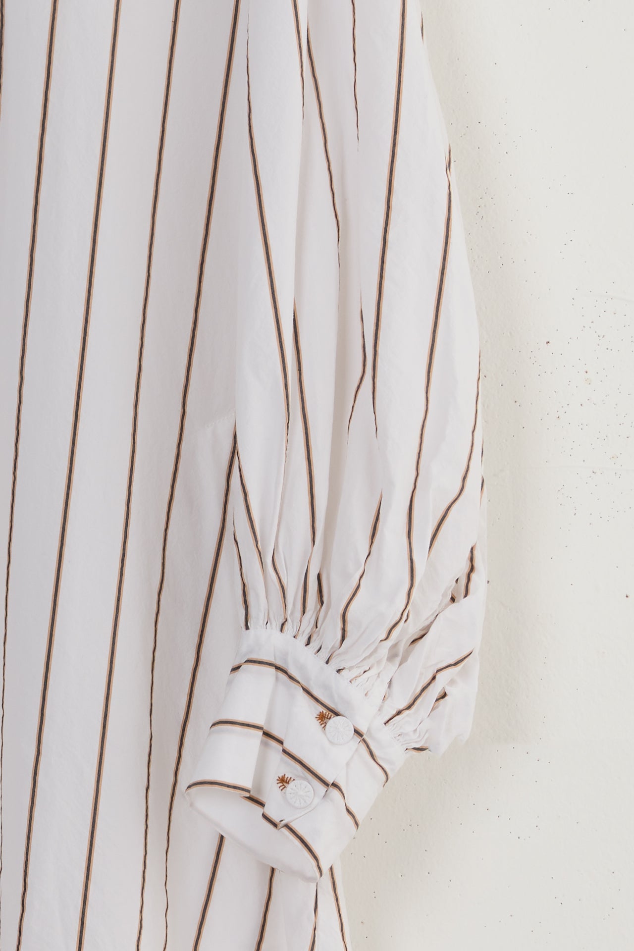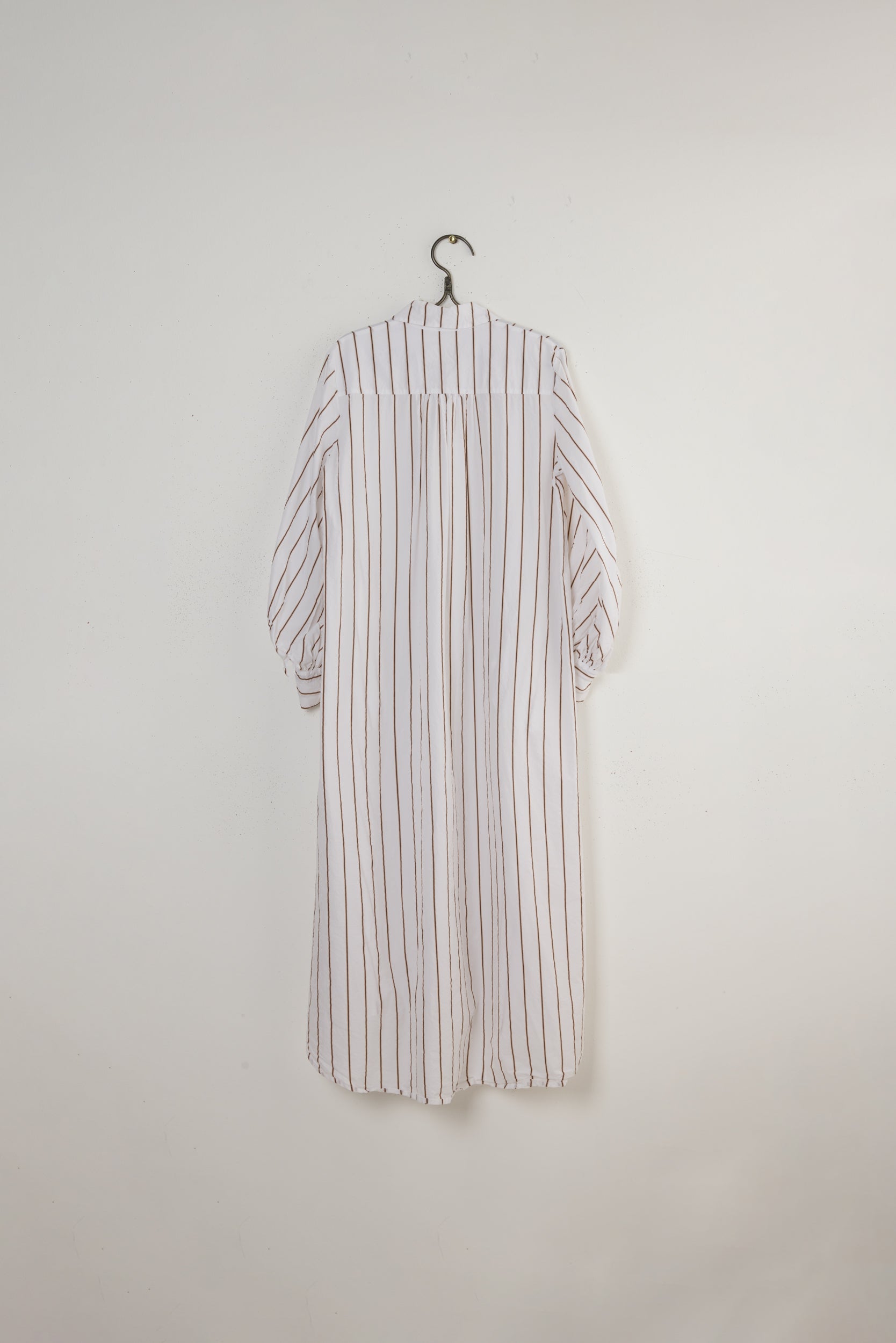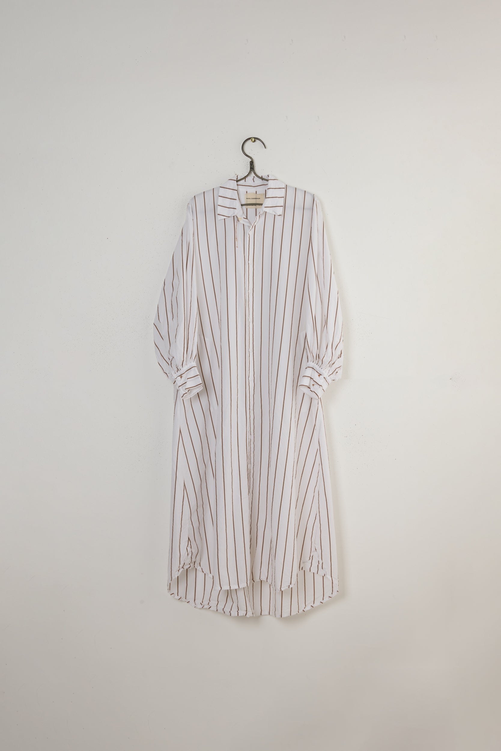 Daniella dress by Maya Zukerman. A full length shirt dress made of Japanese paper cotton. A-shaped silhouette Finished with a rounded hem and closed side slits. Gathered bell sleeves and button closure that are sewn with hand dyed Dorset buttons and hand embroidered button holes. Middle stitch button hole detail with the first button that is made as a flower by stacking layers of the material. Composed of Japanese natural fabrics, our in-house brand “Maya Zukerman”, based in Tel Aviv, focuses on natural materials, fine detailing and clean-cut comfortable clothing while preserving an environmental, “slow” approach to fashion.