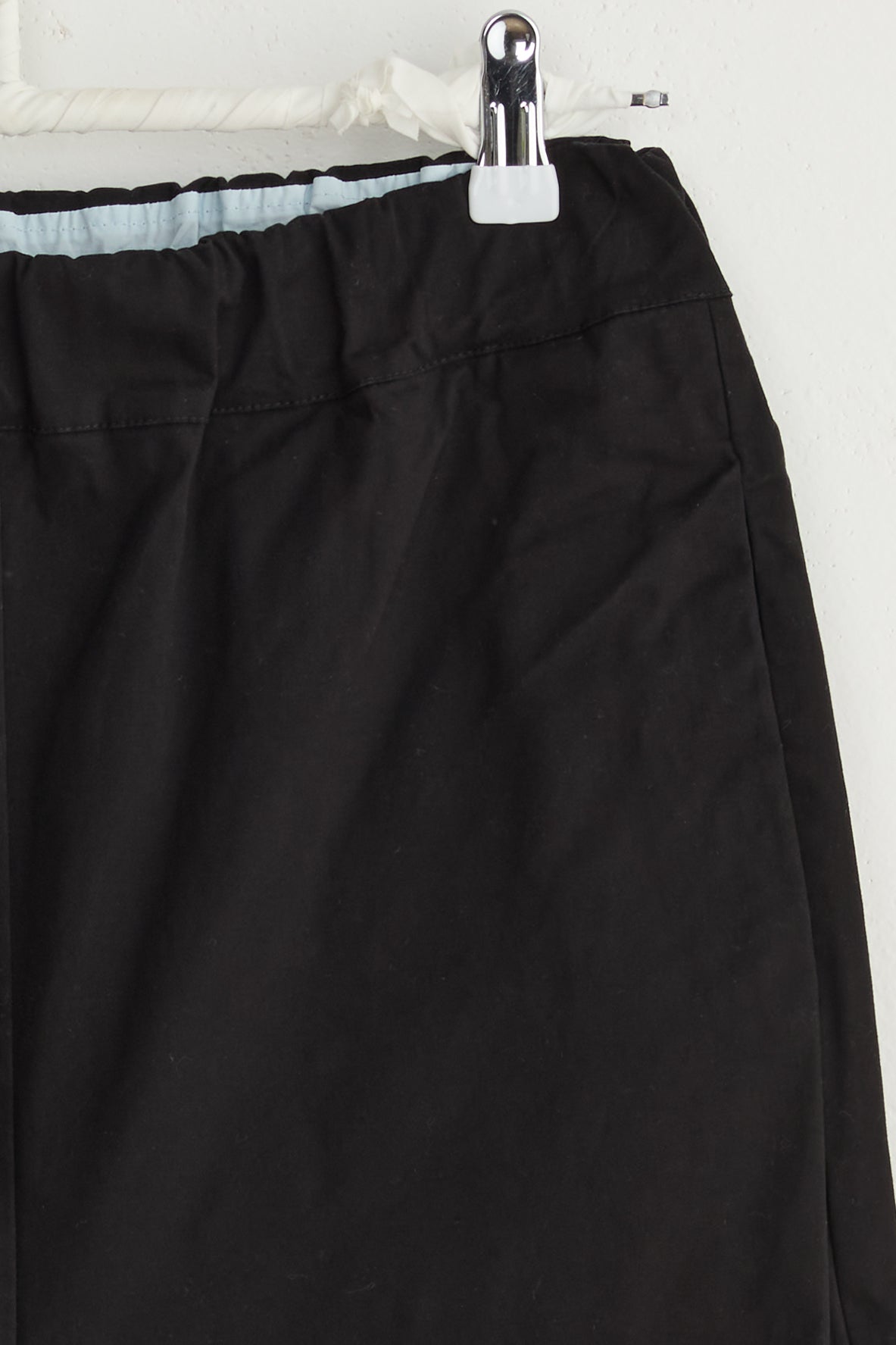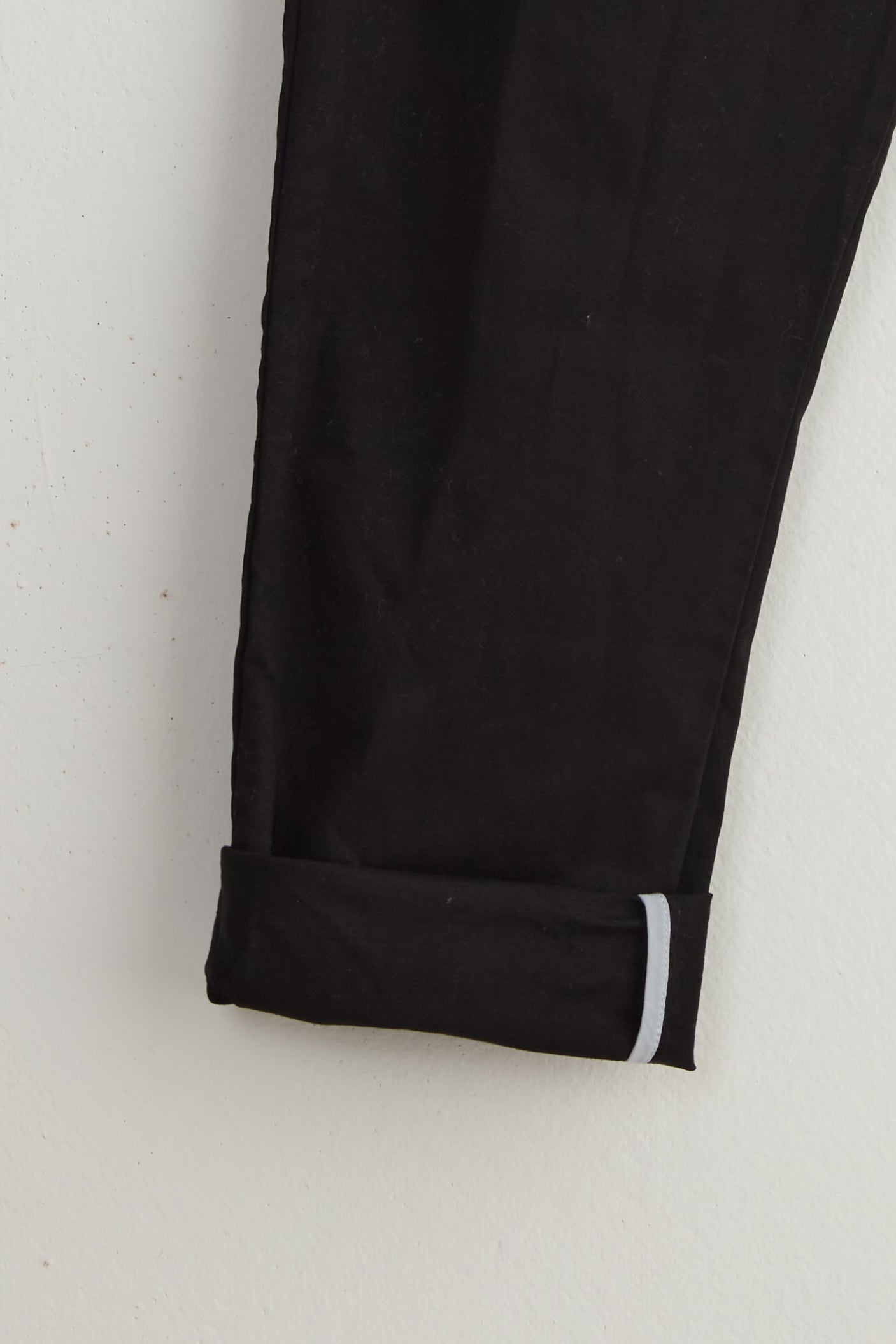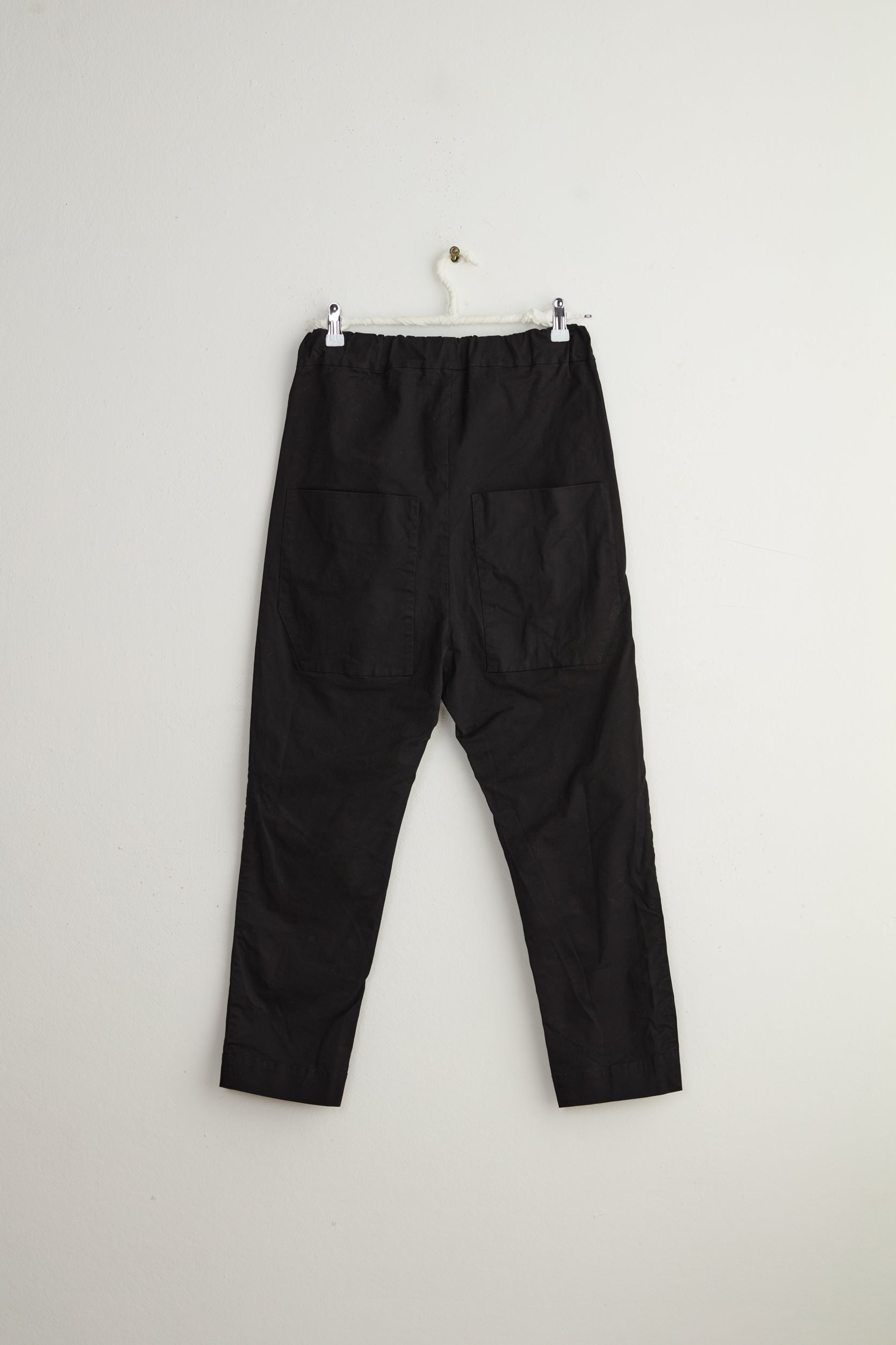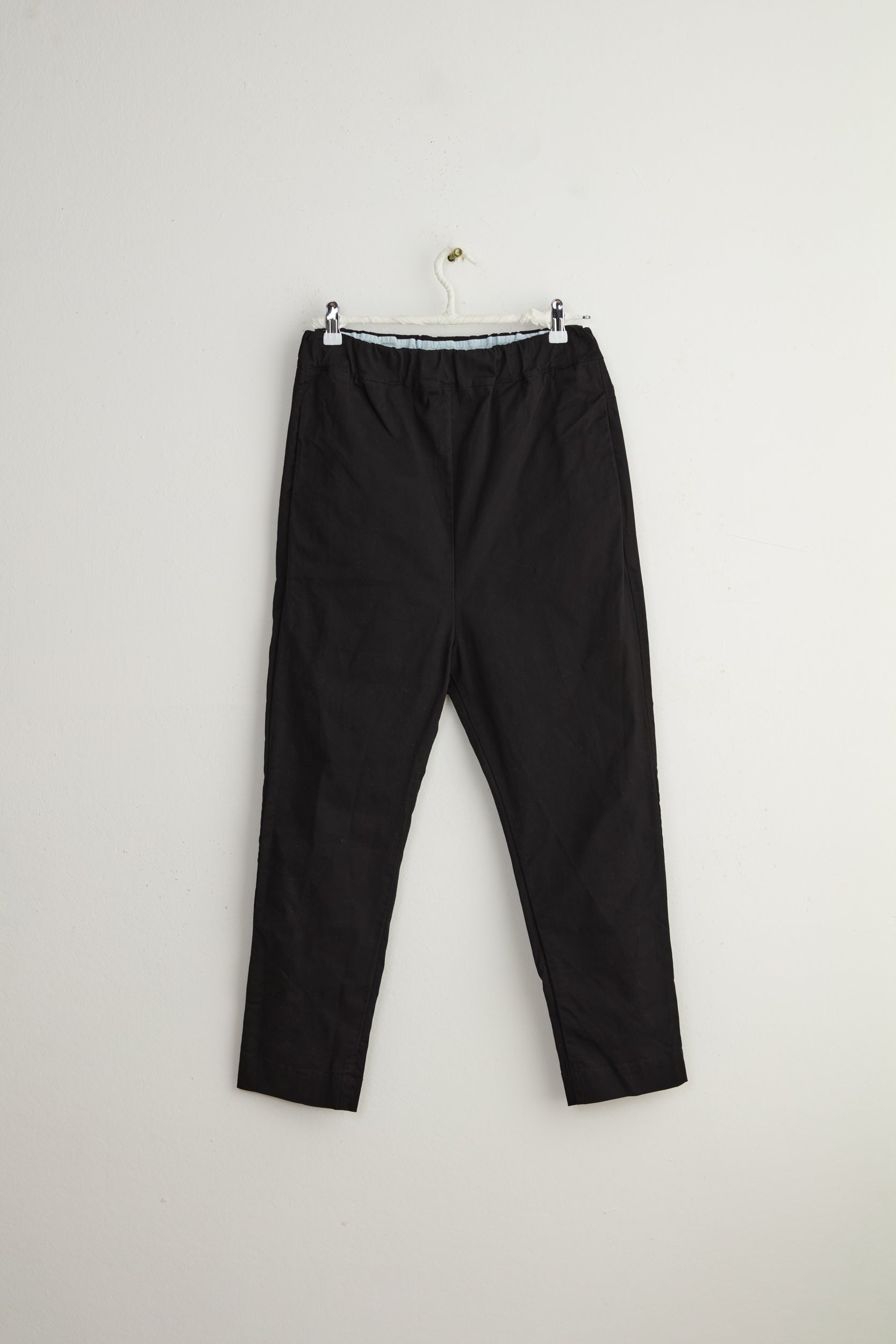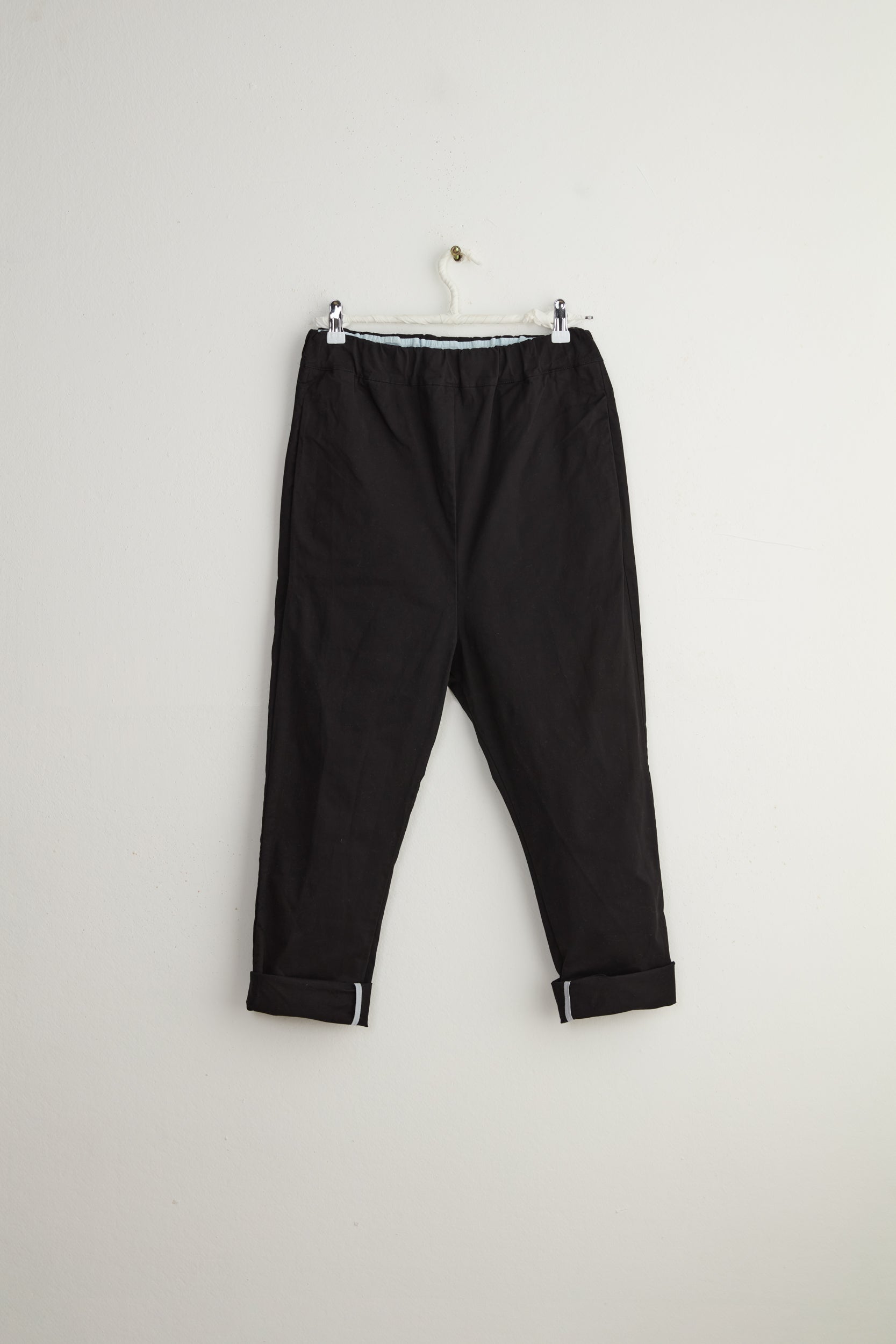 Dos pants by Maya Zukerman. Slim legged mid-high rise pants with a low crotch. A subtle twist on classic slim leg pants. Made of mid-weight soft cotton drill, Featuring the signature Maya Zukerman square pockets in addition to hidden side pockets. Fitted with an elastic waistband and a colorful inner finish that can be seen if the hem folded.