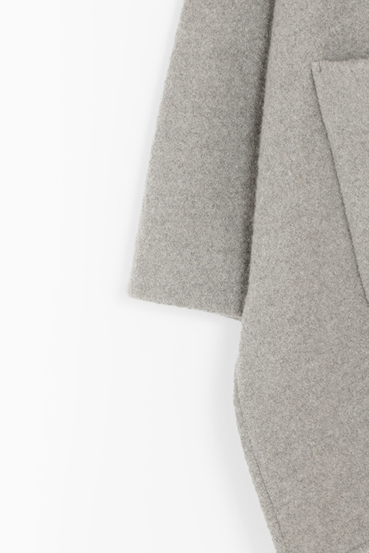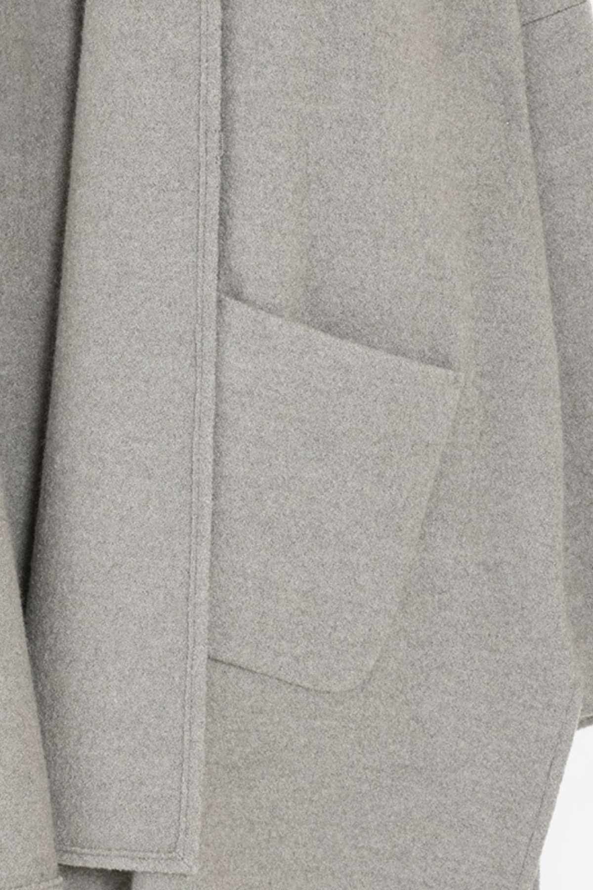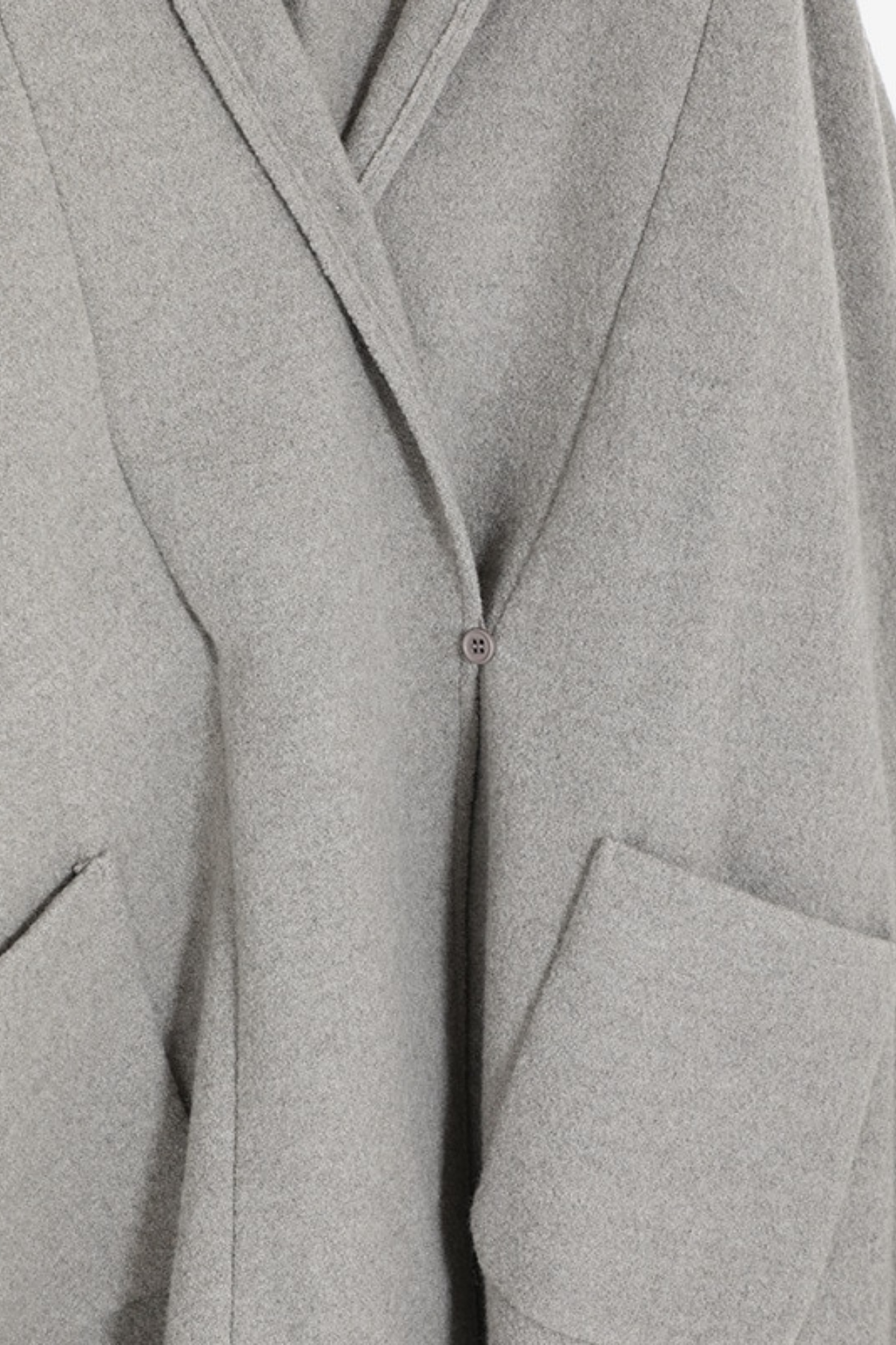 Press wool robe by Evam Eva. A relaxed-fitting robe, that can be worn as a light jacket, made from pressed soft wool. Relaxed fit with a kimono like neck line, two front patch pockets, deep side slits and one button for front closure. size - Length 75 | Shoulder width 74 | Bust 74 | Hem circumference 148