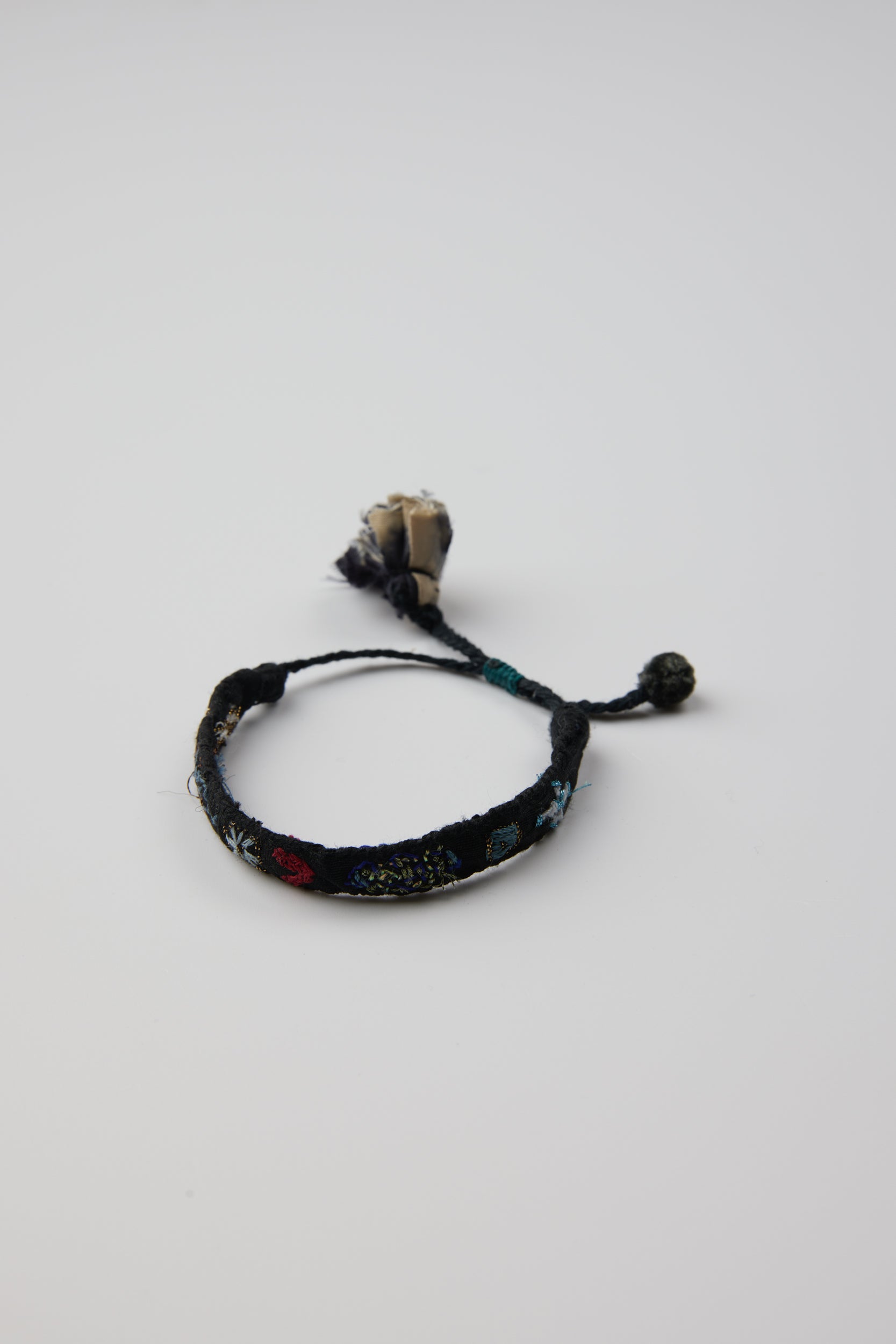 Embroidered bracelet by Antomoon. One of a kind, hand embroidered colorful bracelets made from hand dyed recycled silk from a sari. Embroidered with lovely little characters and motifs. Adjustable strap with a flower-like finish.