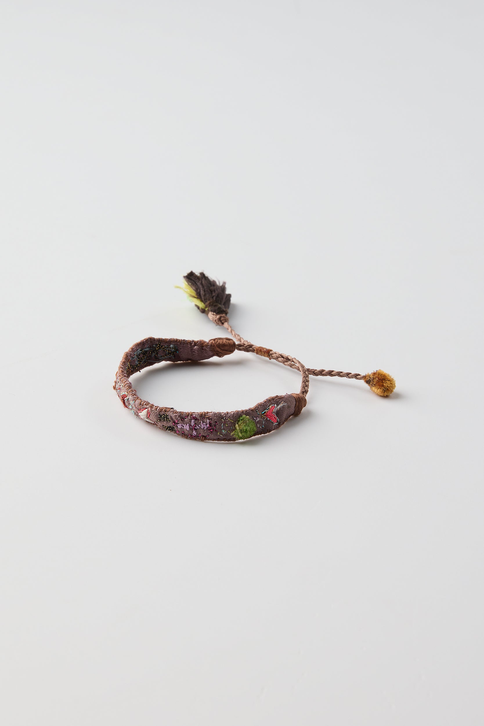 Embroidered bracelet by Antomoon. One of a kind, hand embroidered colorful bracelets made from hand dyed recycled silk from a sari. Embroidered with lovely little characters and motifs. Adjustable strap with a flower-like finish.