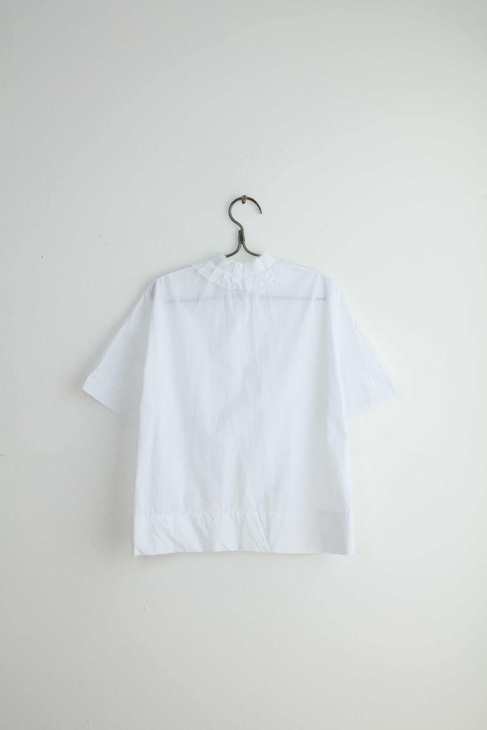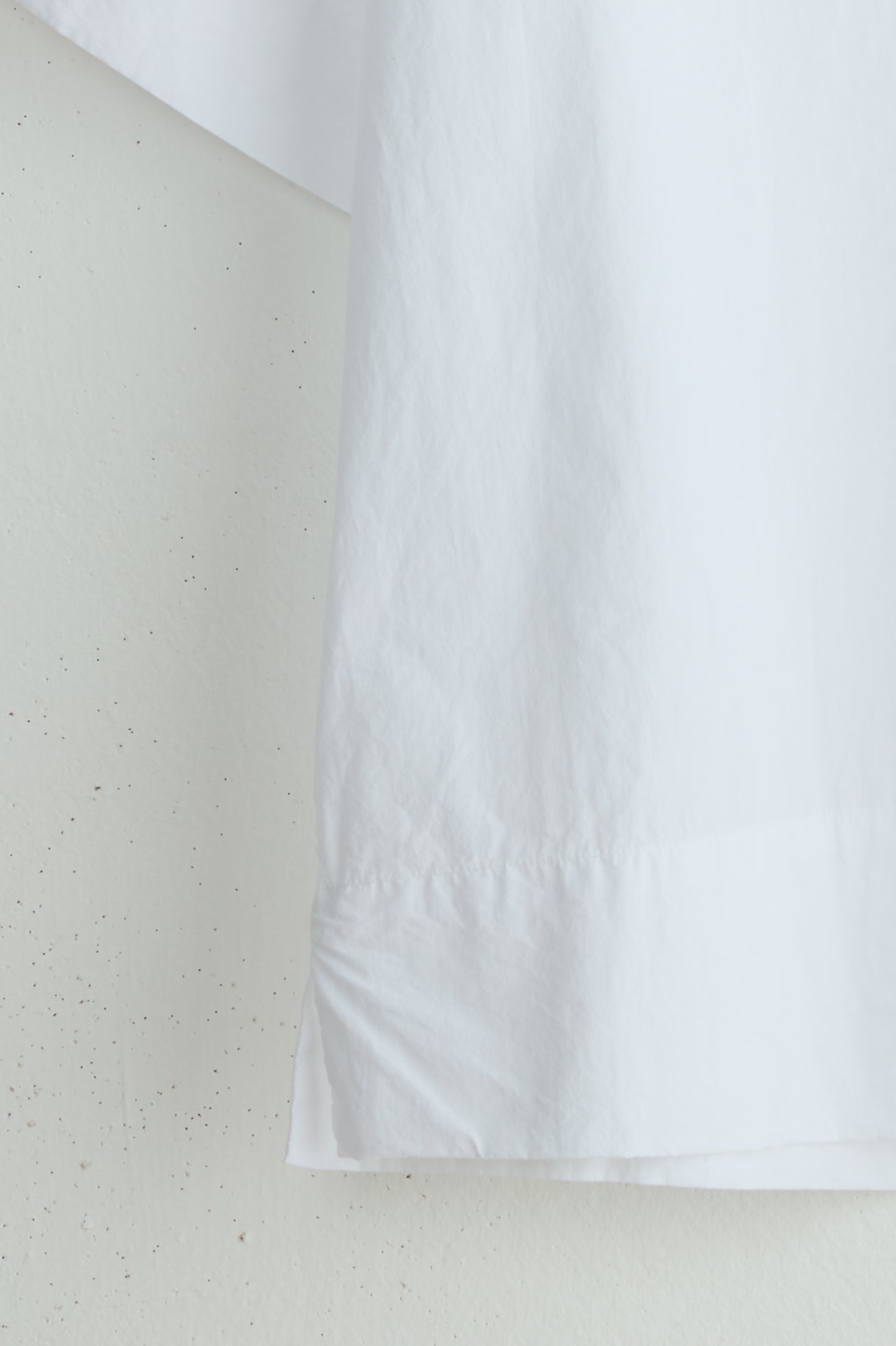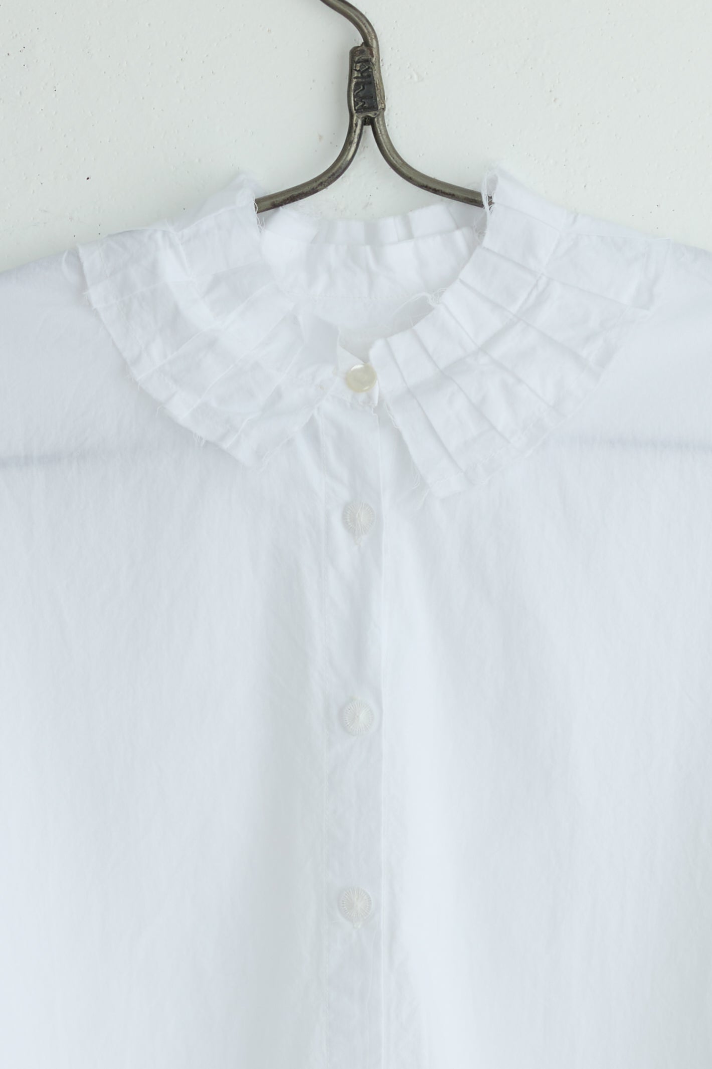 Emily shirt by Maya Zukerman. An elegant collared blouse made from crisp Japanese paper cotton. A relaxed silhouette with mid-length notched sleeves, dropped shoulders, side slits and a beautiful pleated floating collar with raw edges.