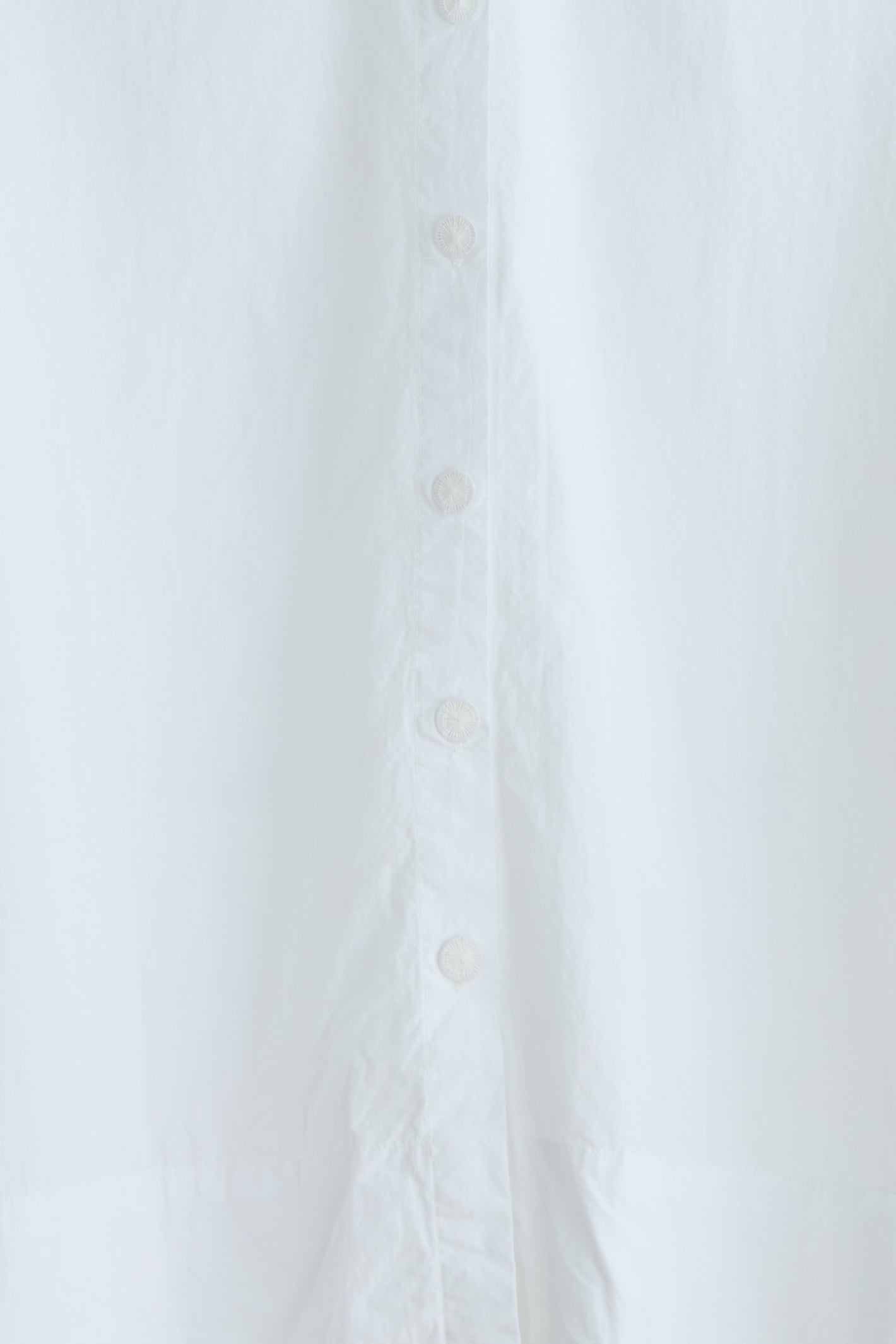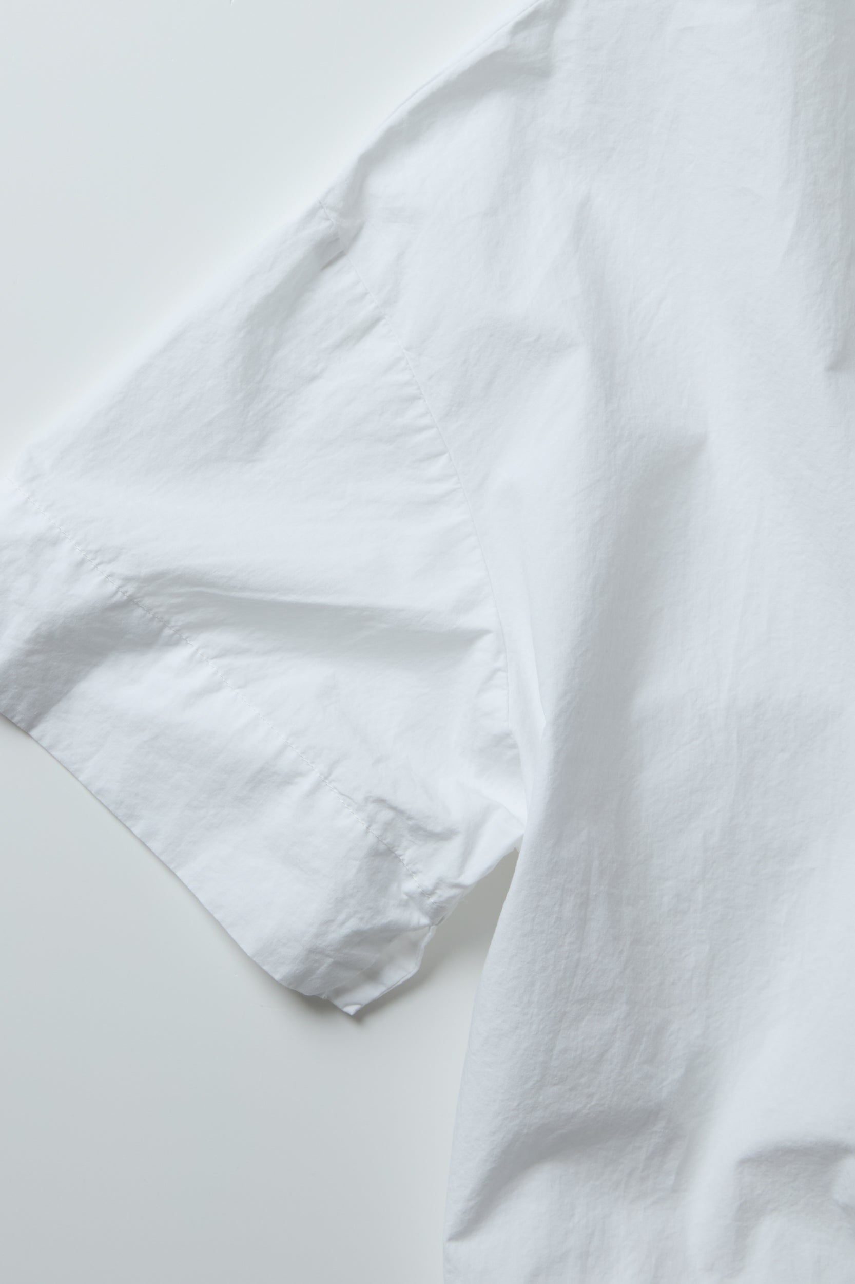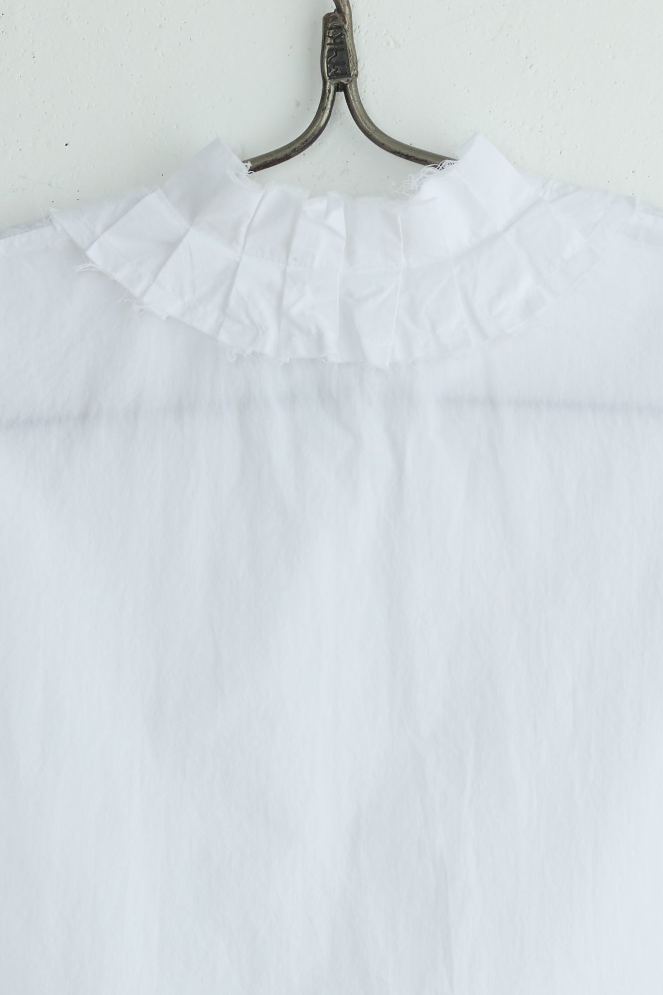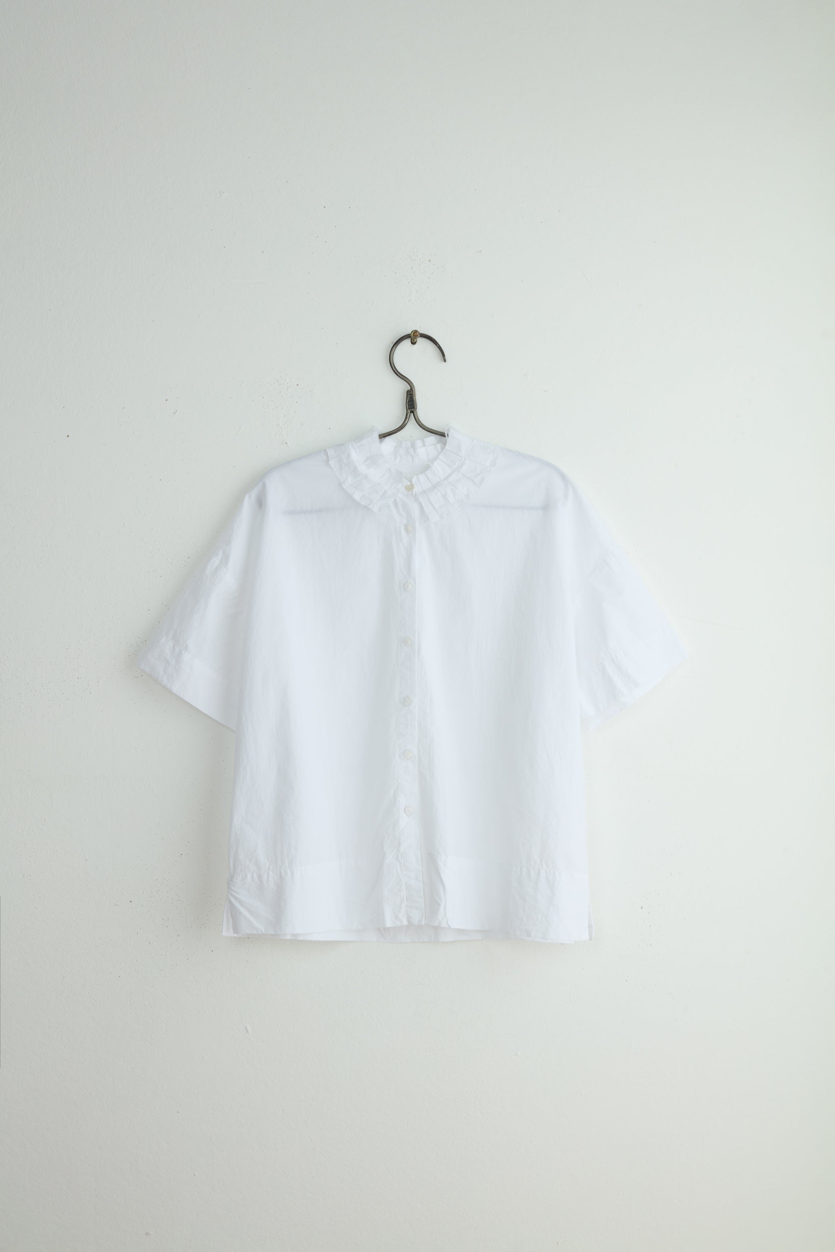 Emily shirt by Maya Zukerman. An elegant collared blouse made from crisp Japanese paper cotton. A relaxed silhouette with mid-length notched sleeves, dropped shoulders, side slits and a beautiful pleated floating collar with raw edges.