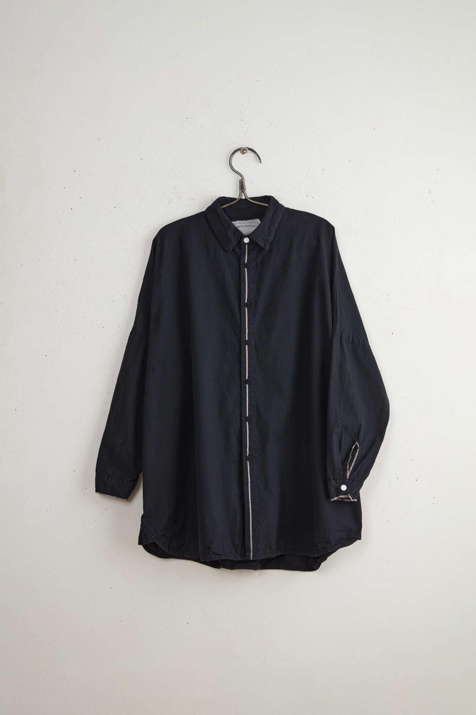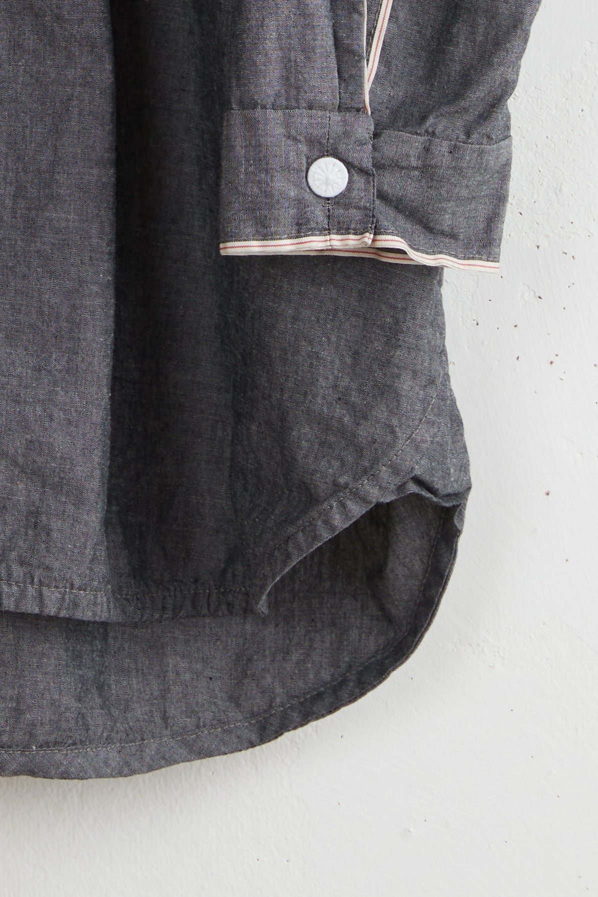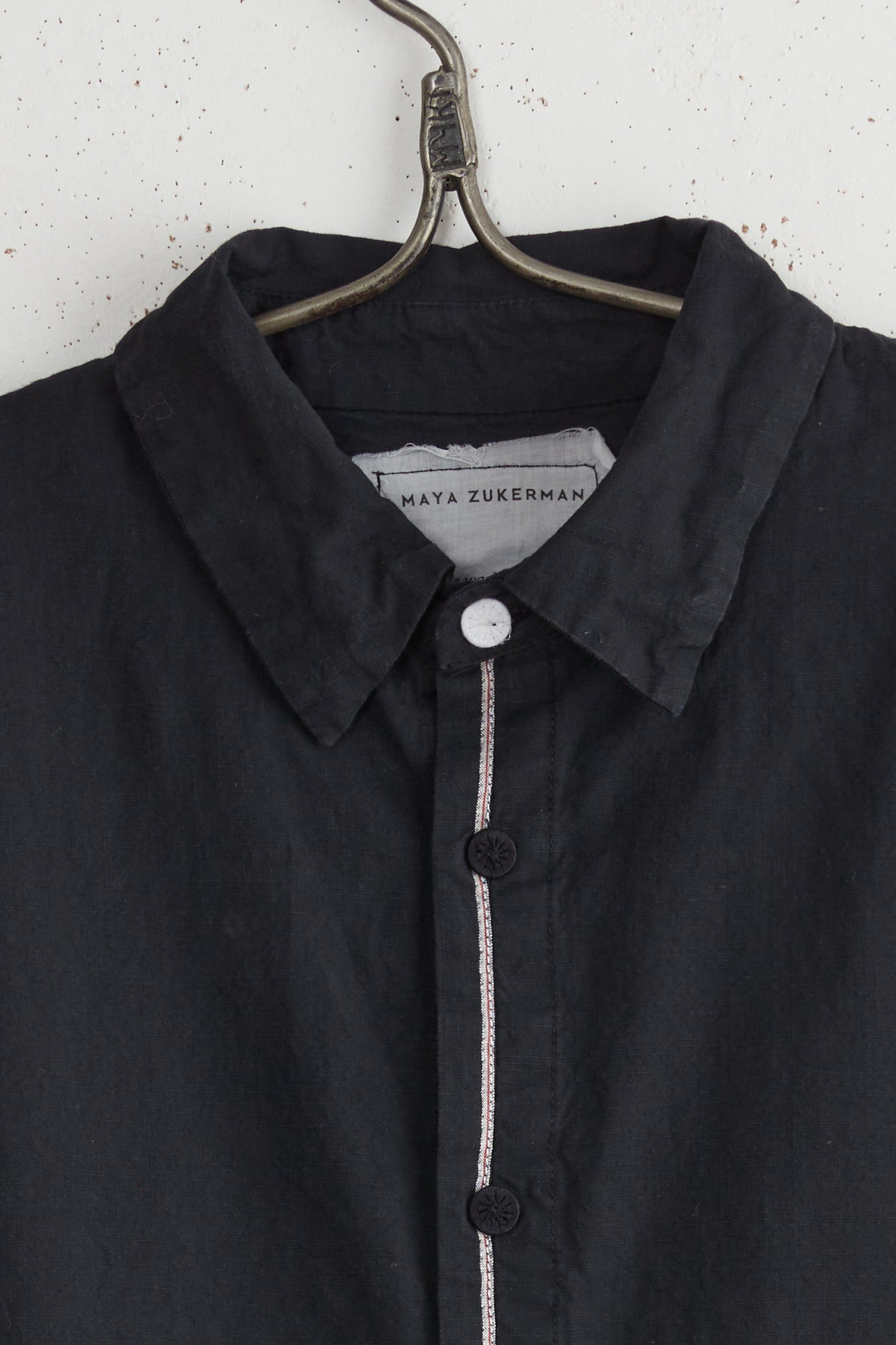 The Evelyn salvage shirt by Maya Zukerman is a light oversized collared shirt made of 100% Japanese cotton. hand dyed Dorset button closure and a middle stitch button hole detail. Salvage running along the button line and cuffs. boyfriend fit, dropped shoulder slightly shorter on the front, finished with a rounded hem, closed side slits and round cuff slits with button closure.