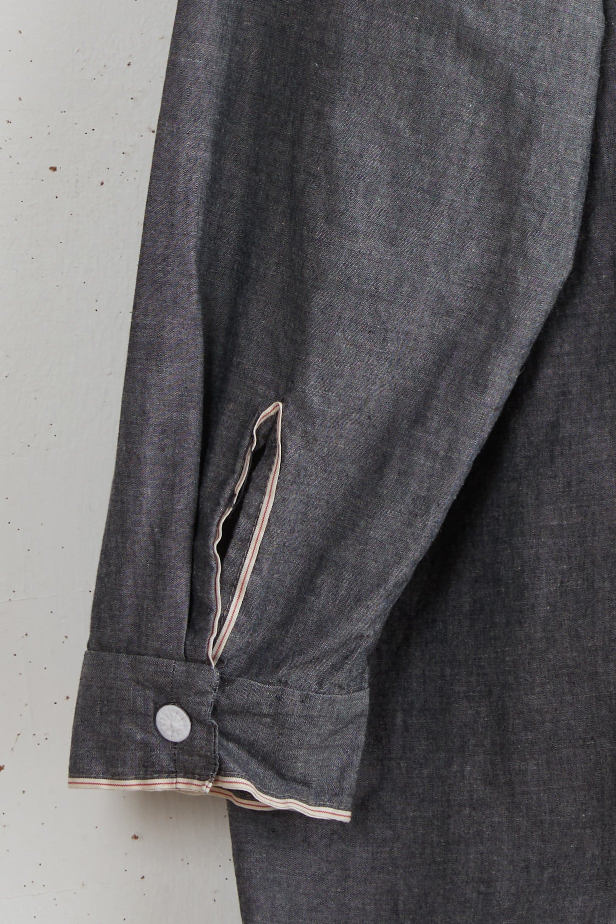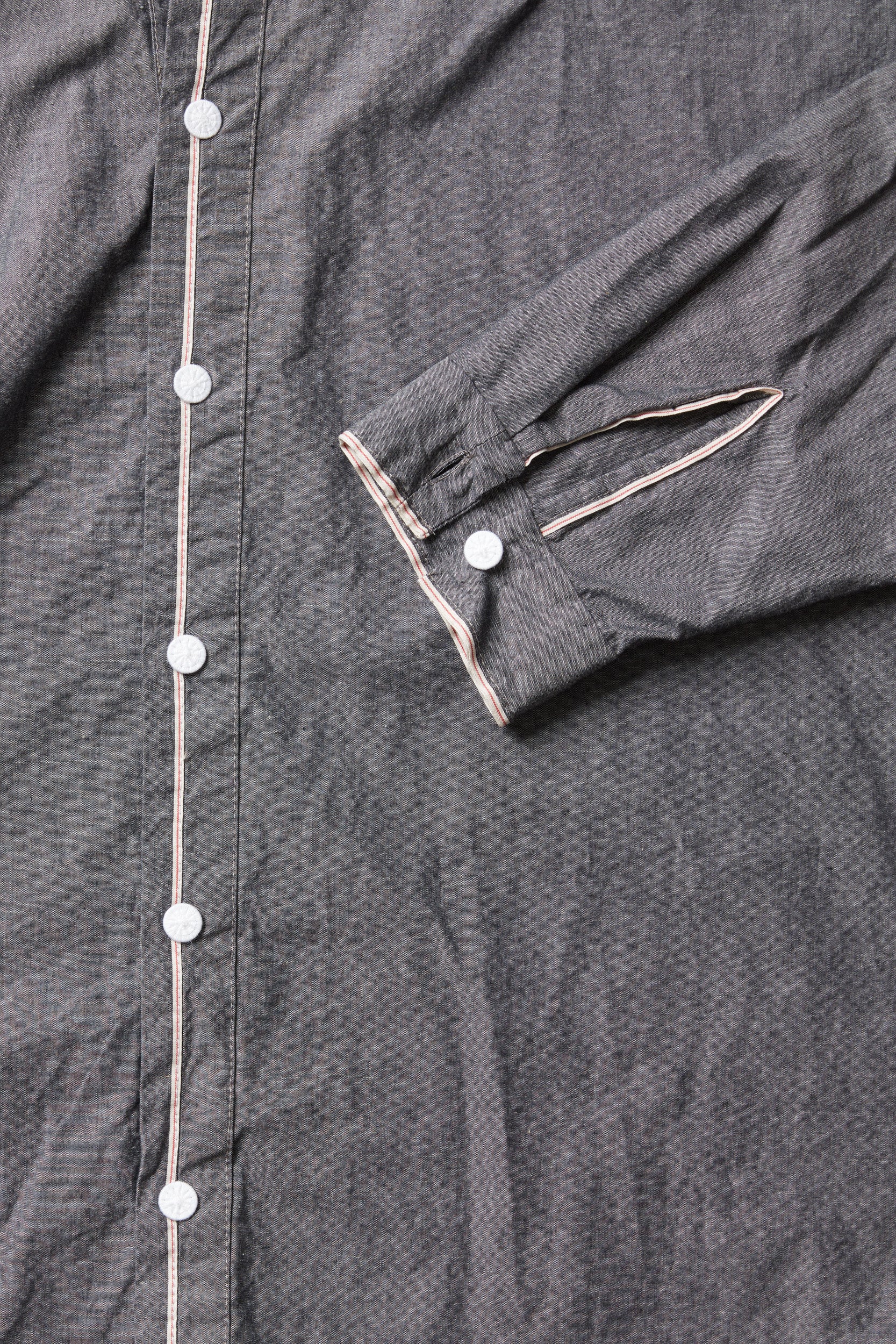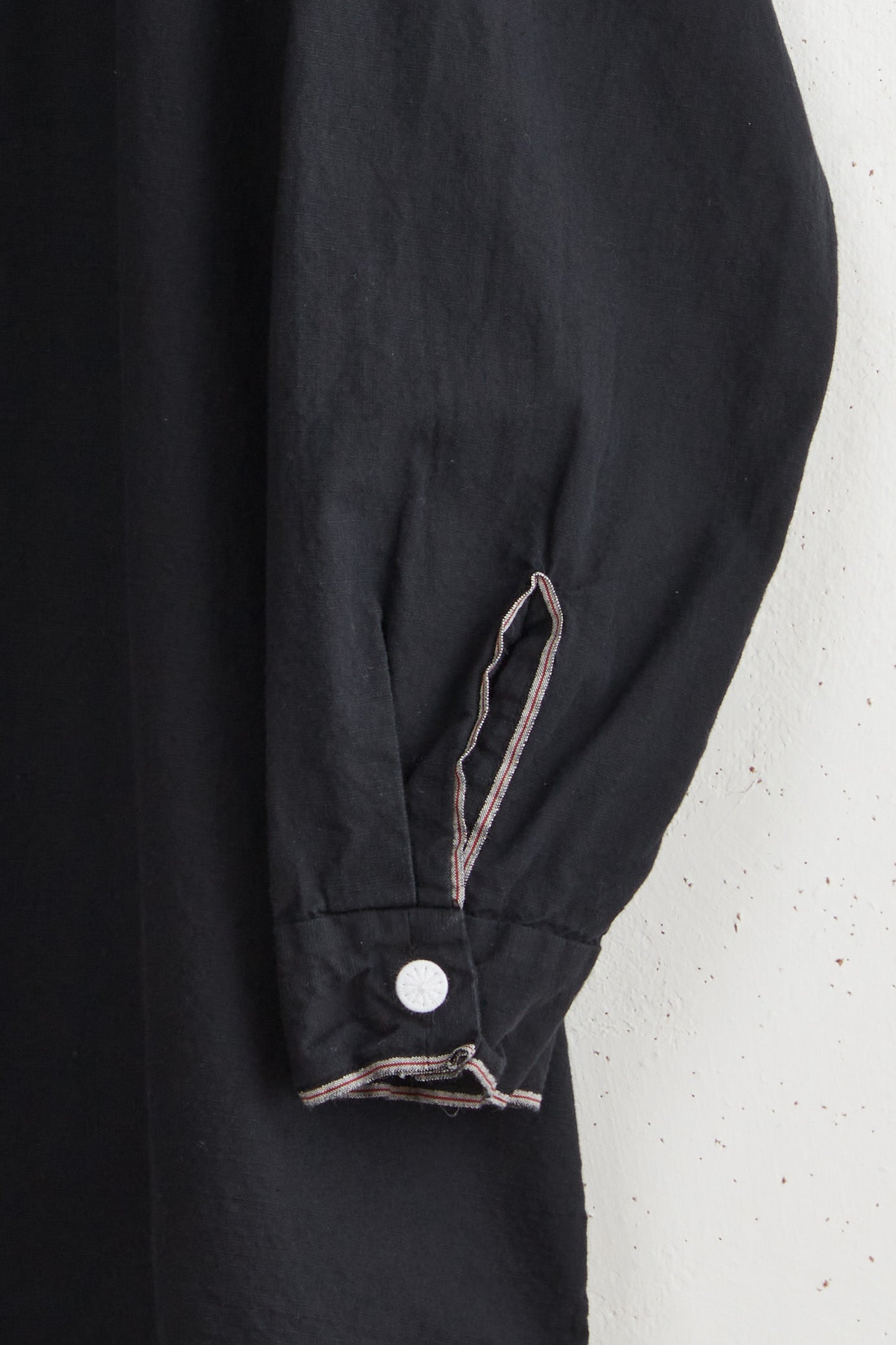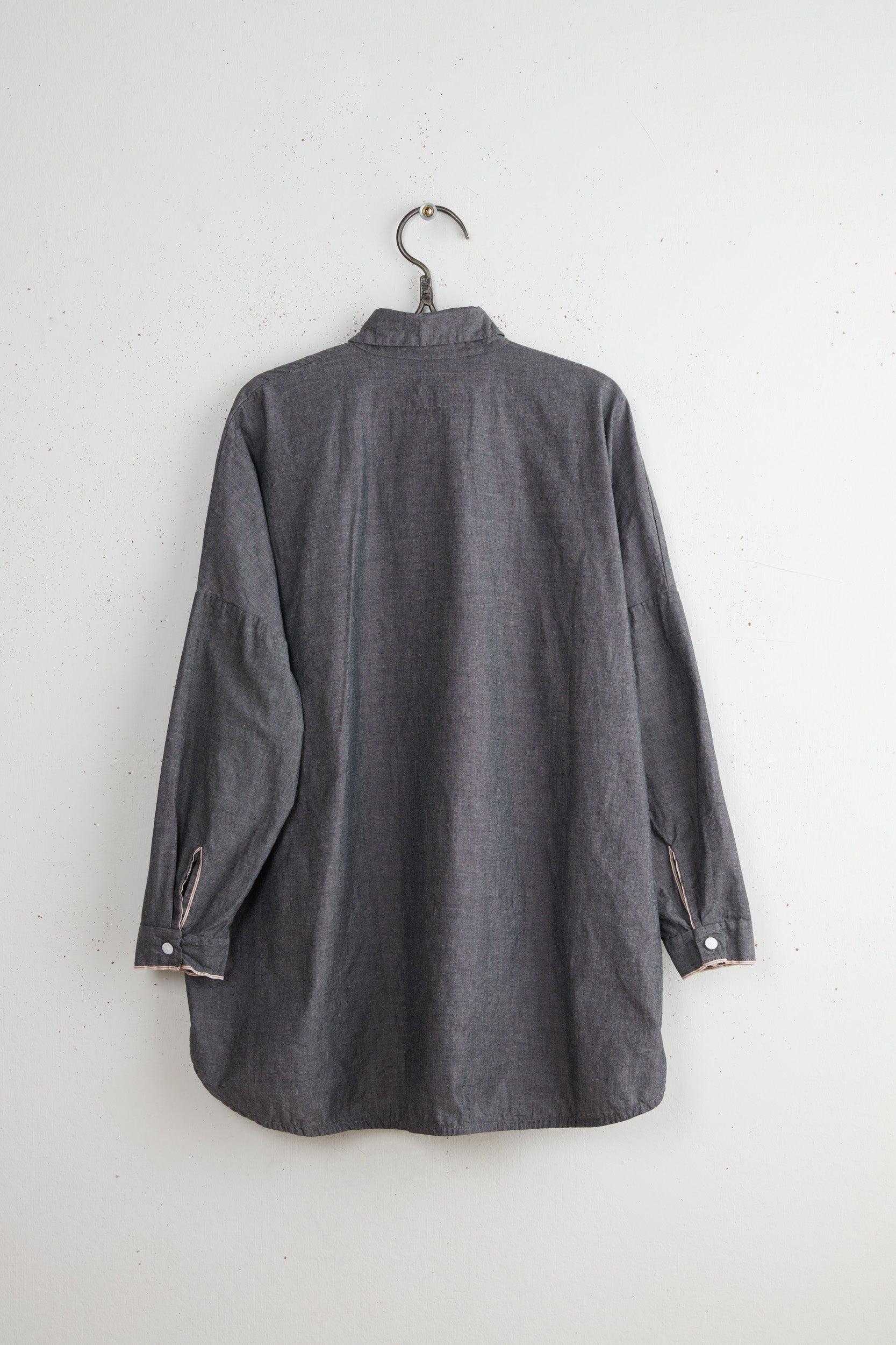 The Evelyn salvage shirt by Maya Zukerman is a light oversized collared shirt made of 100% Japanese cotton. hand dyed Dorset button closure and a middle stitch button hole detail. Salvage running along the button line and cuffs. boyfriend fit, dropped shoulder slightly shorter on the front, finished with a rounded hem, closed side slits and round cuff slits with button closure.