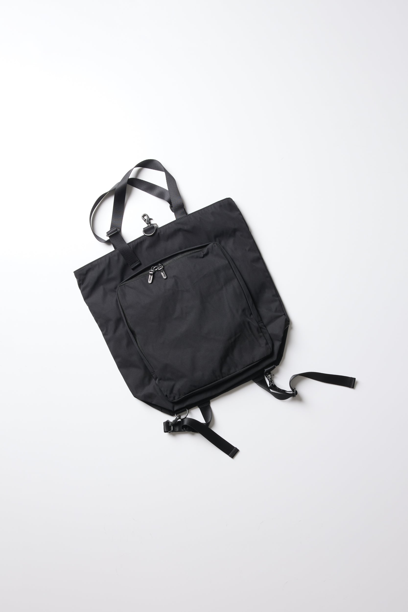 Gabardine 2Way Backpack by AMIACALVA. A practical, ligthweight backpack that can be worn as a tote or a backpack made from smooth, durable, and water-resistant gabardine. - the straps are cushioned and adjustable and can be tucked in when not in use. It has a roomy interior pockets, a drawstring closure at the top with a tonal metal trigger clip, double webbed straps, one large exterior zip pocket, and two slip pockets on the back for stowing the backpack straps. Made in Japan.